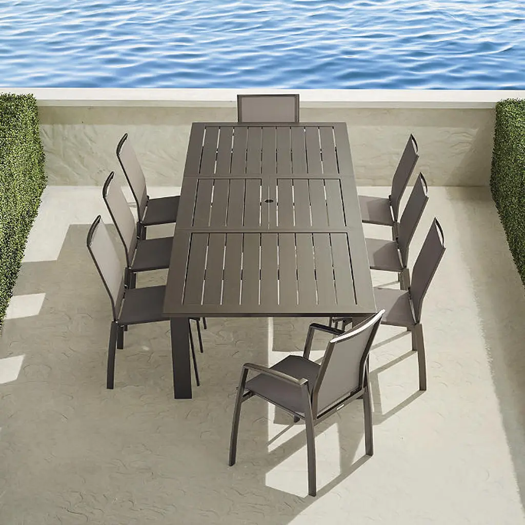 We engineered our generously scaled Resort Newport Dining Chairs to stand the test of time – and comfort. The sleek, powdercoated frame is made of 100% aluminum, which is both strong and substantial while also lightweight. The seamless, premium-quality mesh sling is supportive yet giving and allows air to circulate to keep you cool while you dine. Extendable Dining Table can seat up to 10 guests with ease.Part of the Frontgate Resort Collection™.Newport 9-pc. Extendable Dining Set in Aluminum (182597): Includes dining table, six side chairs and two arm chairsDurable yet lightweight aluminum frame is finished with a protective powdercoat to resist the elementsQuick-drying, flexible mesh sling seatStacks for easy storageView assembly instructionsDining Table comfortably seats six adults when closed, and up to 10 adults when extendedImported A Frontgate exclusive. At Frontgate, our primary focus is quality. We guarantee that every product we sell will stand up to the supreme test – our customers' satisfaction. To learn more about our policies, visit our Shipping & Processing, Returns & Exchanges and Warranty & Price Guarantee pages.We engineered our generously scaled Resort Newport Dining Chairs to stand the test of time – and comfort. The sleek, powdercoated frame is made of 100% aluminum, which is both strong and substantial while also lightweight. The seamless, premium-quality mesh sling is supportive yet giving and allows air to circulate to keep you cool while you dine. Extendable Dining Table can seat up to 10 guests with ease.Part of the Frontgate Resort Collection™.Newport 9-pc. Extendable Dining Set in Aluminum (182597): Includes dining table, six side chairs and two arm chairsDurable yet lightweight aluminum frame is finished with a protective powdercoat to resist the elementsQuick-drying, flexible mesh sling seatStacks for easy storageView assembly instructionsDining Table comfortably seats six adults when closed, and up to 10 adults when extendedImported A Frontgate exclusive. At Frontgate, our primary focus is quality. We guarantee that every product we sell will stand up to the supreme test – our customers' satisfaction. To learn more about our policies, visit our Shipping & Processing, Returns & Exchanges and Warranty & Price Guarantee pages.