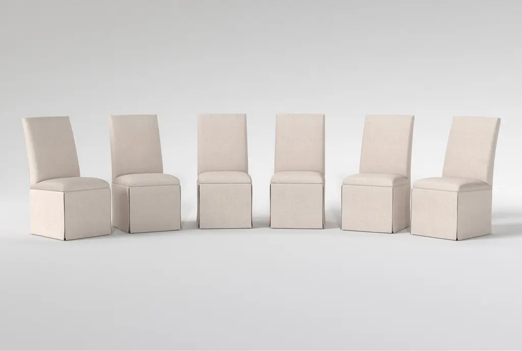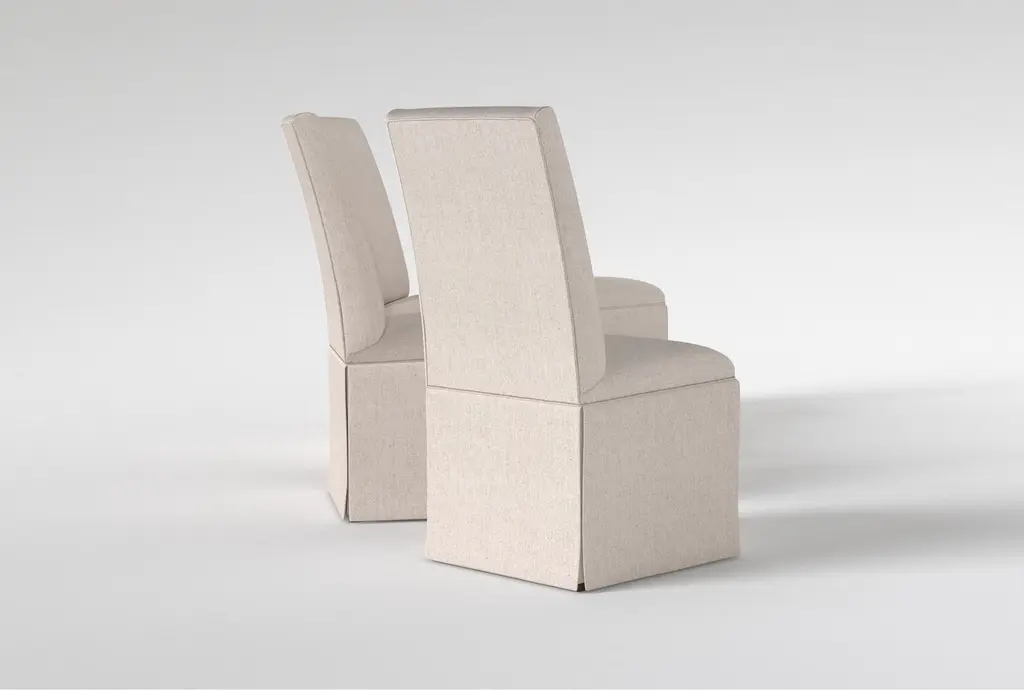 The Garten Linen Skirted With Back Dining Chair Set Of 4 is perfect for enhancing your dining experience. Designed in a traditional style, this set features a soft, neutral off-white fabric that complements any dining room decor. Made with 100% polyester and Malaysian hardwood, these chairs are both durable and comfortable.