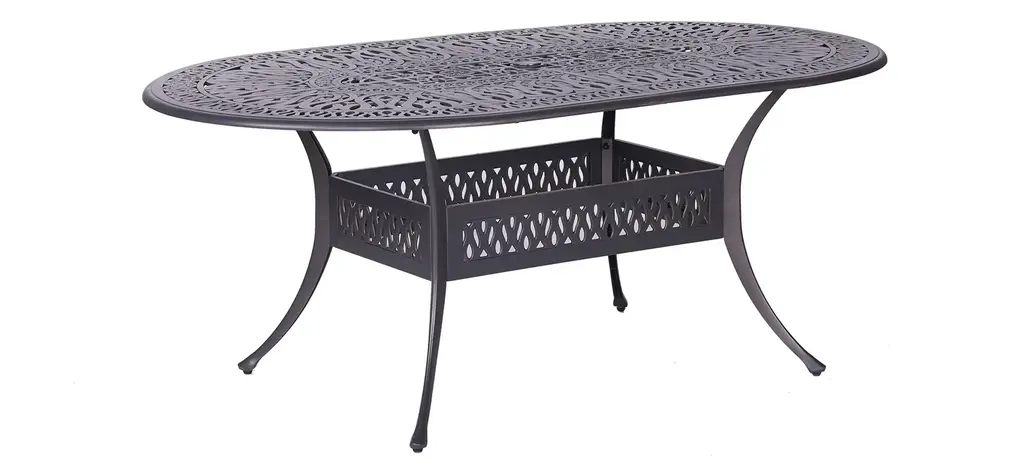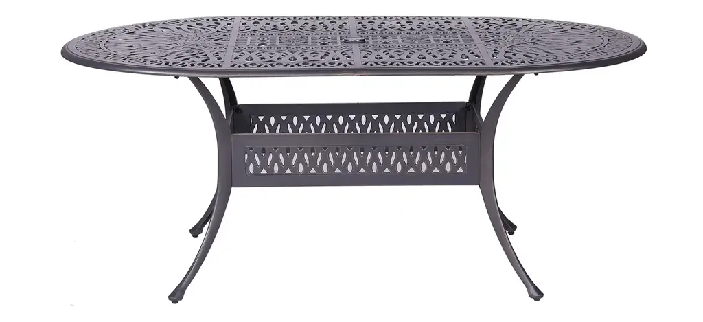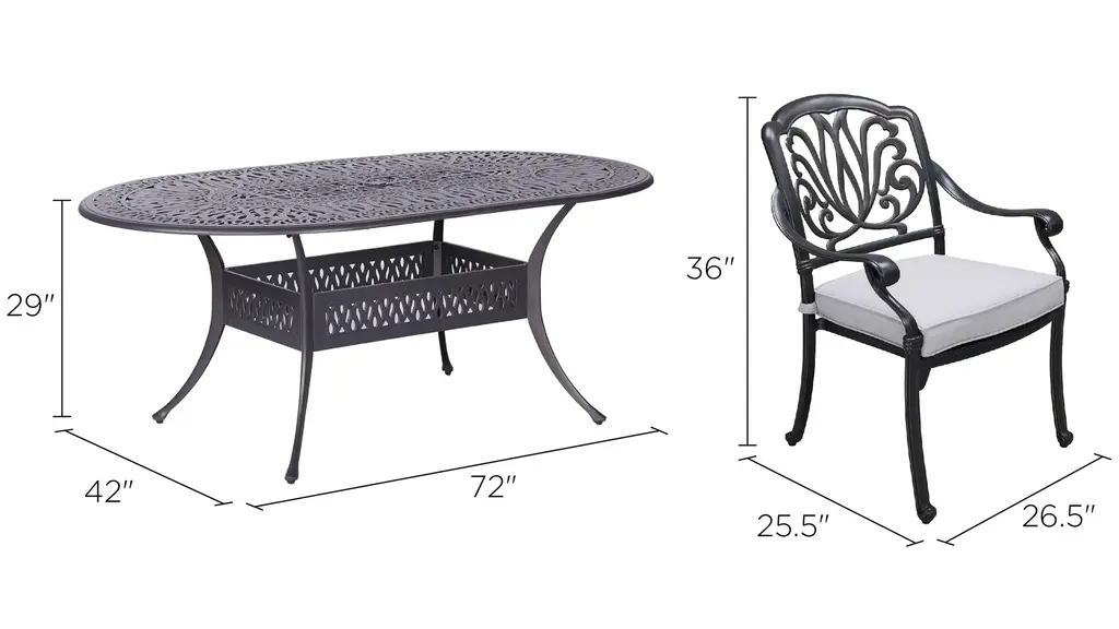 Geneva 7-pc. outdoor dining set features a unique and graceful oval table. It includes 6 standard cushioned dining chairs making it a fantastically midsized set that will accommodate a variety of occasions. Solid, durable, and beautiful, this set is up to standard.