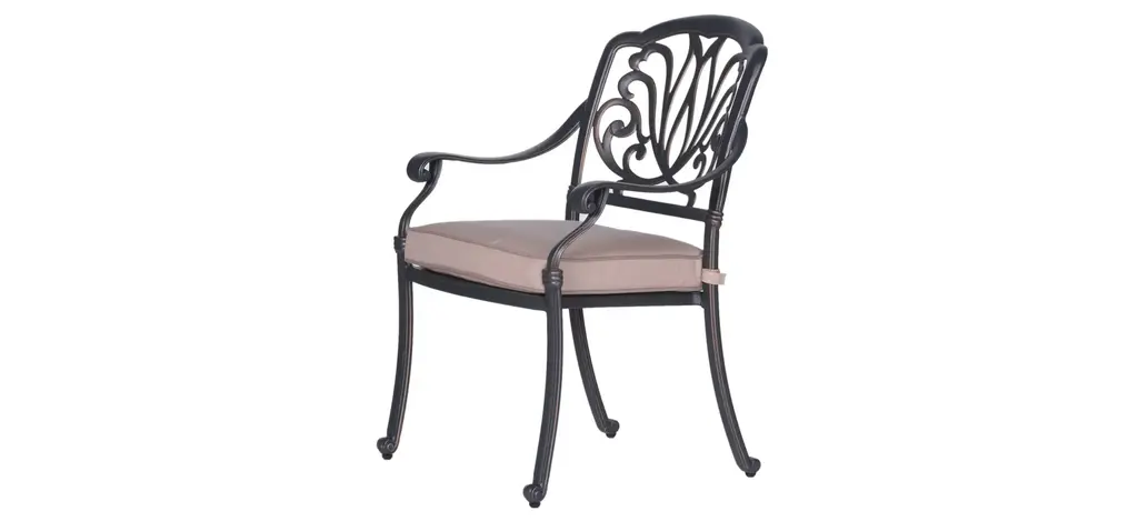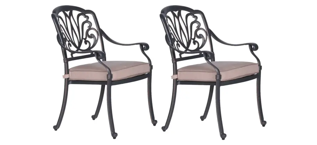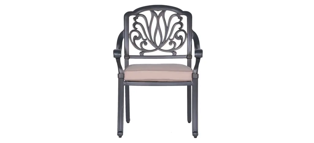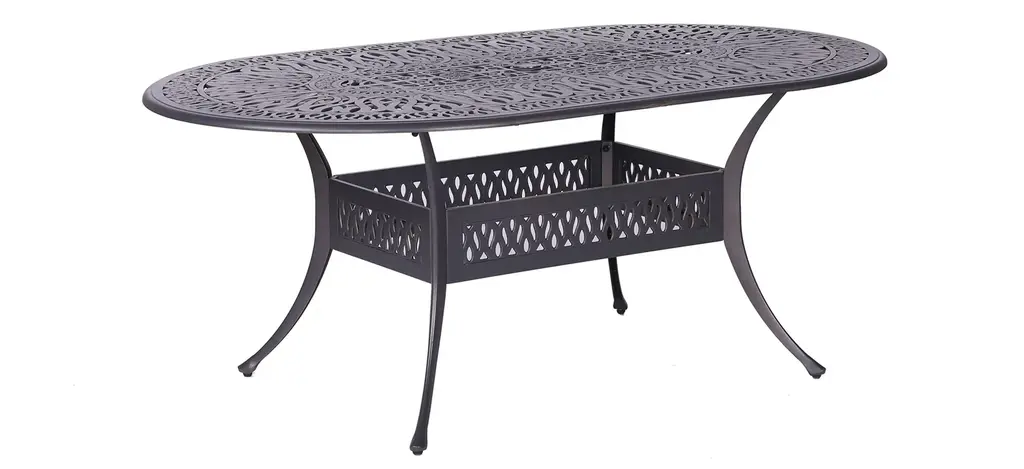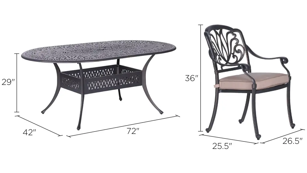 Geneva 7-pc. outdoor dining set features a unique and graceful oval table. It includes 6 standard cushioned dining chairs making it a fantastically midsized set that will accommodate a variety of occasions. Solid, durable, and beautiful, this set is up to standard.