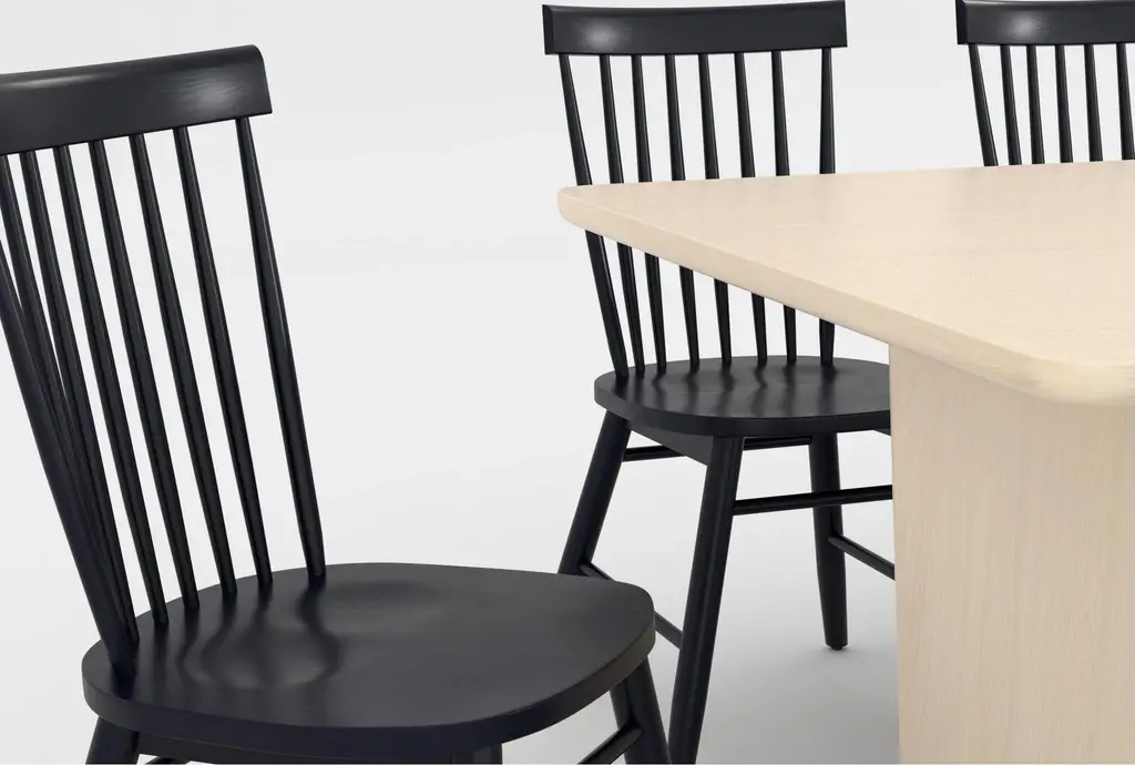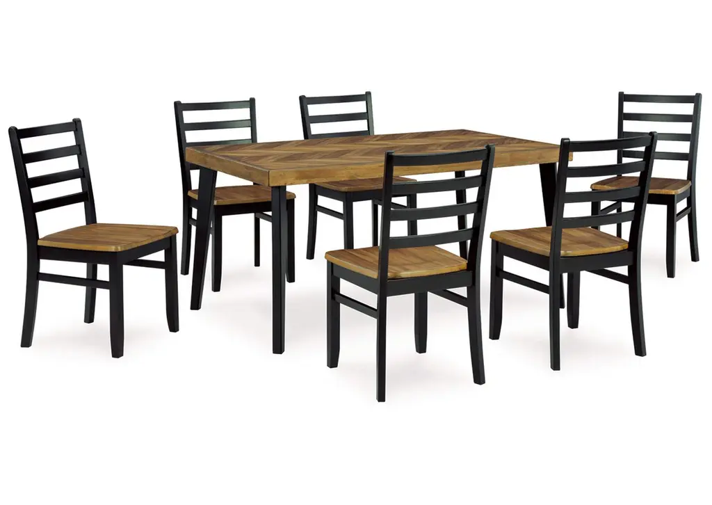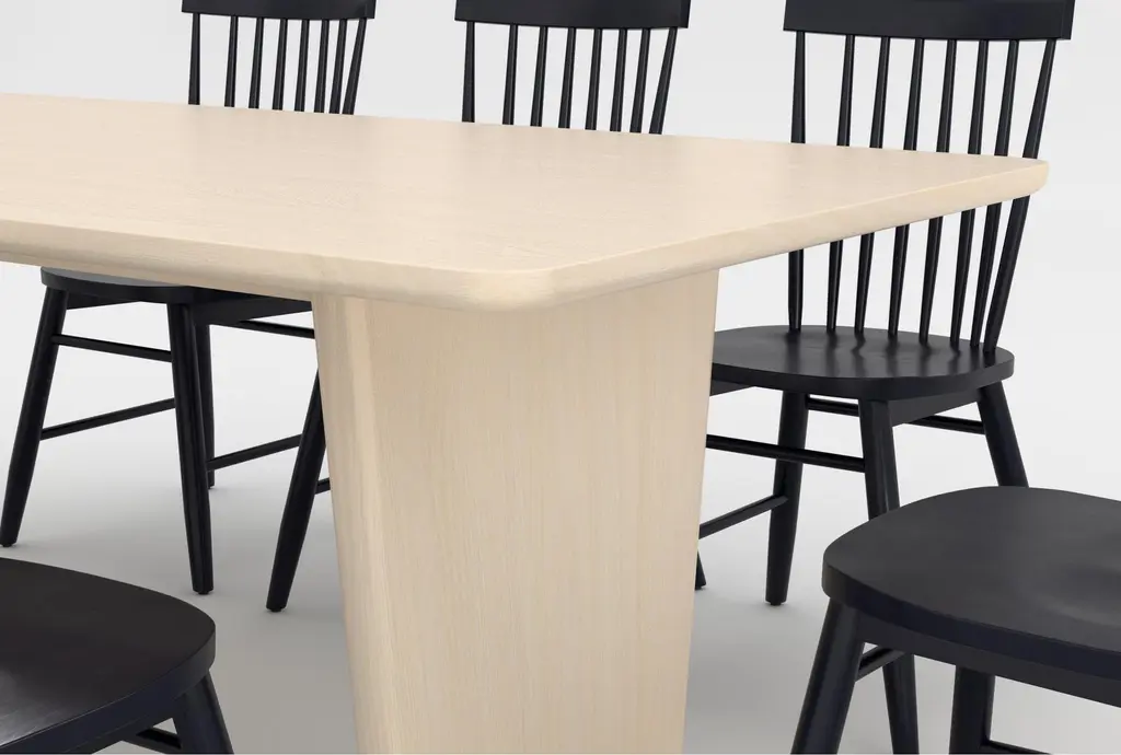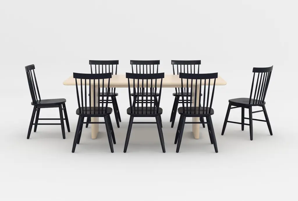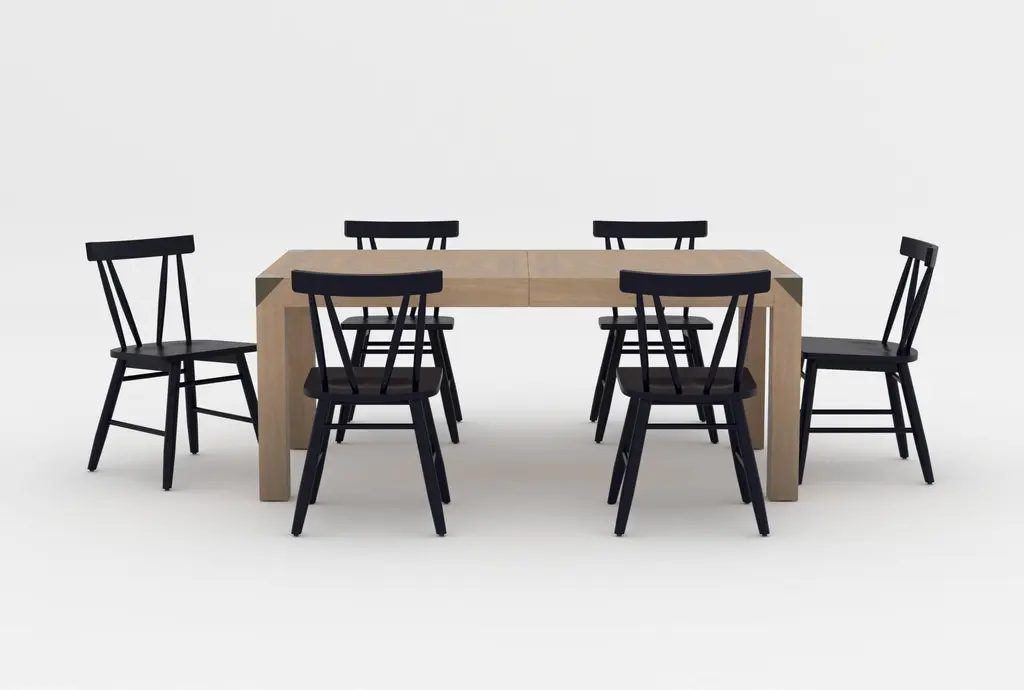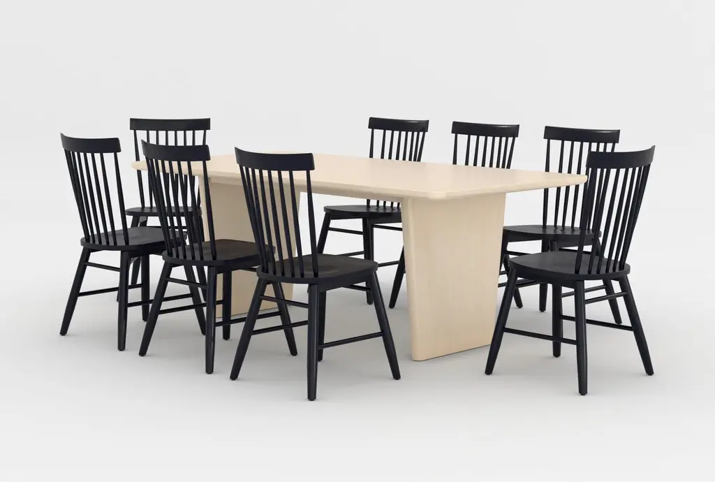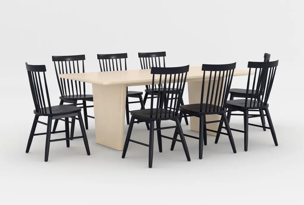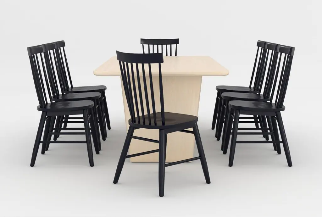 The Georgiana Natural Rectangular Dining Set with Renn Black Side Chairs offers a stylish and modern addition to your dining room. This set combines a white sand veneer table with sleek black side chairs, creating a striking contrast that enhances any dining space. Designed for seating up to eight guests, it provides ample space for family dinners or entertaining friends.