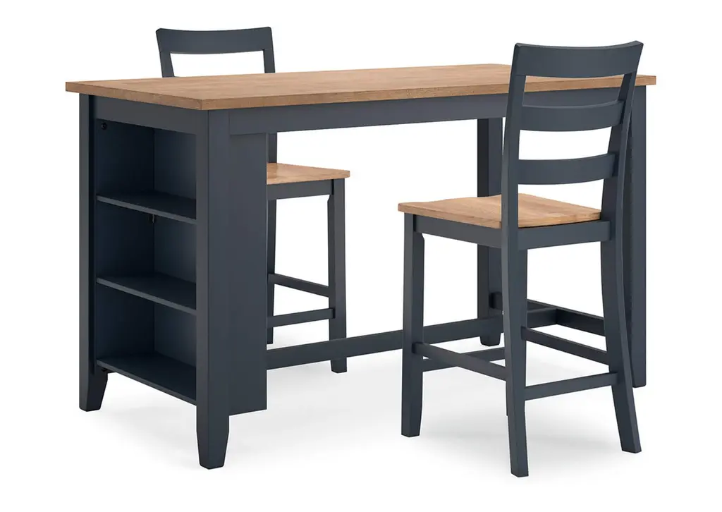 The Gesthaven 5 Piece Counter Dining Set is perfect for cozy meals or working lunches, with 3 built-in shelves for extra storage. The natural wood tone on the chair seats and butcher block-style table top are a chic contrast with the finished frame. With seating for up to 4, this counter set makes a statement.