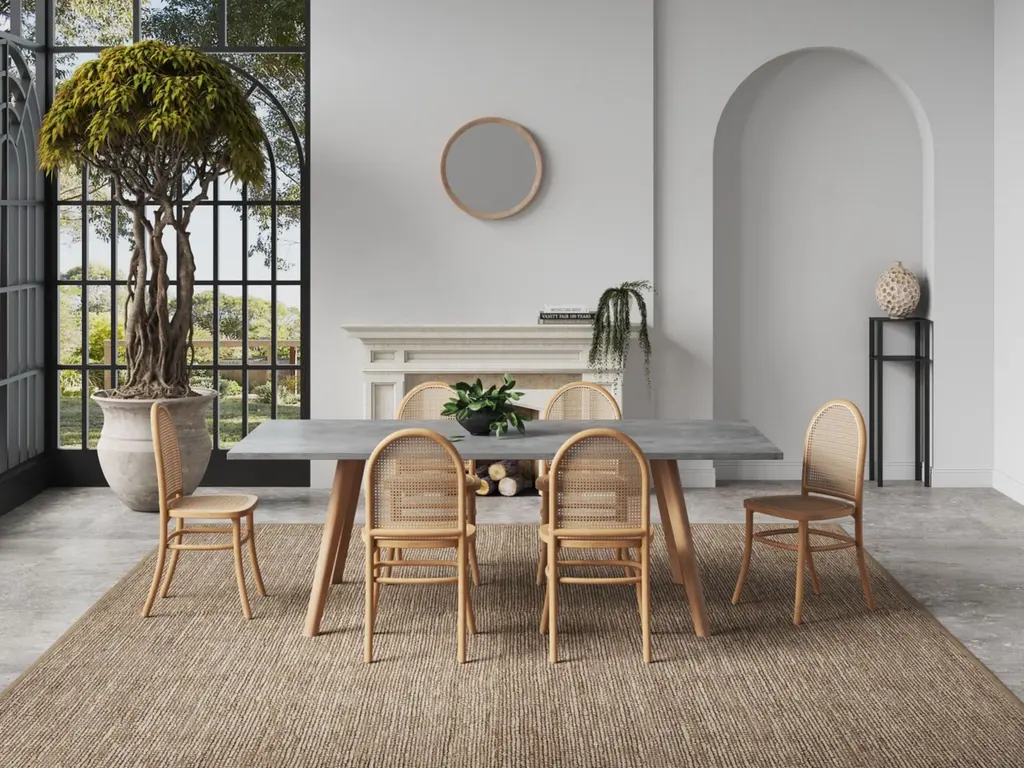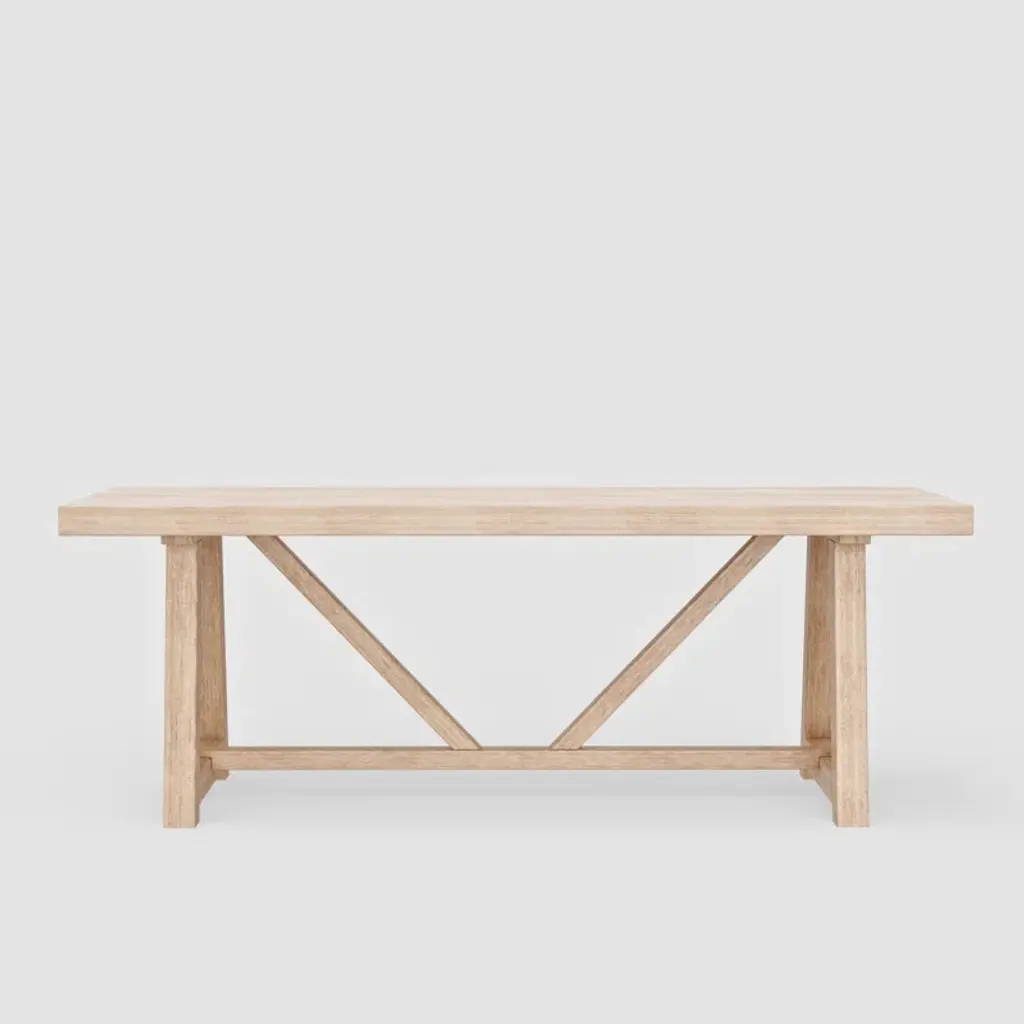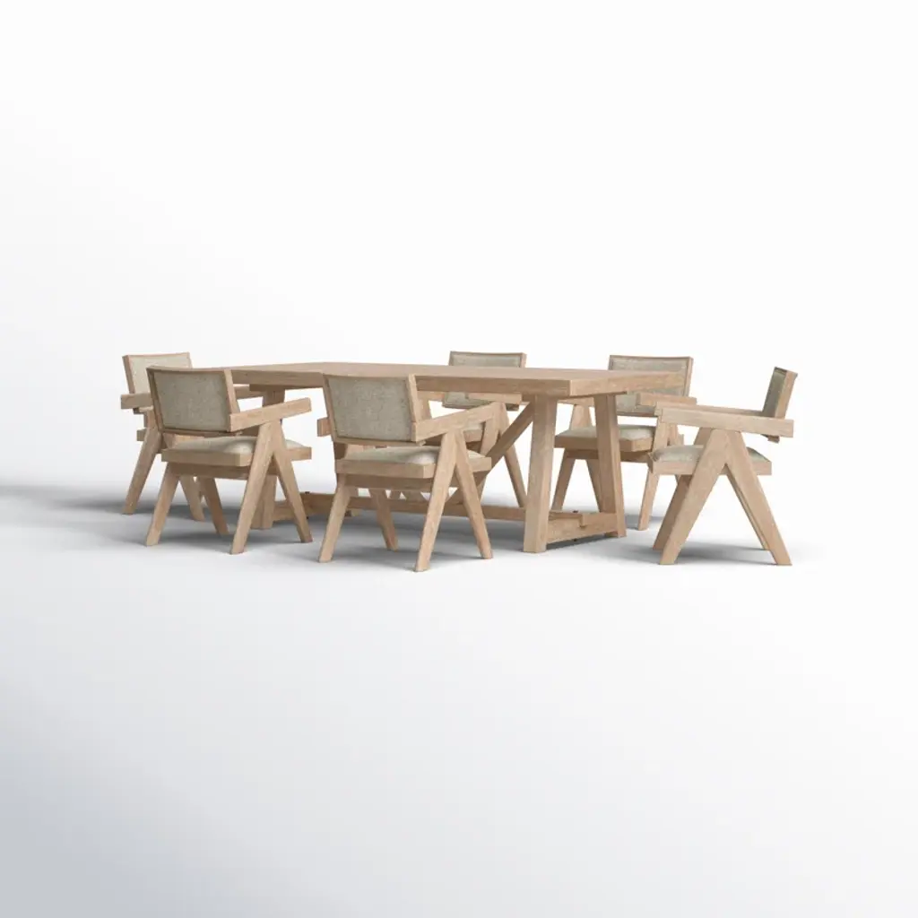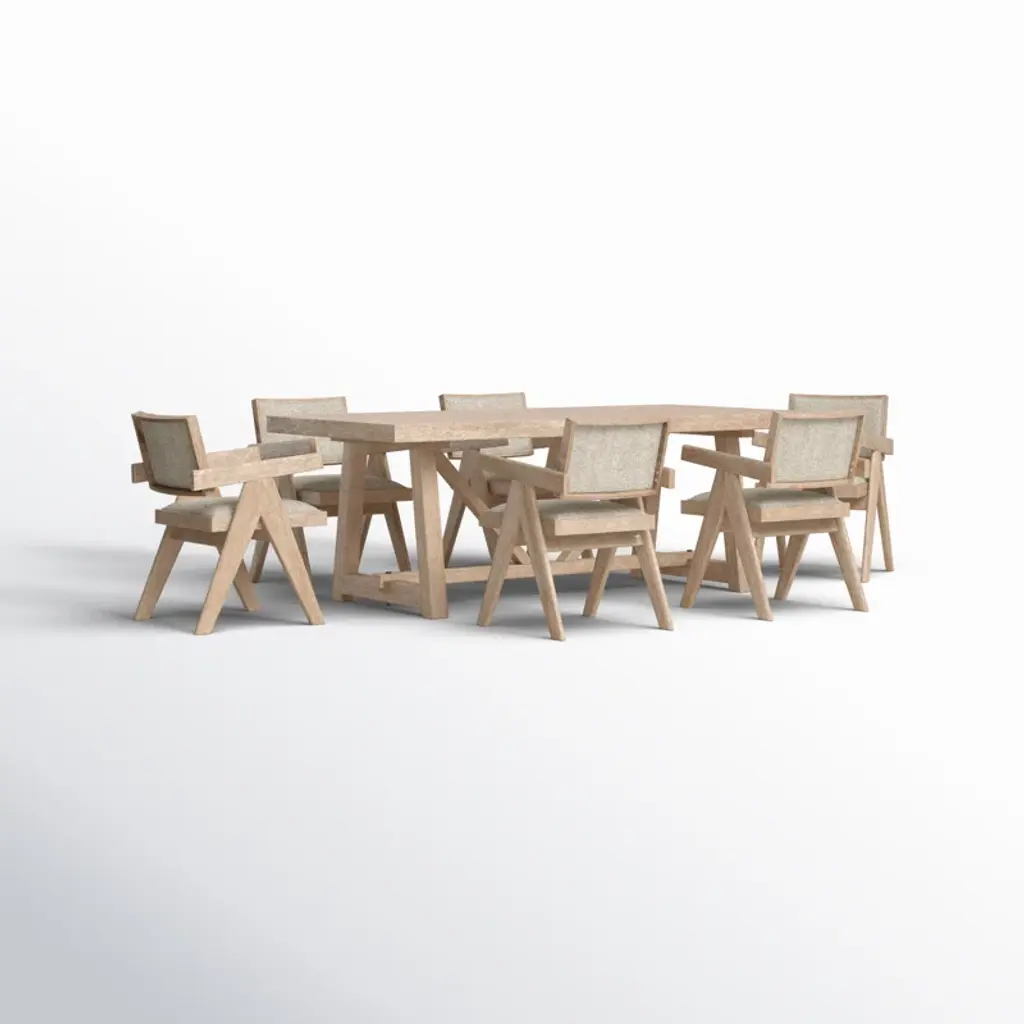 Gather around with friends and family for a delightful meal with this seven-piece dining set. Featuring a rectangular table and six solid wood chairs, this ensemble accommodates up to six people comfortably. The table and chairs showcase a tasteful blend of solid and engineered wood, topped with a purposeful wood scoring and rub-through distressing for that rustic appeal. Upholstered in polyester, the foam-filled seats and backs offer a cozy dining experience. With its trestle base and solid back design, this set brings warmth and an inviting atmosphere to your dining area.