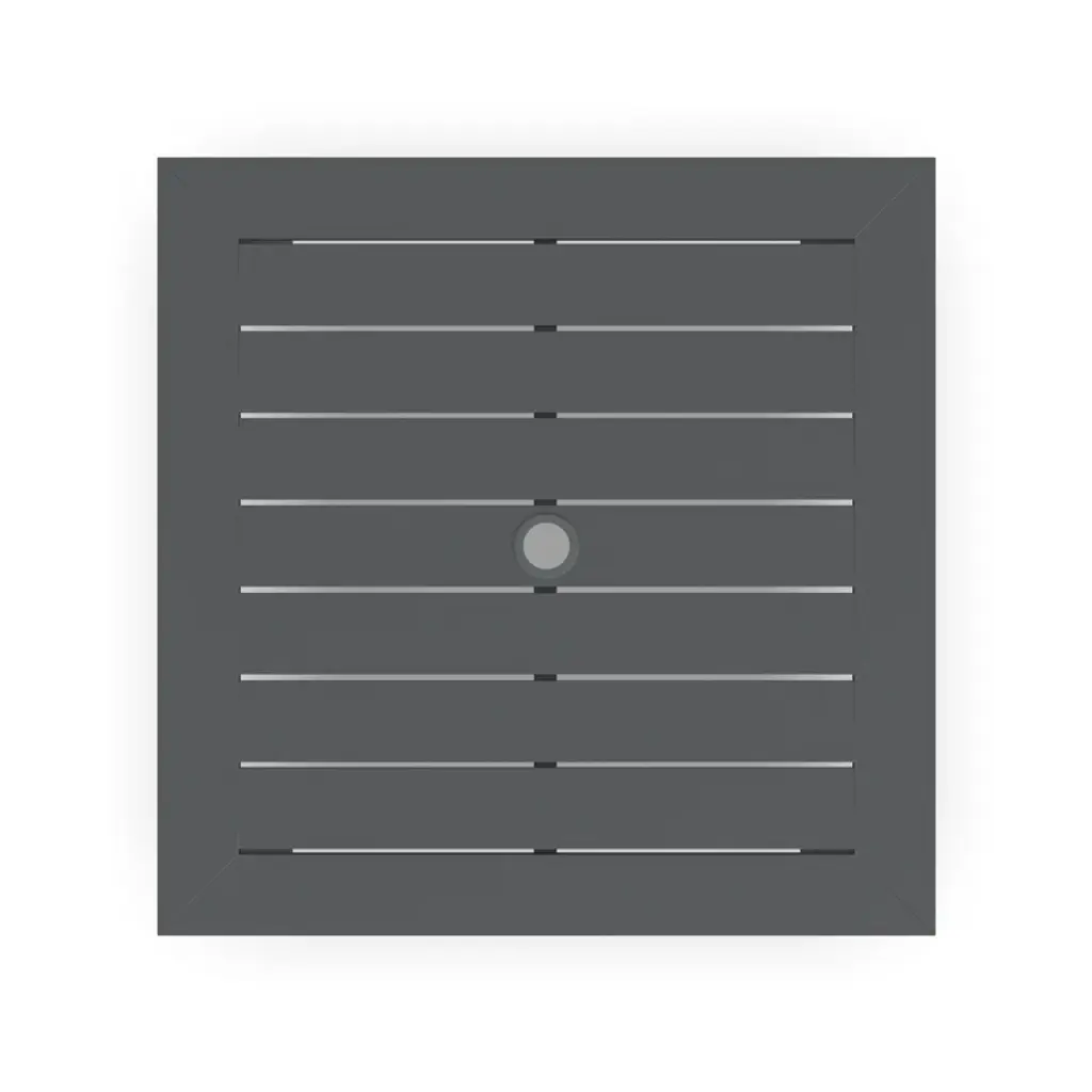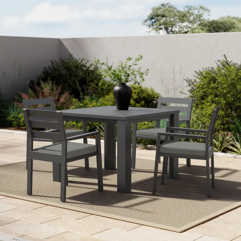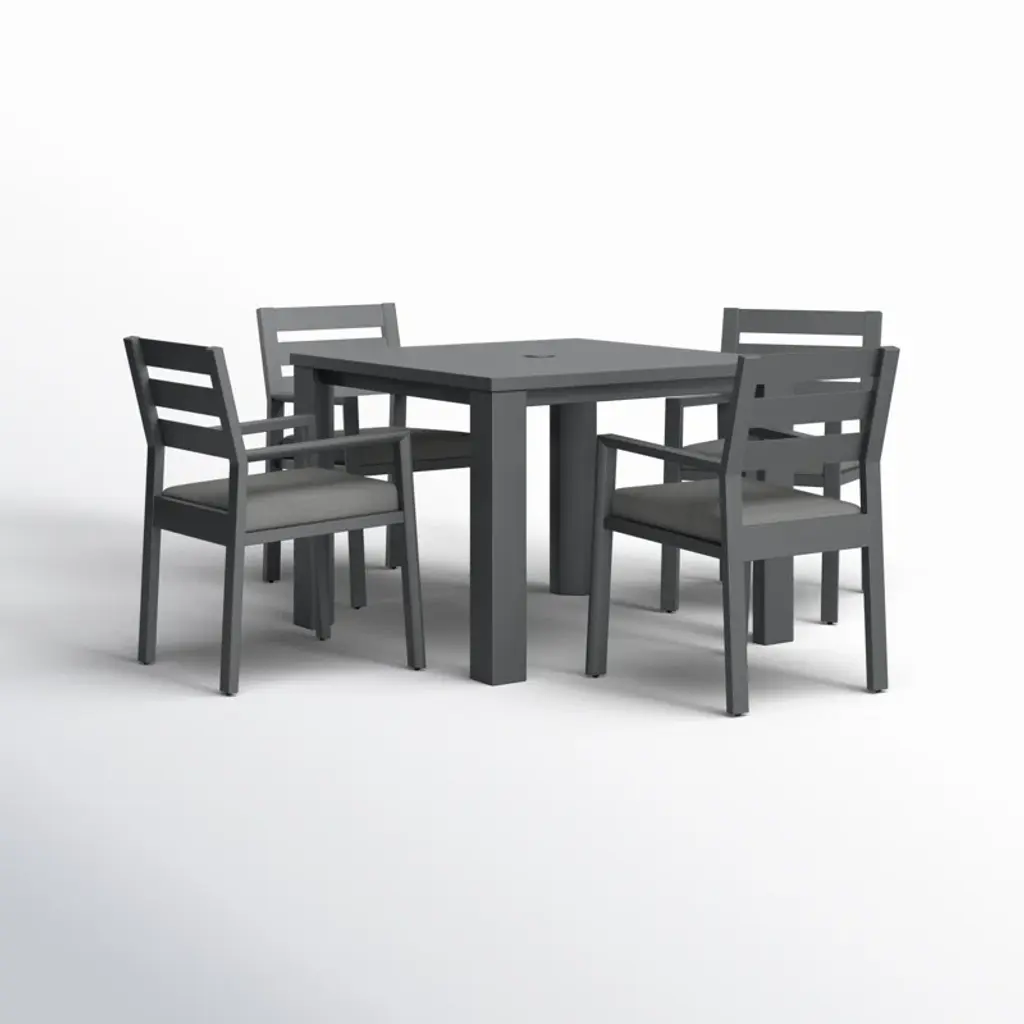 Our 5-piece outdoor dining set updates and elevates any patio or deck. It includes four dining armchairs and a square table with a slatted top and centered umbrella hole. Each piece has a sleek, clean-lined aluminum frame with stainless steel hardware for exceptional durability. Foam cushions are wrapped in gray olefin covers that are resistant to weather, water, mildew, and UV fading.