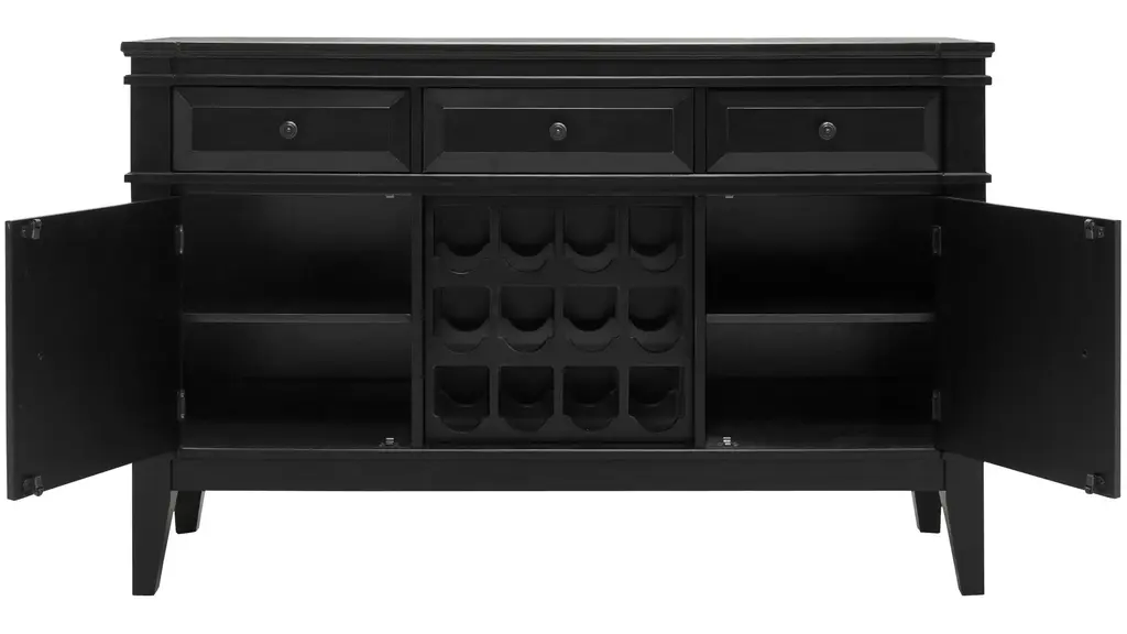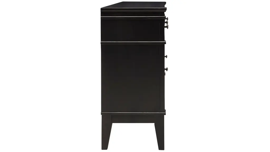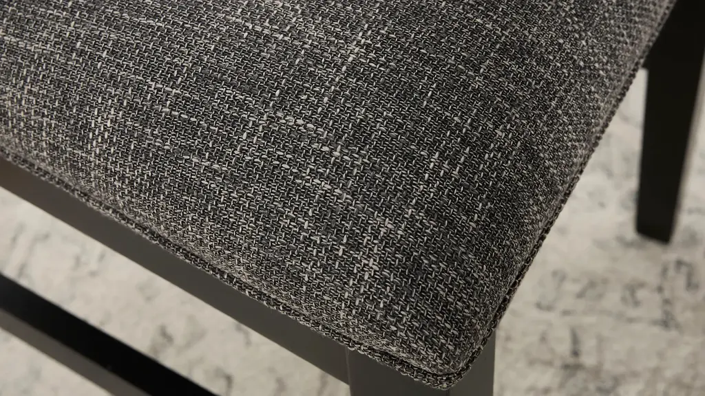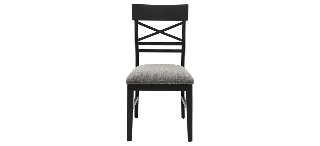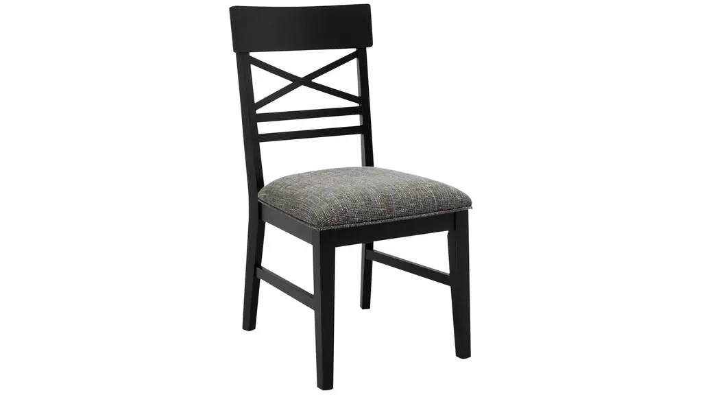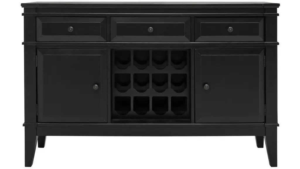 Breakfast, lunch or dinner, dine in style with the Halden dining set. Perhaps the first thing you'll notice is this group's bold black wood finish, which leans toward contemporary style. Don't be fooled, however, as Halden looks wonderful in a more transitional space as well. Plus, gray upholstered seats have an attractive tweed look and provide ample comfort for dinnertime conversations. What better to get the conversation started than a 12-bottle wine rack? Combined with 3 drawers and 2 shelves, the server is a perfect addition. 6-pc. Collection Includes: Four Halden Dining Chairs Halden Dining Table w/ Leaf Halden Server w/ Wine Storage