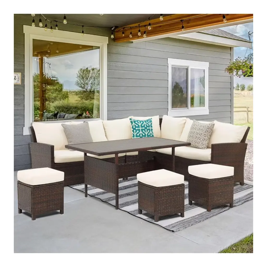 Heynemo 7 Pcs Outdoor Conversation Set All Weather Wicker Sectional Sofa Set Dining Table Chair And Ottoman,steel Frame, Brown (Ship In 4 Boxes) Set