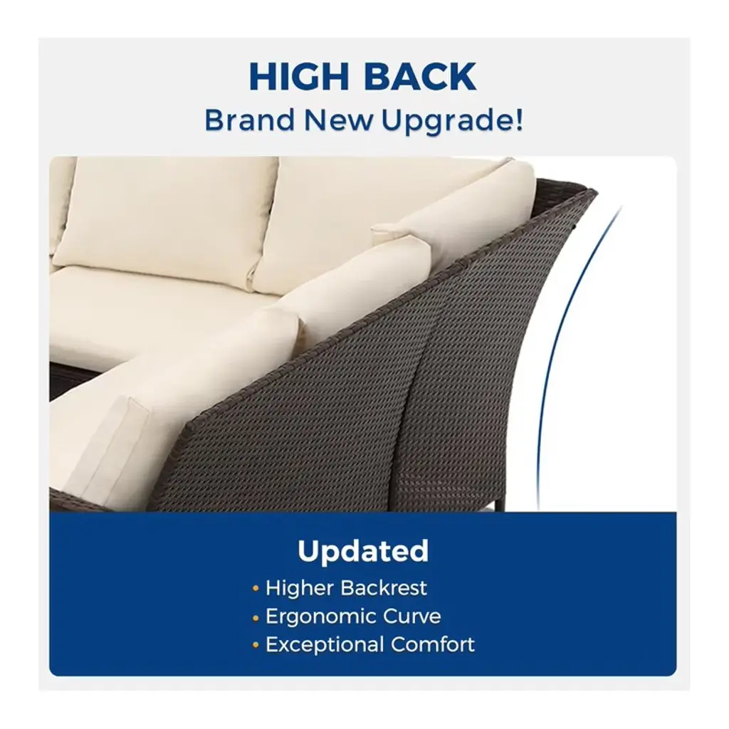 This 7-piece outdoor patio furniture set is built with a heavy-duty powder-coated steel frame and premium wicker rattan, ensuring durability and weather resistance. The set includes thickComfortable cushions with removable, splash-proof covers foEasy cleaning. The large rectangular table features a wood plastic composite tabletop for a rustic feel, with ample space for drinks, food, and decor, plus storage for footstools and cushions underneath. The sectional can be rearranged to suit different layouts, making it ideal for gatherings. With a sleek and modern design, this set complements any outdoor space. It includes 2 single armrest loveseats, 1 corner loveseat, 1 wooden table, 3 ottomans, 13 cushions, and all necessary hardware, packed in 4 boxes foEasy assembly.