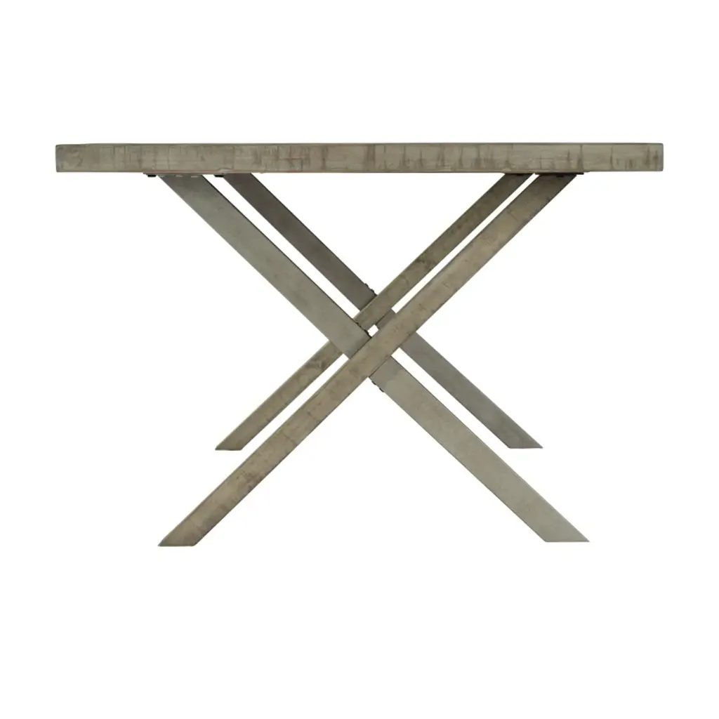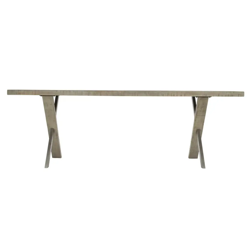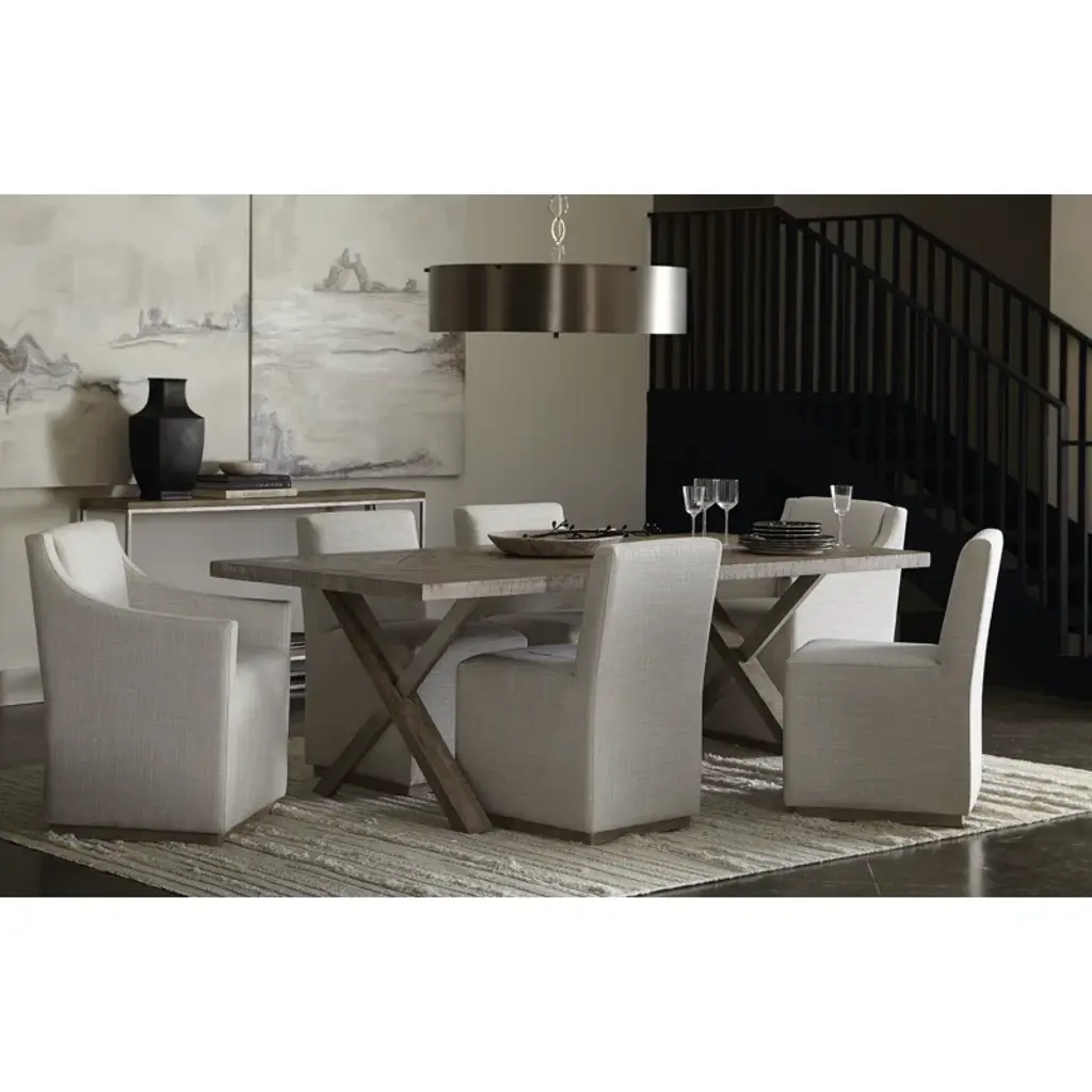 The Highland Park collection, part of Bernhardt's eclectic brand, blends the best features of the farmhouse and mid-century design, with a one-of-a-kind appeal and laid-back vibe. The large, inviting family-style dining table is a stunning example of rustic appeal combined with a modern dynamic. Its wood-framed top with solid wood overlays arranged in a herringbone pattern sits atop an eye-catching X-shaped base featuring composed of intersecting wood and metal posts. This piece is designed by Bernhardt Furniture, a luxury heritage brand that is renowned for iconic furniture design.