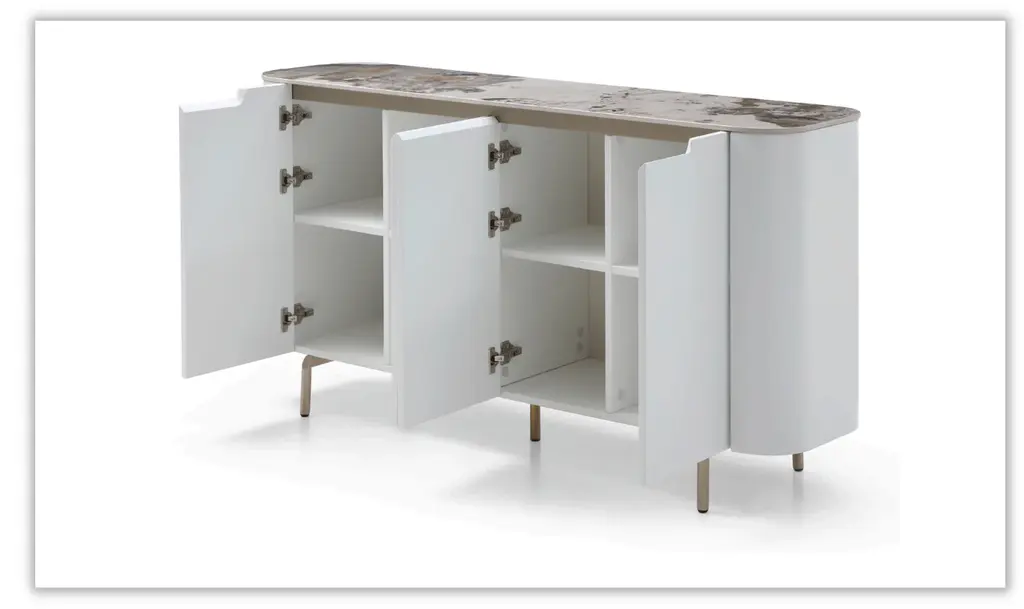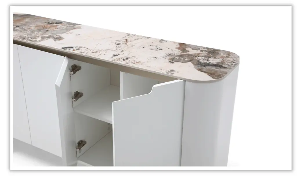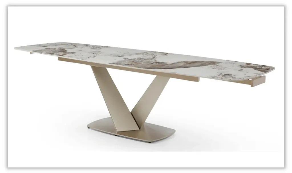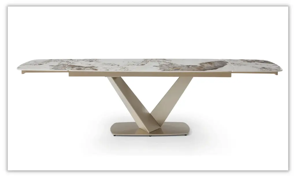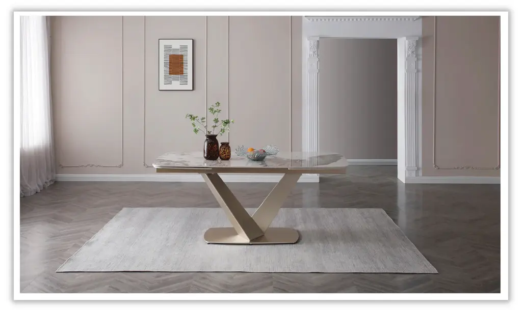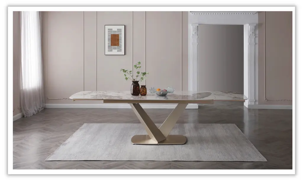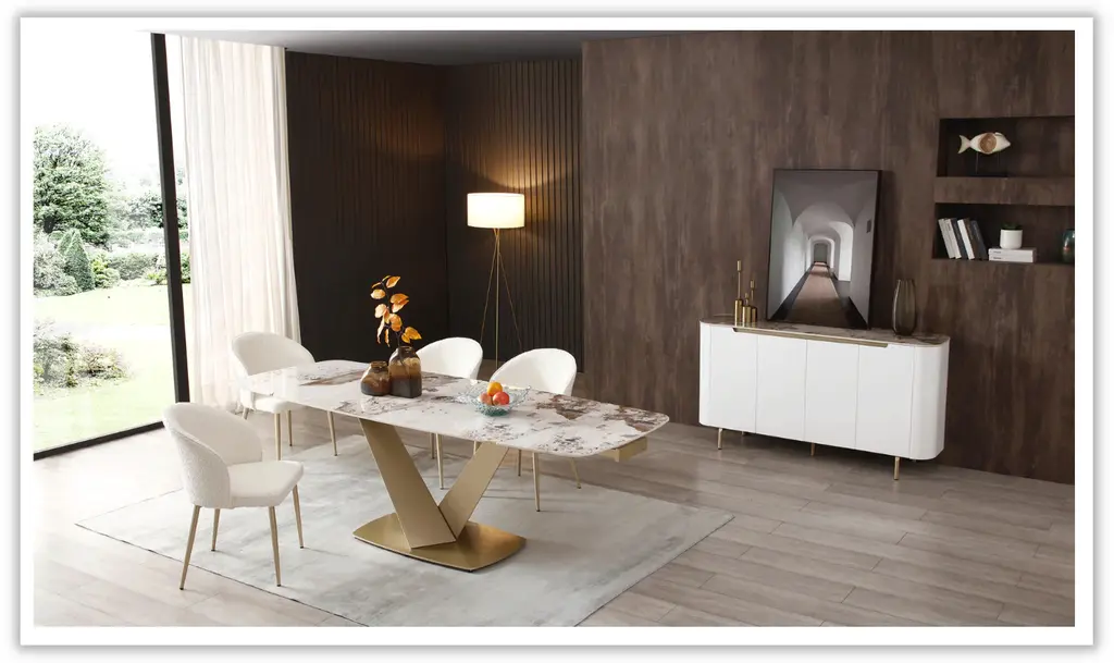 Experience the perfect blend of style and functionality with the HomeTown Dining Room Set by Jennifer Furniture. This exquisite set includes a stunning extendable dining table, fabric-finished chairs, and a sophisticated buffet, all designed to elevate your dining experience to new heights. The HomeTown Dining Extendable Dining Table is the centerpiece of the set, offering versatility and elegance. With its innovative extendable feature, the table effortlessly accommodates extra guests during special occasions. Expandable by 2x 19.5", it provides ample space for everyone to come together and enjoy memorable meals. The crossed shape metal legs add a modern and sophisticated touch, complementing various interior styles. The table is crowned with an 11mm gloss solid ceramic top, adding a touch of luxury and ensuring a sleek and durable surface that stands up to everyday use. Its easy-to-clean feature ensures the table's pristine appearance for years to come, making it a practical addition to your dining space. The fabric-finished chairs in the set offer comfortable seating with a touch of elegance. With their plush upholstery, they invite you to sit back and enjoy delightful dining moments with loved ones. Completing the set is the sophisticated buffet, which adds both style and functionality to your dining room. With 8 drawers and 2 doors, the buffet provides ample storage space for your dining essentials, keeping your space organized and clutter-free. Embrace the beauty and versatility of the HomeTown Dining Room Set, and create cherished dining moments in style and comfort. Elevate your dining space with this exquisite set that seamlessly combines modern aesthetics with practicality. Experience dining like never before with this captivating and elegant ensemble by Jennifer Furniture.Note:5 Pieces Include - Dining Table + 4 Chair6 Pieces Include - Dining Table + 4 Chair + Buffet7 Pieces Include - Dining Table + 6 Chair8 Pieces Include - Dining Table + 6 Chair + Buffet
