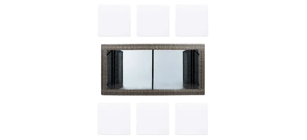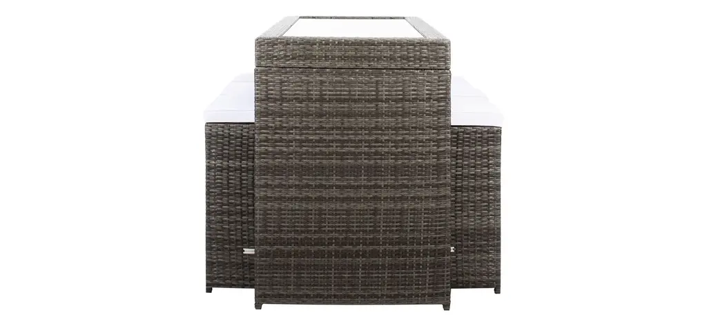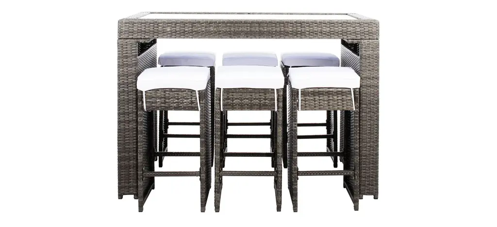 Pairing clean architectural lines with a rippling surface, this Hutton 7-pc. Outdoor Dining Set is both beautiful and hardworking. Hutton flaunts its Parsons style table and six stools in a calm hue with luxuriously plush matching cushions to complement any patio or porch's decor.