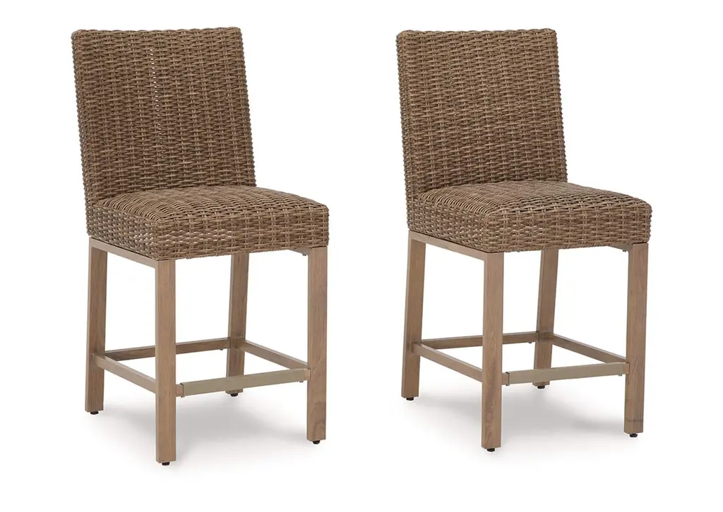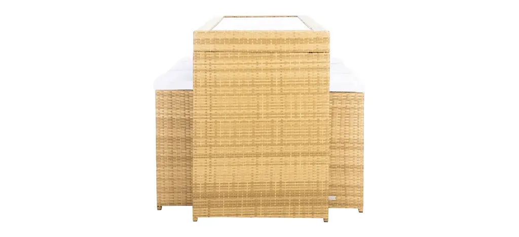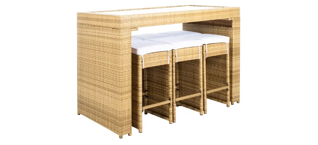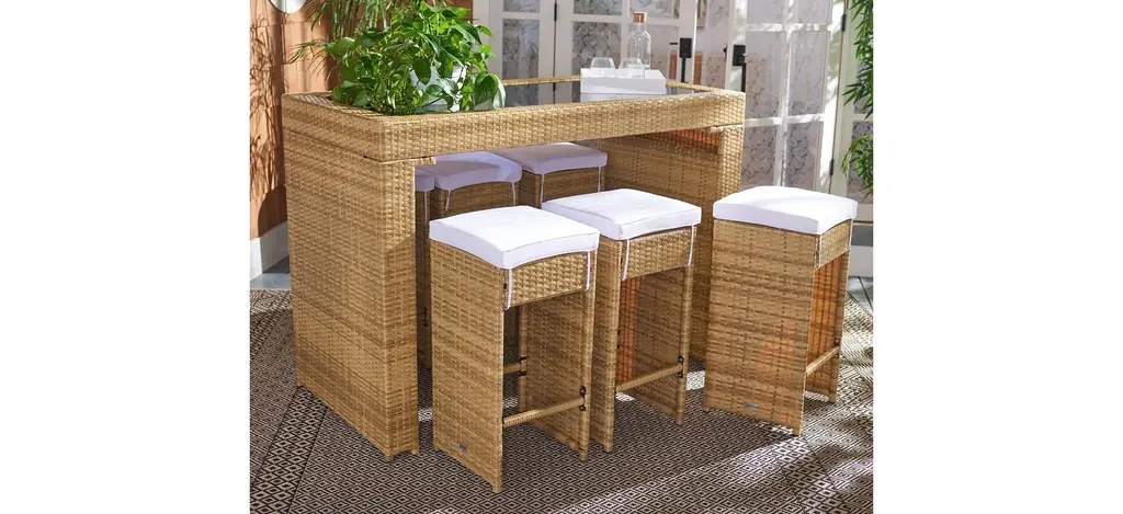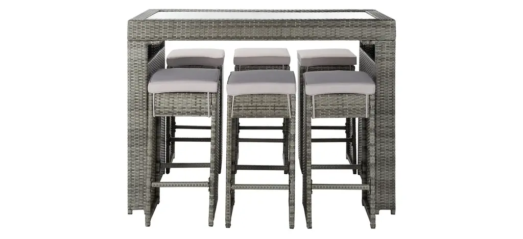 Pairing clean architectural lines with a rippling surface, this Hutton 7-pc. Outdoor Dining Set is both beautiful and hardworking. Hutton flaunts its Parsons style table and six stools in a calm hue with luxuriously plush matching cushions to complement any patio or porch's decor.