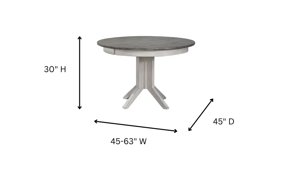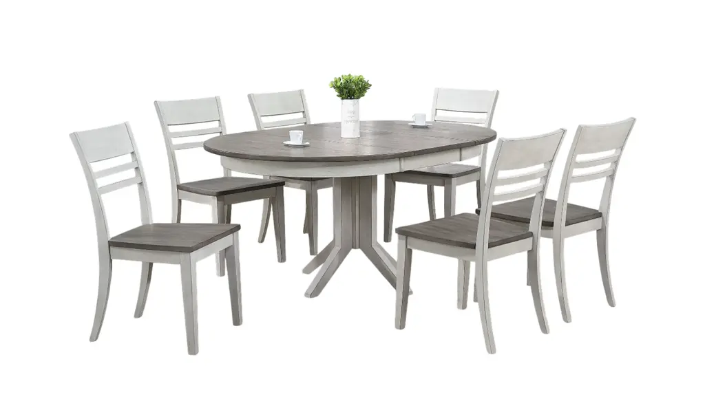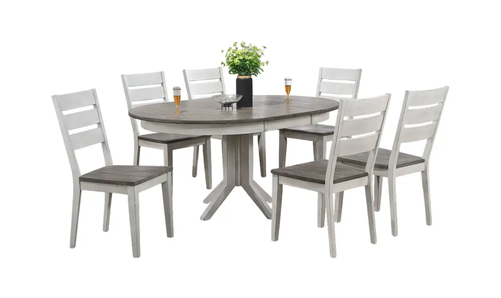 The Iconic Furniture Round Dining Table Set offers a balanced mix of function and style, built to suit both everyday dining and occasional gatherings. The round pedestal table is crafted with a gear-driven 18" takeout leaf, expanding from 45" to 63" in length, comfortably seating four to six people. Its two-tone ash and stormy white finish highlights the transitional style, pairing well with a variety of interiors. The sturdy pedestal base ensures stability while adding a timeless look to the set. Six ladder-back chairs complete the arrangement, designed with supportive frames and rubberwood construction for durability. Each chair includes a weight capacity of 250 lbs and requires simple assembly. The subtle gray undertones of the stormy white finish complement the ash accents, giving the set a versatile appearance that fits seamlessly into dining spaces of different sizes.