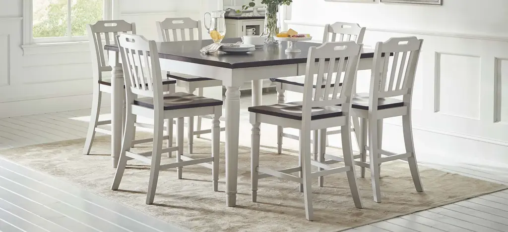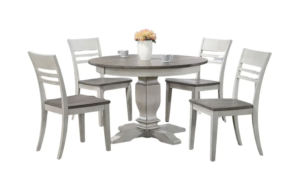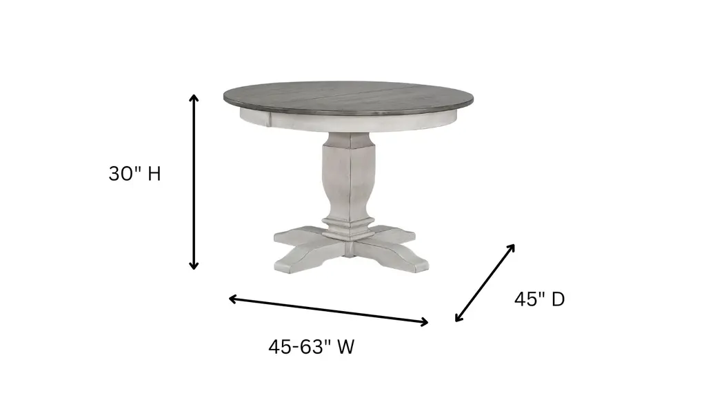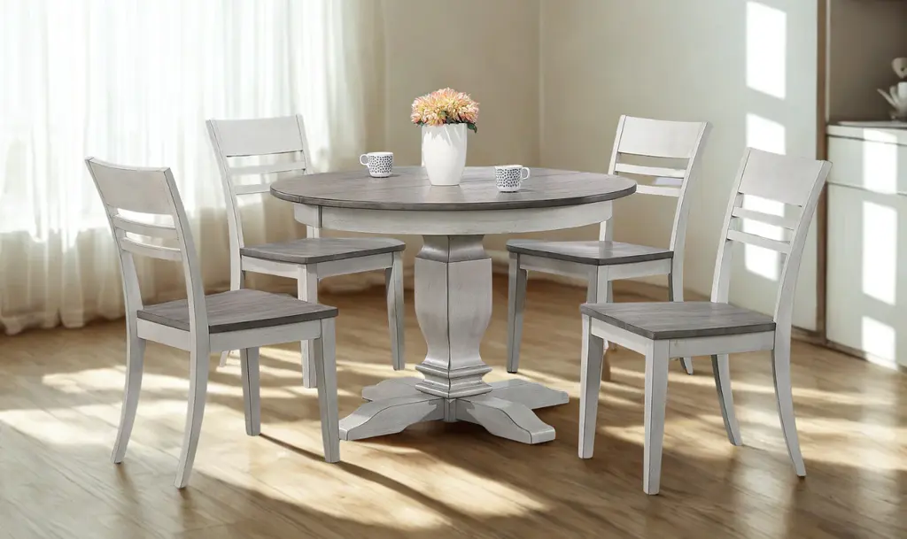 The Transitional Ladder Back 5-Piece Dining Set blends functionality with a timeless two-tone finish. Crafted from durable rubberwood, the round pedestal dining table showcases an ash gray wash top paired with a stormy white base, creating a balanced contrast that complements both classic and transitional interiors. The gear-driven 18-inch takeout leaf allows the table to expand from 45 inches to 63 inches in length, making it versatile enough for everyday dining or hosting guests. Accompanied by four ladder back chairs, this set offers both stability and comfort. Each chair is built with a sturdy frame, a supportive back design, and a 250-pound weight capacity. Easy to assemble and maintain, the set is designed for everyday use while maintaining a refined appearance. Its compact round design is ideal for kitchens, dining rooms, or smaller spaces while still providing seating for four to six people.