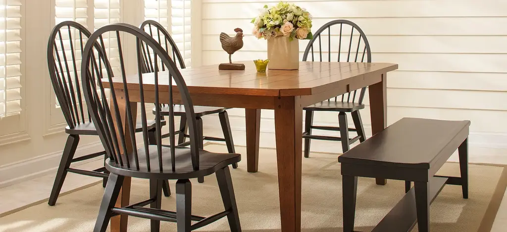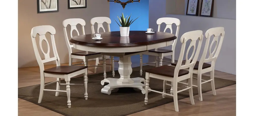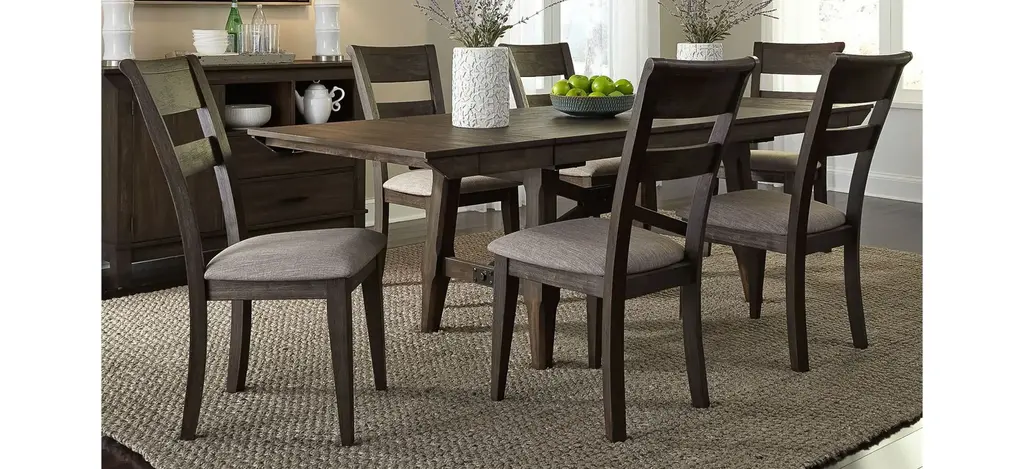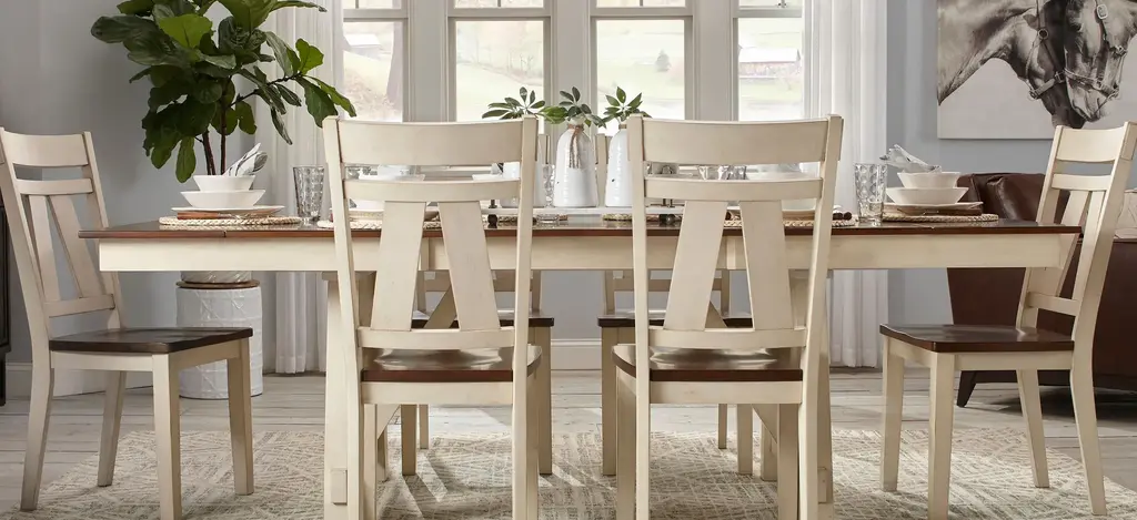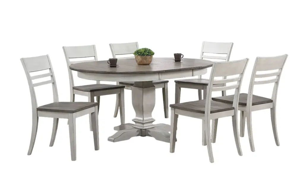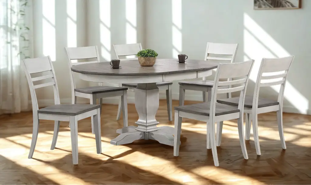 The Transitional Ladder Back 7-Piece Dining Set in Ash and Stormy White brings balanced styling to family dining and casual gatherings. The set includes a round single-pedestal dining table with a gear-driven 18-inch takeout leaf, allowing the surface to expand from 45 to 63 inches. Its transitional pedestal base complements the ash gray and stormy white two-tone finish, creating a versatile look that blends with both light and dark interiors. Six ladder-back chairs accompany the table, each crafted from solid rubberwood for durability. The chairs feature comfortably sized seats with a 250-pound weight capacity, making them practical for daily use. With its expandable design, sturdy materials, and timeless color palette, this dining set accommodates seating for four to six, making it a dependable choice for everyday meals or special occasions.