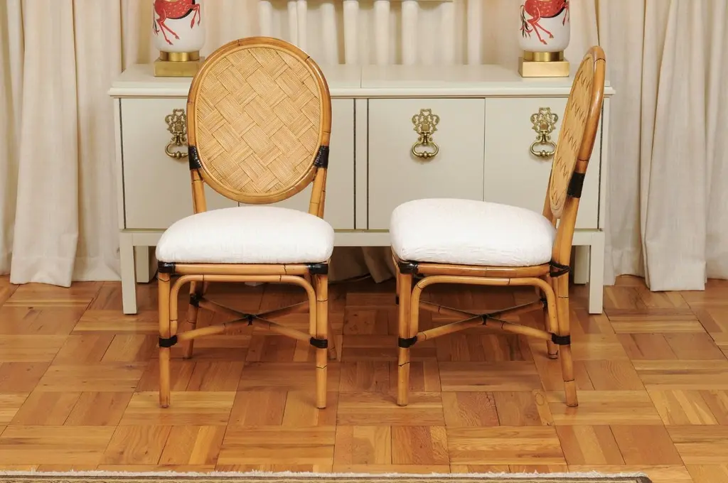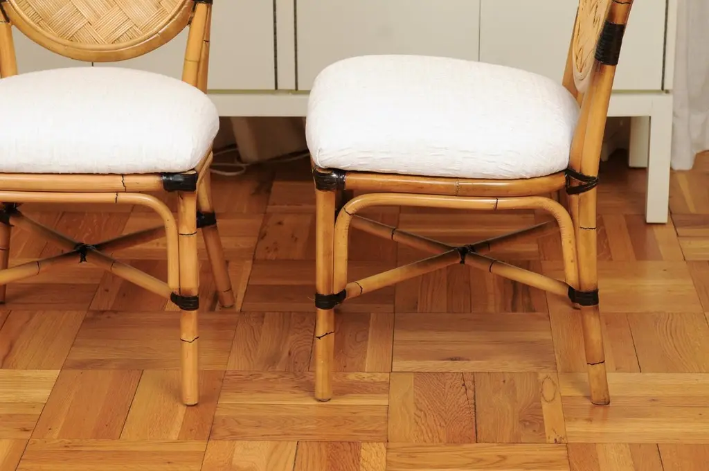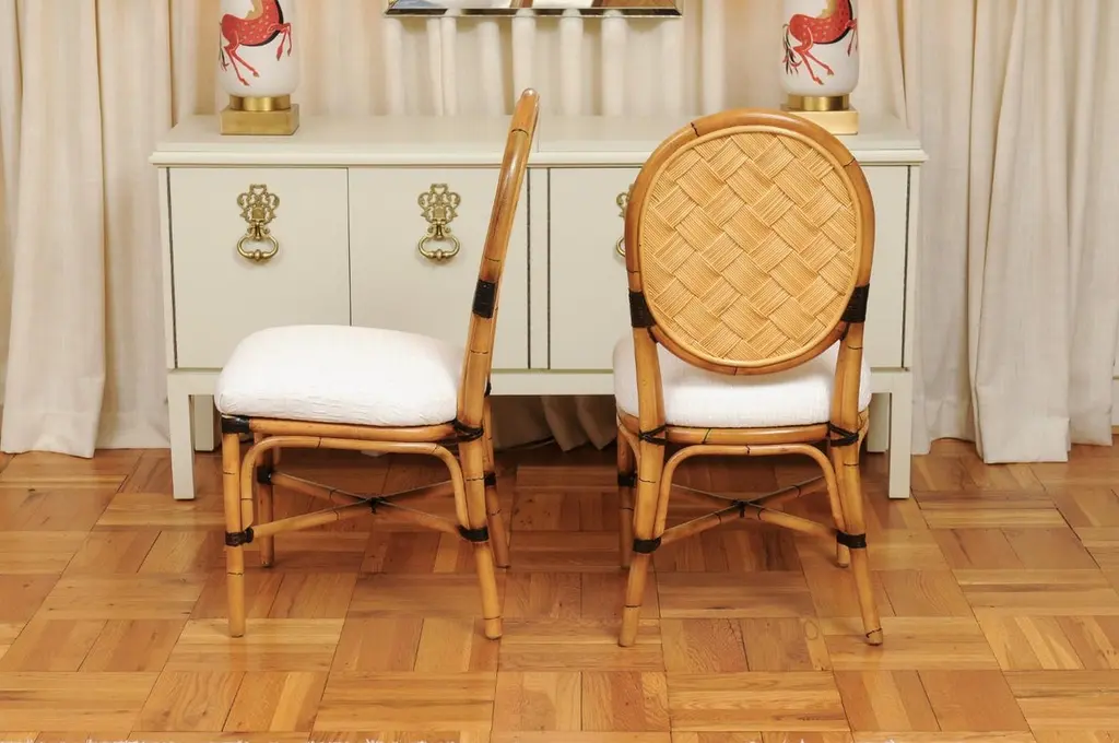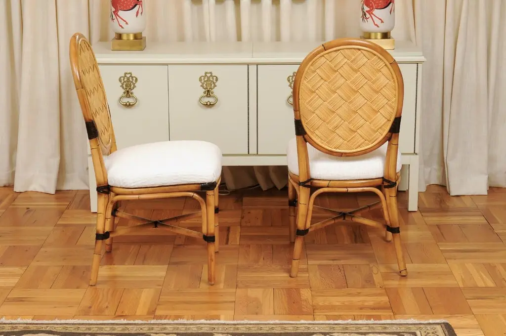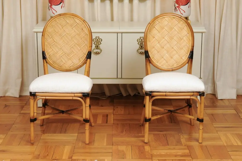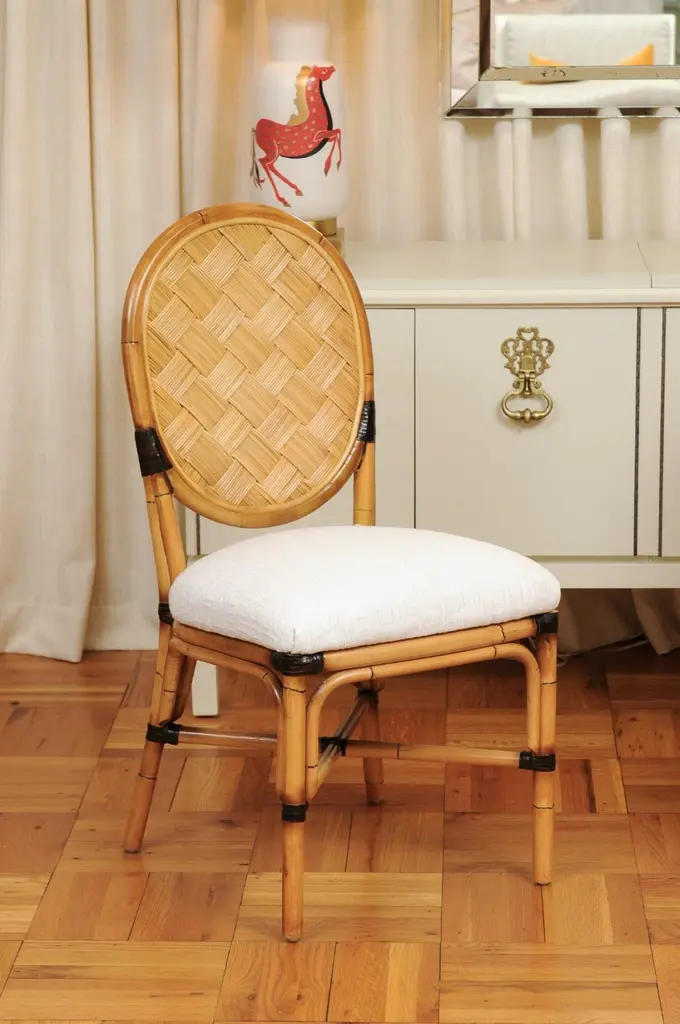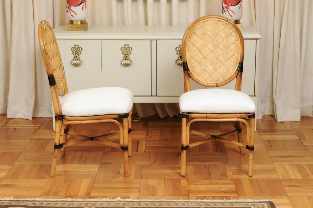 This magnificent unique set of dining chairs is shipped as professionally photographed and described in the listing narrative: Meticulously professionally restored, newly upholstered and completely installation ready. Expert custom upholstery service is available.A fabulous set of twelve (12) custom-made dining chairs, circa 1995. Stout, expertly crafted rattan frame with a stunning oval back highlighted with a diagonal basketweave rush style inset. Leather accents executed in a burnished chocolate. Extremely comfortable and built for heavy routine use. The design is most certainly inspired by the ground-breaking work produced by the great John Hutton for Donghia during the mid-1990's. Special chairs specifically intended to anchor an important dining room. Textural organic perfection. Excellent Restored Condition. Professionally cleaned and re-lacquered. The rattan projects a rich warmth and depth. All leather accents are intact and complete. New expert custom upholstery in a neutral textured Larsen fabric. The price listed is for the set of twelve (12). Expert custom upholstery service is available.