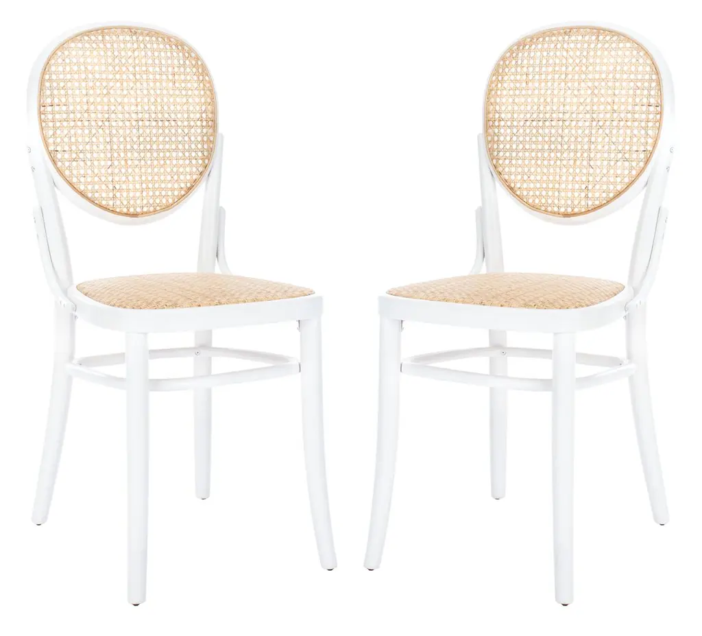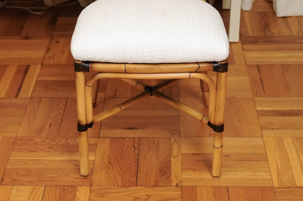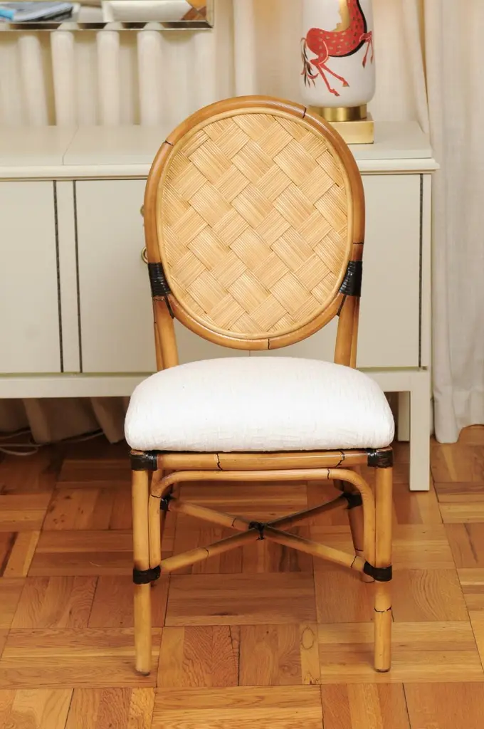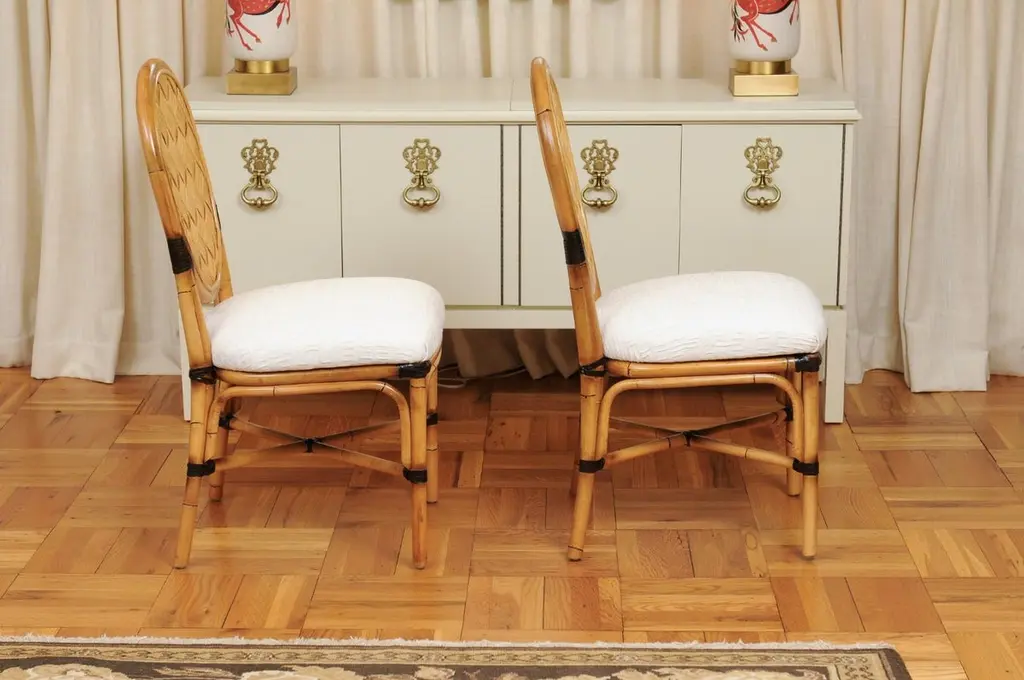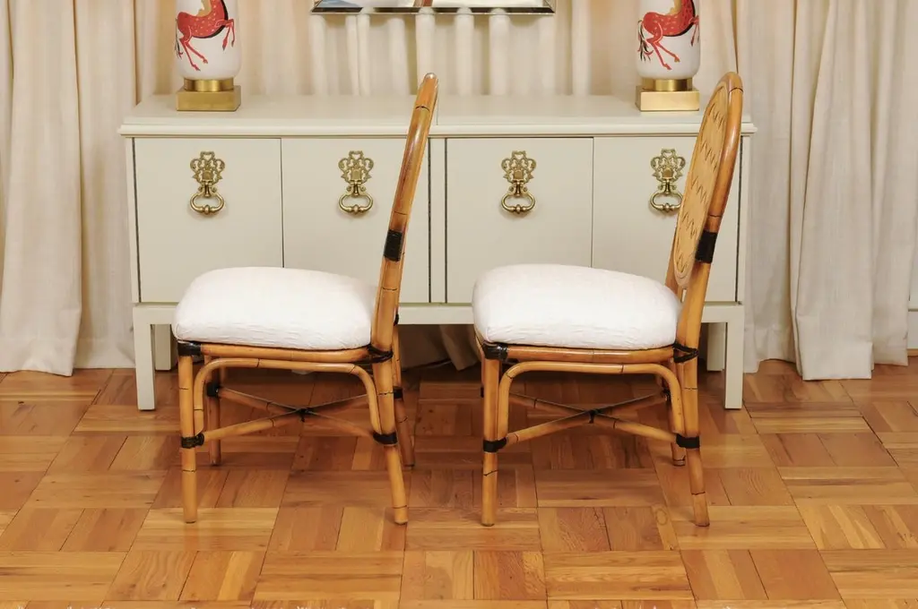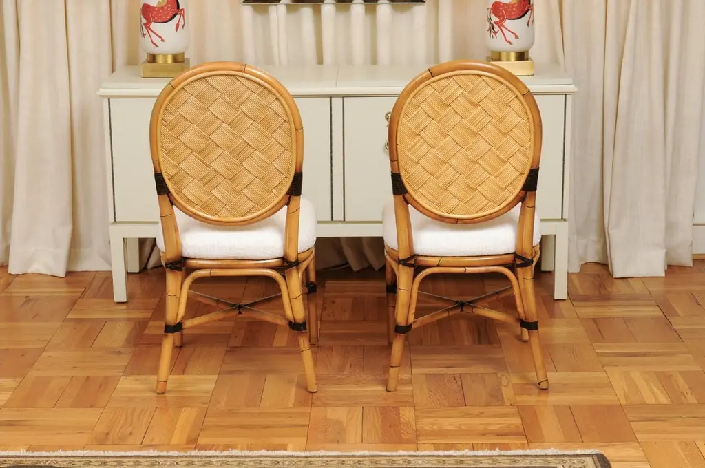 This magnificent unique set of dining chairs is shipped as professionally photographed and described in the listing narrative: Meticulously professionally restored, newly upholstered and completely installation ready. Expert custom upholstery service is available.A fabulous set of twelve (12) custom-made dining chairs, circa 1995. Stout, expertly crafted rattan frame with a stunning oval back highlighted with a diagonal basketweave rush style inset. Leather accents executed in a burnished chocolate. Extremely comfortable and built for heavy routine use. The design is most certainly inspired by the ground-breaking work produced by the great John Hutton for Donghia during the mid-1990's. Special chairs specifically intended to anchor an important dining room. Textural organic perfection. Excellent Restored Condition. Professionally cleaned and re-lacquered. The rattan projects a rich warmth and depth. All leather accents are intact and complete. New expert custom upholstery in a neutral textured Larsen fabric. The price listed is for the set of twelve (12). Expert custom upholstery service is available.