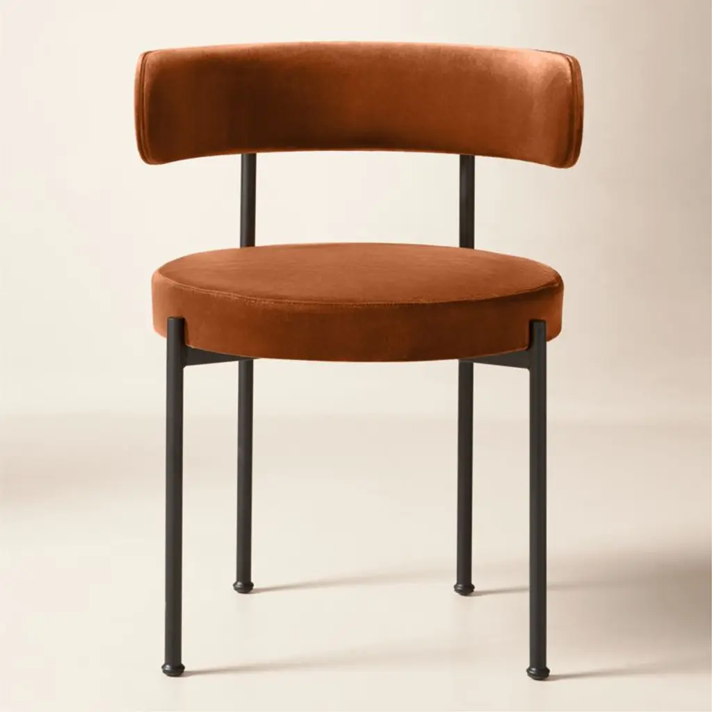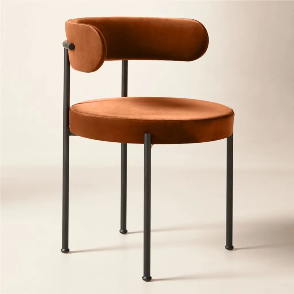 Made in Italy, smoked amber velvet dining chair by Omar De Biaggio catches the eye with its casual good looks. Steel tube frame is finished with a matte black powdercoat to contrast with the velvet seat and curved back. CB2 exclusive.