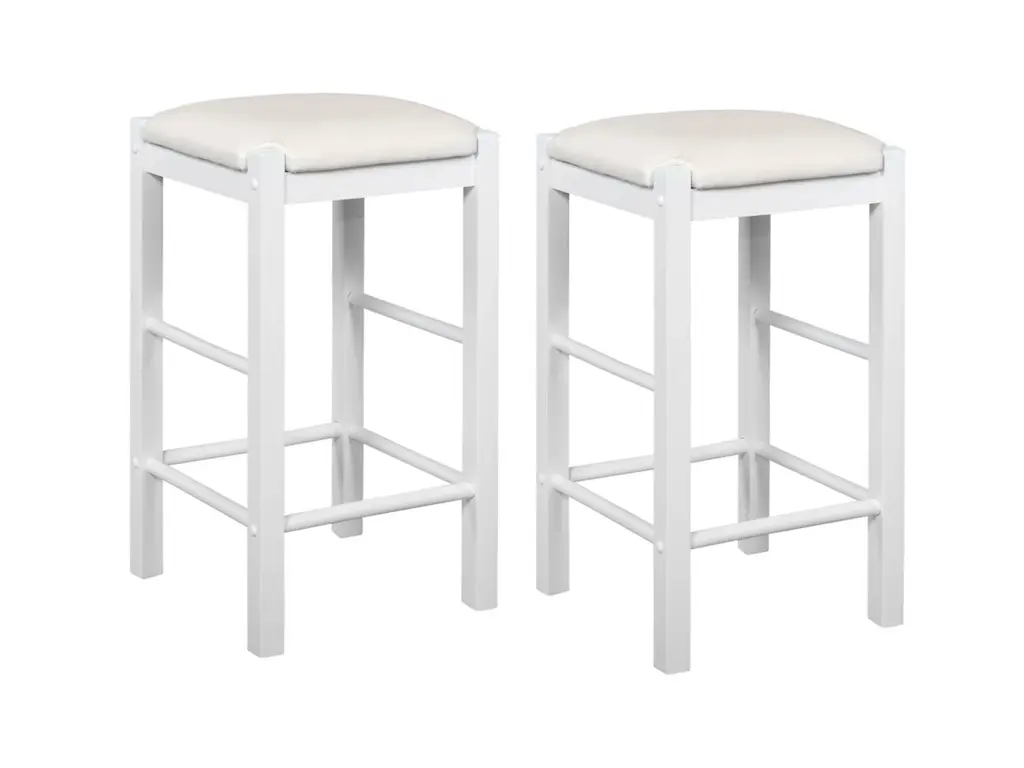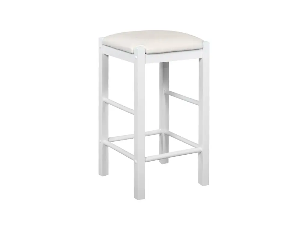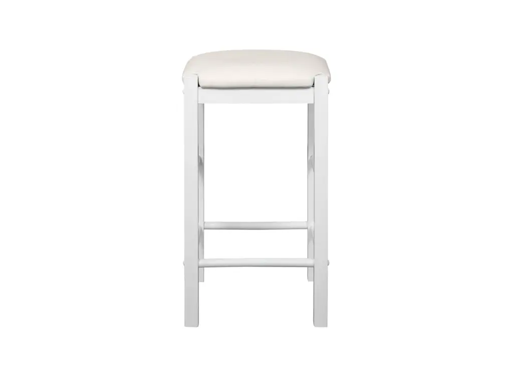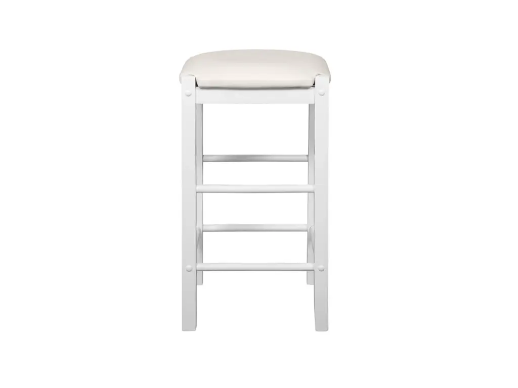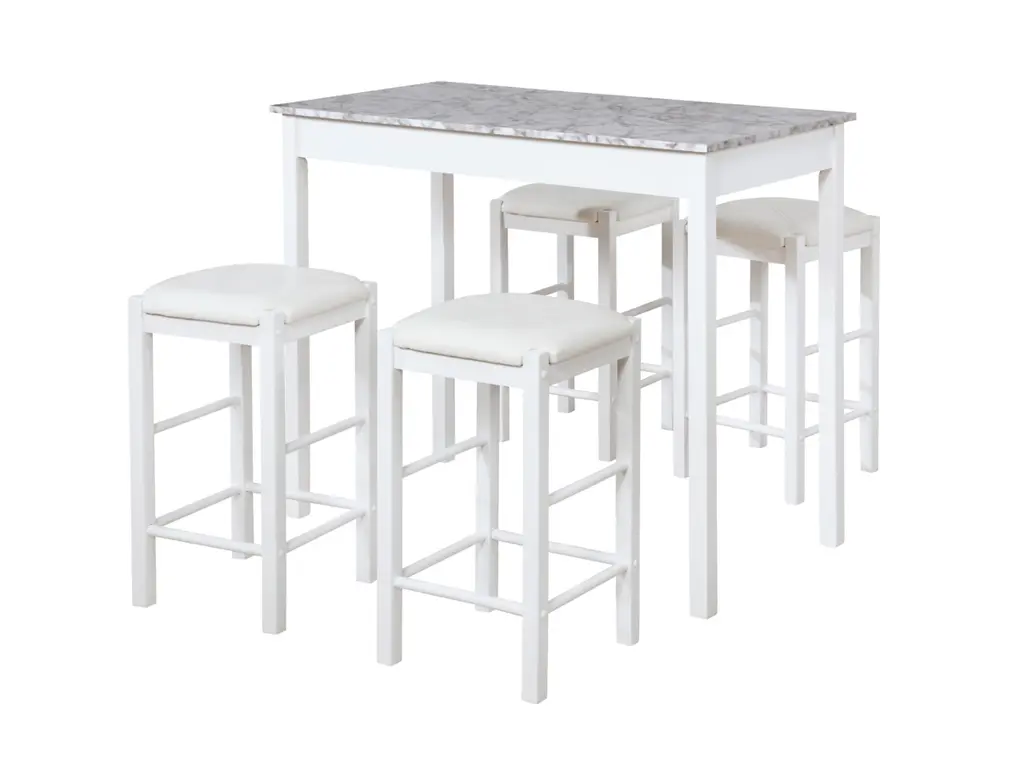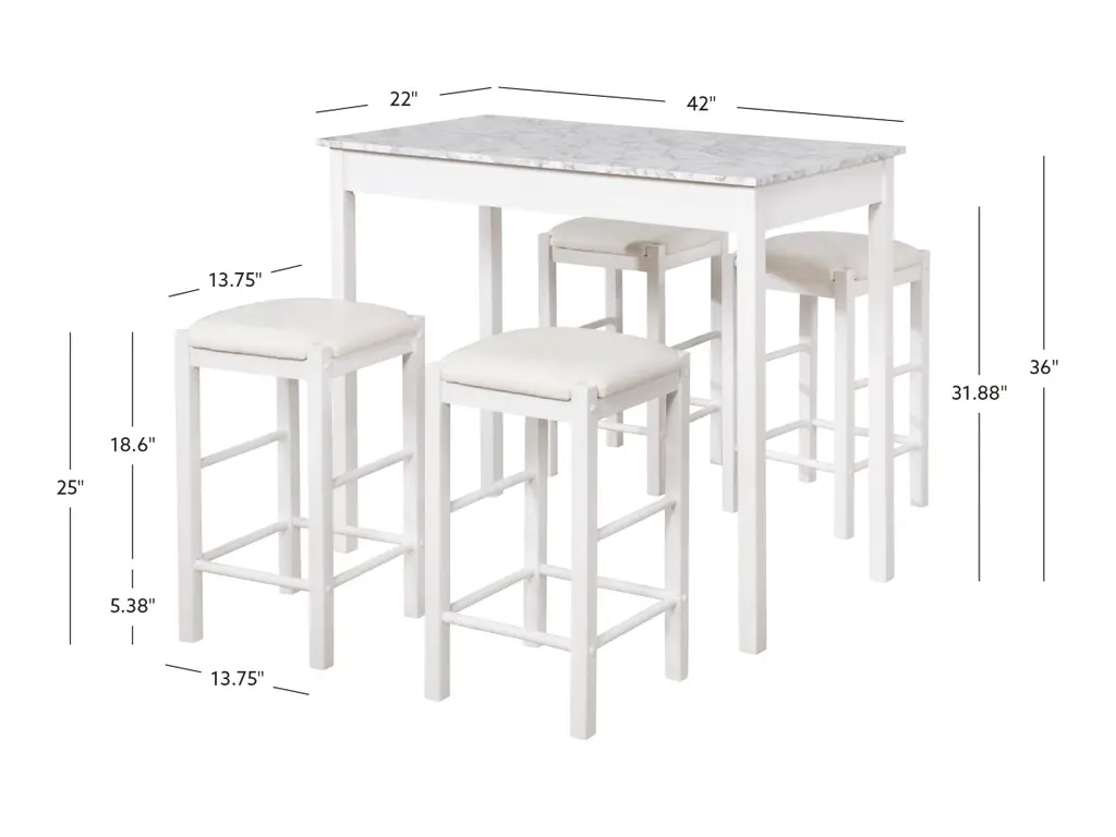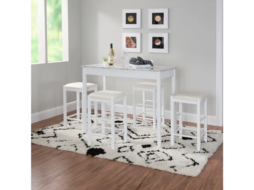 The Tavern 5-piece counter set features a elegant rectangular table on long sturdy legs with four backless counter height stools with padded, white faux leather upholstered seats. Made from solid woods and a faux marble top, the white finish of the base and legs gives this piece an elegant and sophisticated appeal. The stools tuck neatly under the table when not in use. Great for your kitchen, dining area, den or any place you entertain.