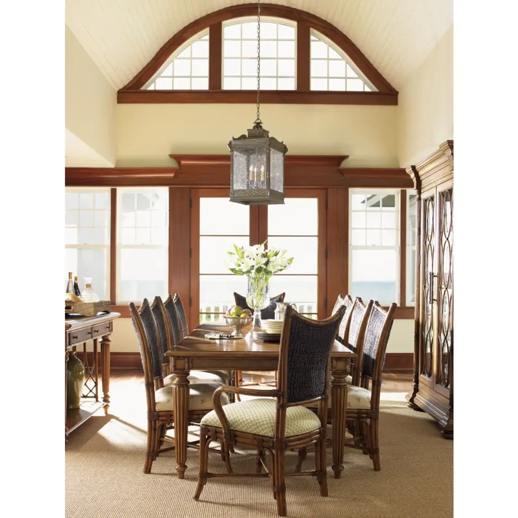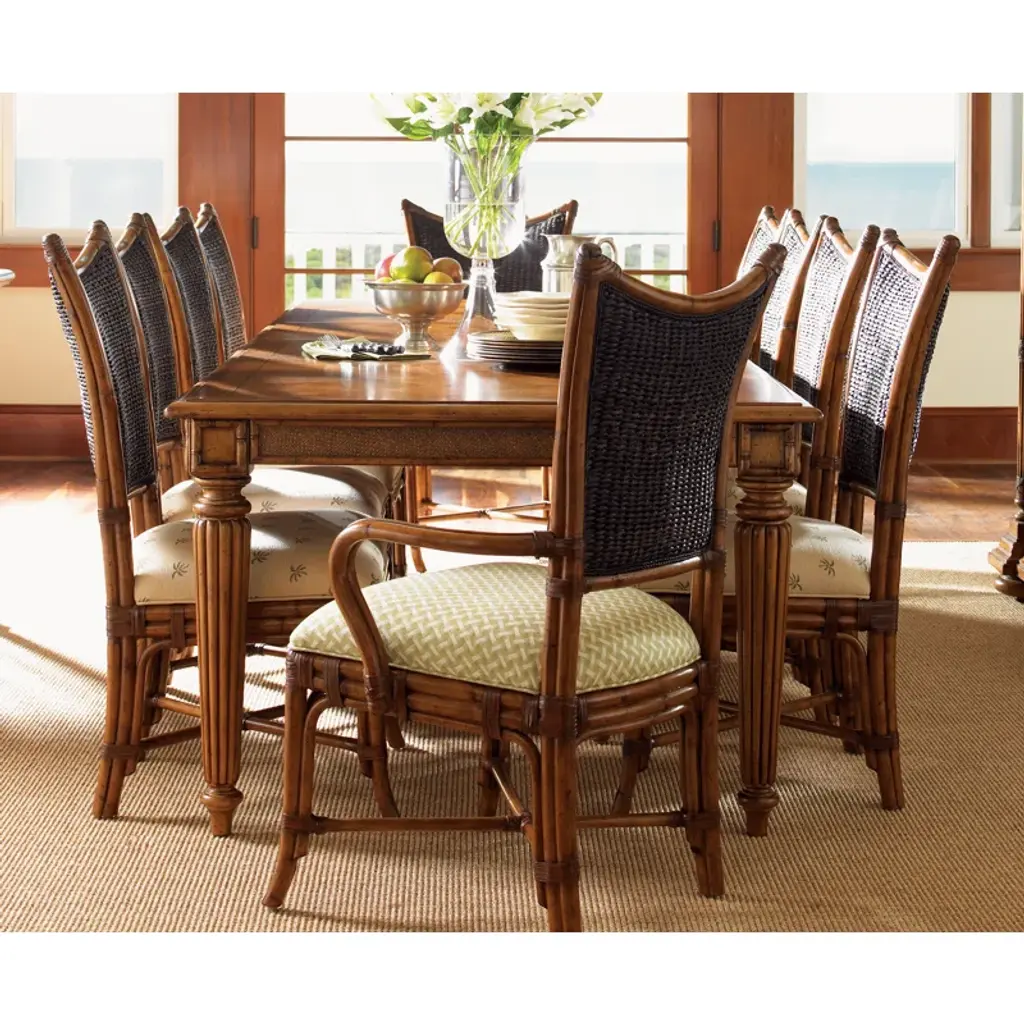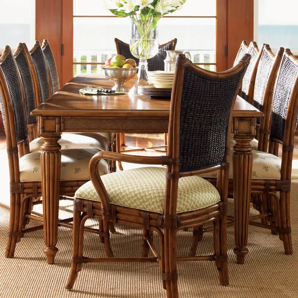 The Island Estates 11-piece dining set transforms your dining area into a tropical retreat. This exquisite collection from Tommy Bahama Home combines elegant design with the laid-back charm of island life. Featuring a generous table and ten chairs, it's perfect for hosting family feasts or intimate dinner parties.