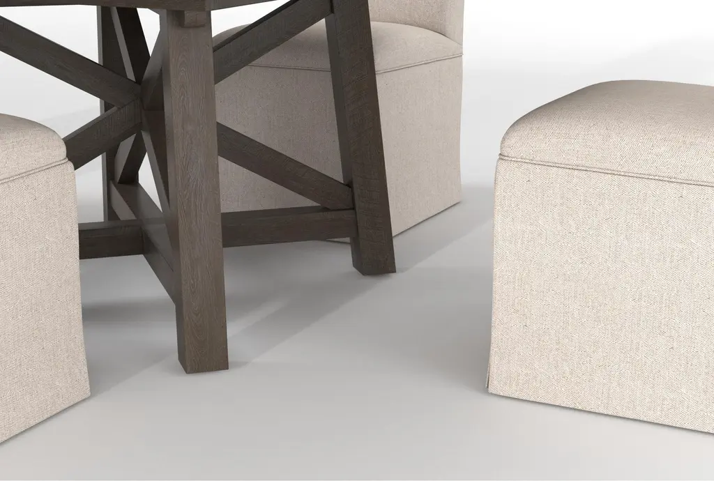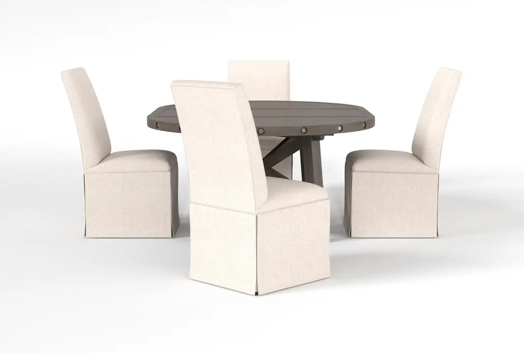 The Jaxon Grey 54-75" Round Extendable Dining with Garten Linen Skirted Chair Set for 4 brings a blend of industrial and timeless charm to your dining room or kitchen. This 5-piece set features a solid pine round dining table paired with elegant ivory skirted chairs, providing a comfortable and stylish seating solution for up to four people. The extendable table allows for versatile dining options, perfect for both everyday meals and special gatherings.