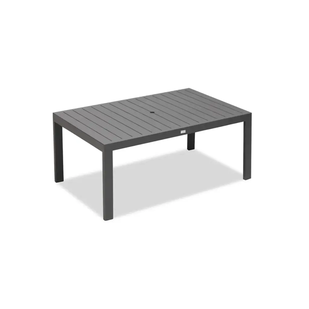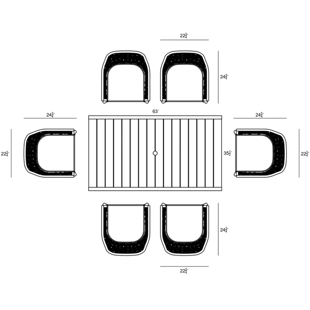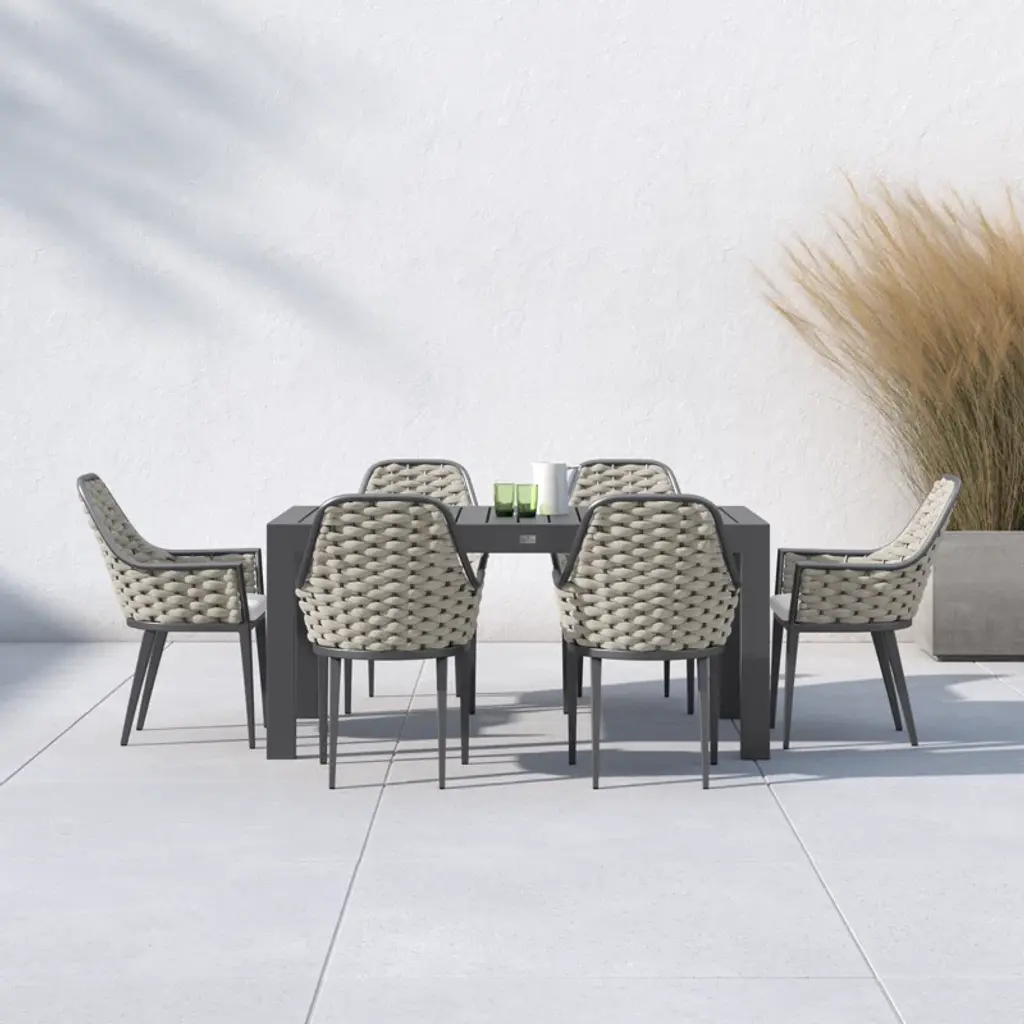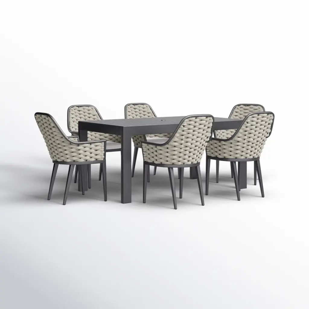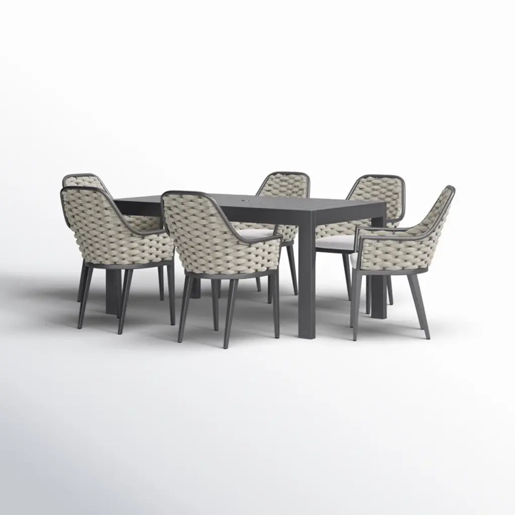 The Jianna Rectangular 6 - Person 63'' L Outdoor Restaurant Dining Set evokes the stately traditions of another era in sleek, modern colors and materials. The dining chair brings a touch of warmth and comfort to your poolside or porch, whether surrounding the dining table or paired with an end table for intimate outdoor conversation. Its fully-welded aluminum frames are treated with a powder-coated finish to ensure lasting performance across the seasons. Beautiful Olefin rope compliment the frames making it both visually appealing and functional. The roping provides comfortable padding, as well as, temperature moderation during hot and cold days. The table evokes the beautiful horizontal simplicity of modern architectural lines. A design-forward combination of the sleek aluminum frame with a slat-style table top provides the perfect complement to any outdoor setting, from beach-side deck to urban rooftop.