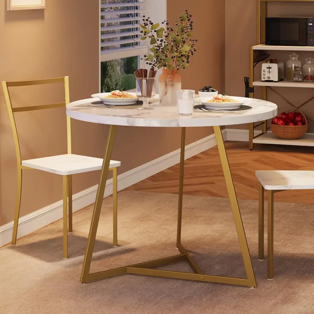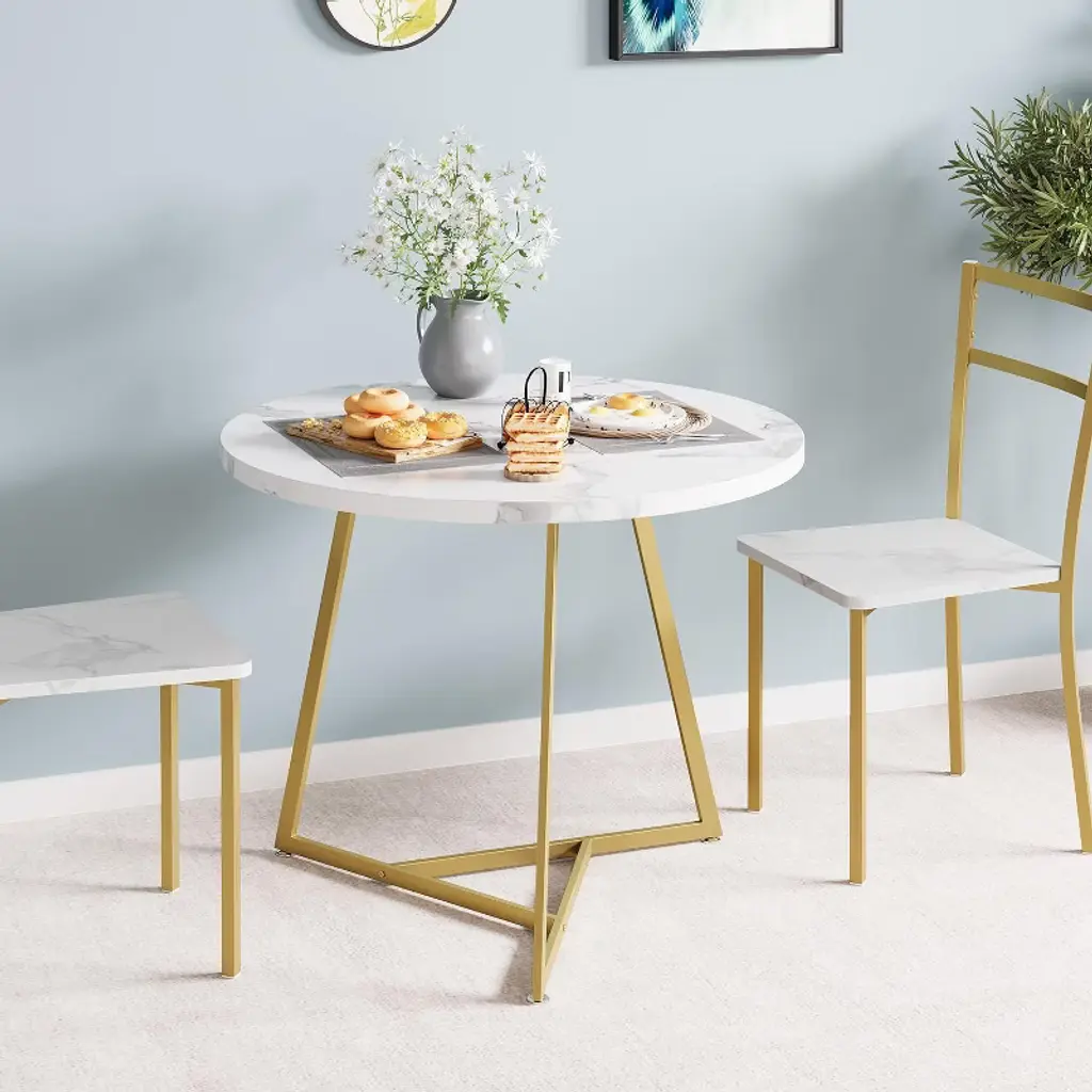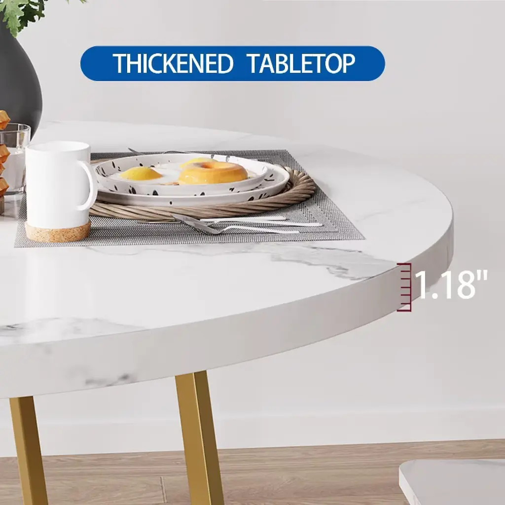 Description Enjoy stylish and cozy meals with this modern round dining table set designed for two. Featuring a thickened marble white MDF tabletop supported by a sturdy metal frame, this set offers lasting durability and stability. The two chairs are crafted with premium MDF board and reinforced solid steel frames, outfitted with thick, plush cushions for superior comfort. Thanks to the space-saving design, the chairs tuck neatly under the 31.42 diameter table, ideal for condos, studios, or smaller kitchens. Easy to clean with a waterproof and anti-corrosive surface coating, this set promises years of functional, hassle-free use. Assembly is simple with all hardware and illustrated instructions included, enabling you to set up your elegant dining space quickly. Product Details Table Dimensions: 31.42 Diameter x 29.52 Height Chair Dimensions: 17.72 L x 15.32 W x 33.12 H Material: MDF Board, Metal Frame, Plush Cushions Item Weight: 35.9 Pounds Shape: Round Assembly Required: Yes What You Get When You Buy 1 x Round Dining Table with Marble White MDF Top 2 x Upholstered Dining Chairs with Sturdy Metal Frames Assembly Hardware and Tools Illustrated Assembly Instructions Customer Support Contact Ideal For Small apartments, condos, studios, or kitchens seeking a space-efficient dining set Couples or roommates wanting comfortable seating with modern design Users valuing durable construction and easy maintenance surfaces Those needing quick assembly furniture with responsive customer support After-Sales Service 【Dedicated Support】: Customer service available for assembly help and inquiries. 【Warranty & Repairs】: Warranty coverage ensuring product longevity and customer satisfaction. 【Easy Assembly】: Includes clear instructions and all hardware for quick, straightforward setup.