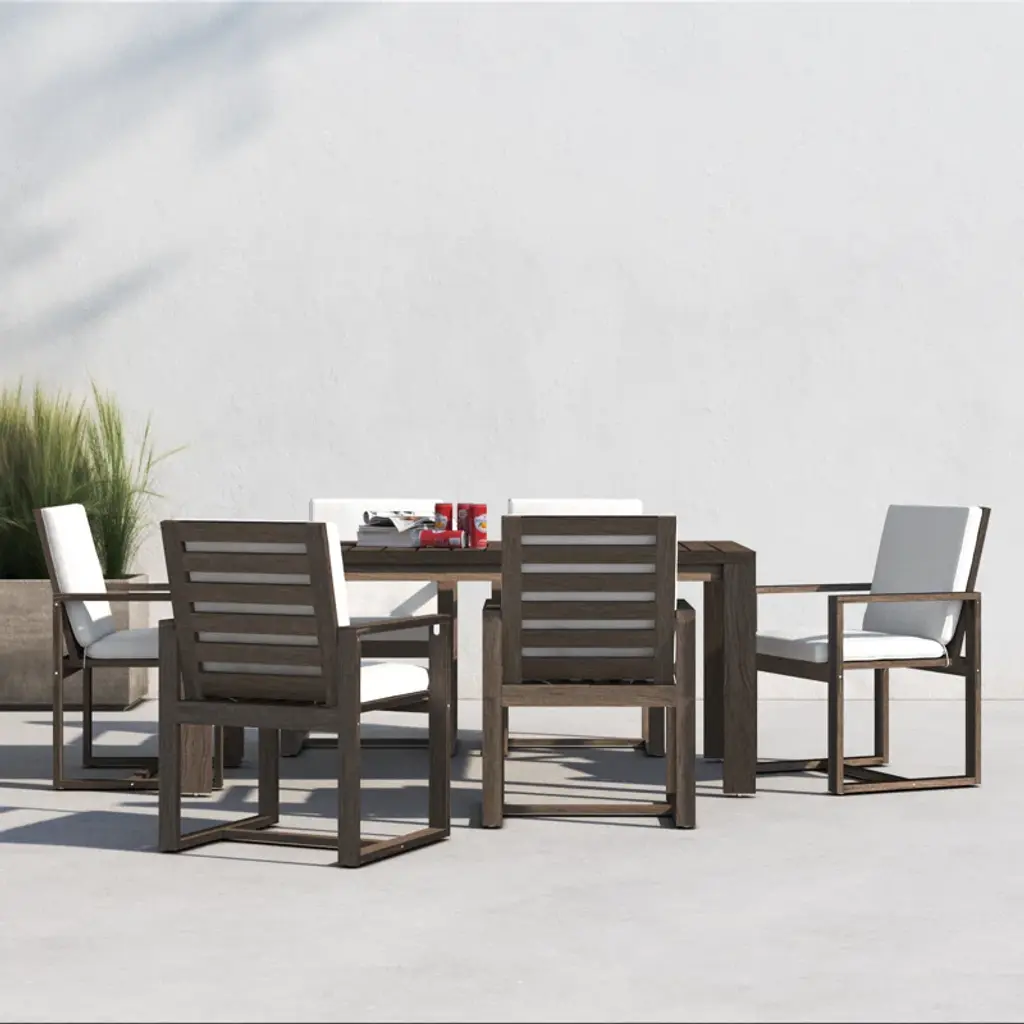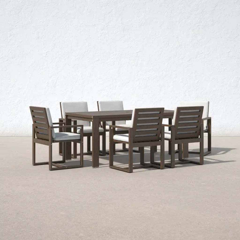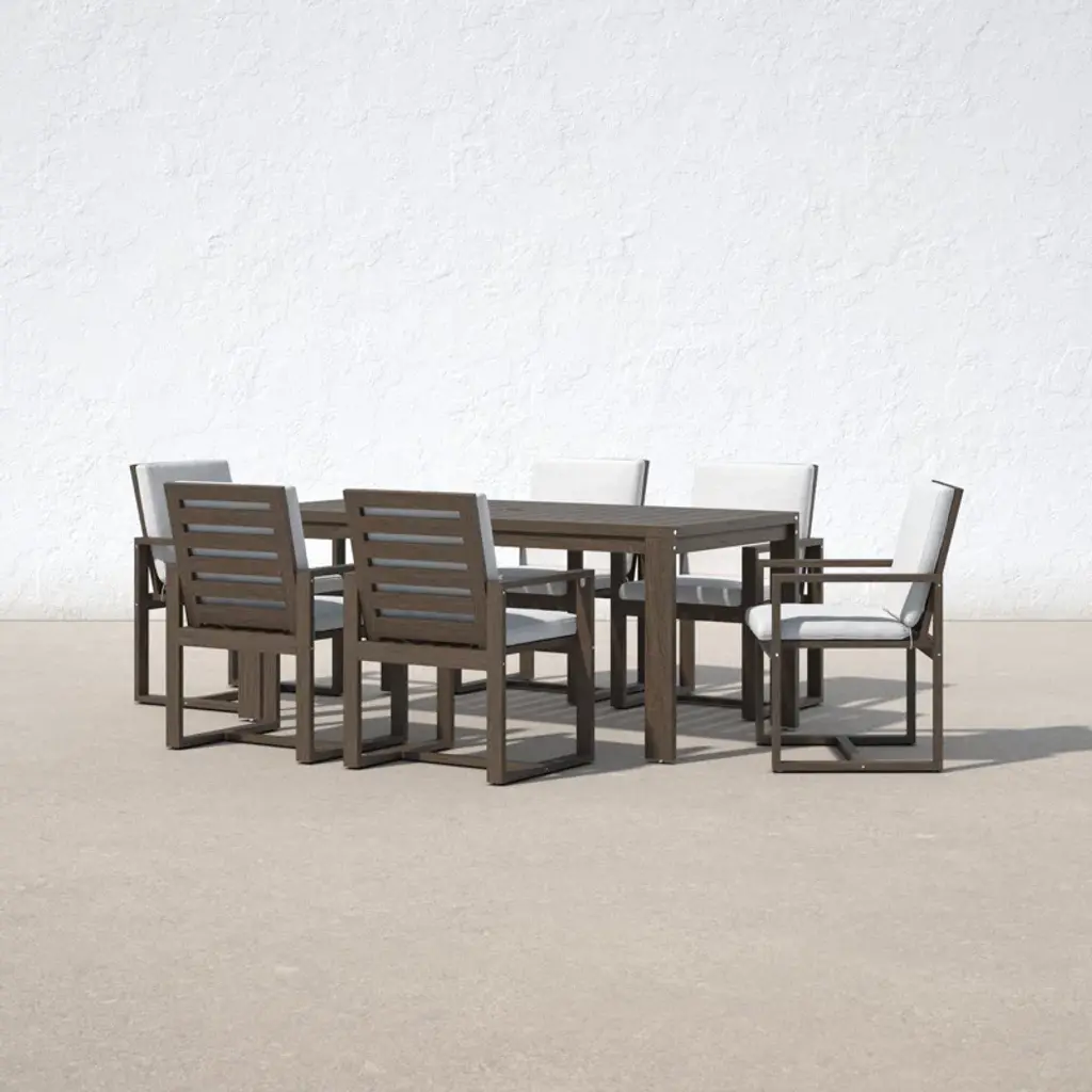 Contemporary coastal. Built from solid eucalyptus wood, this seven-piece outdoor dining set grounds clean modern lines with neutral hues + organic wood grains. Each piece is designed to stand up to weather, water, and UV-rays. Six chairs are softened by cushions in removable covers, while the table’s slatted top prevents puddles + offers a classic backyard look. An umbrella hole invites you to add your own shade on hot summer days.