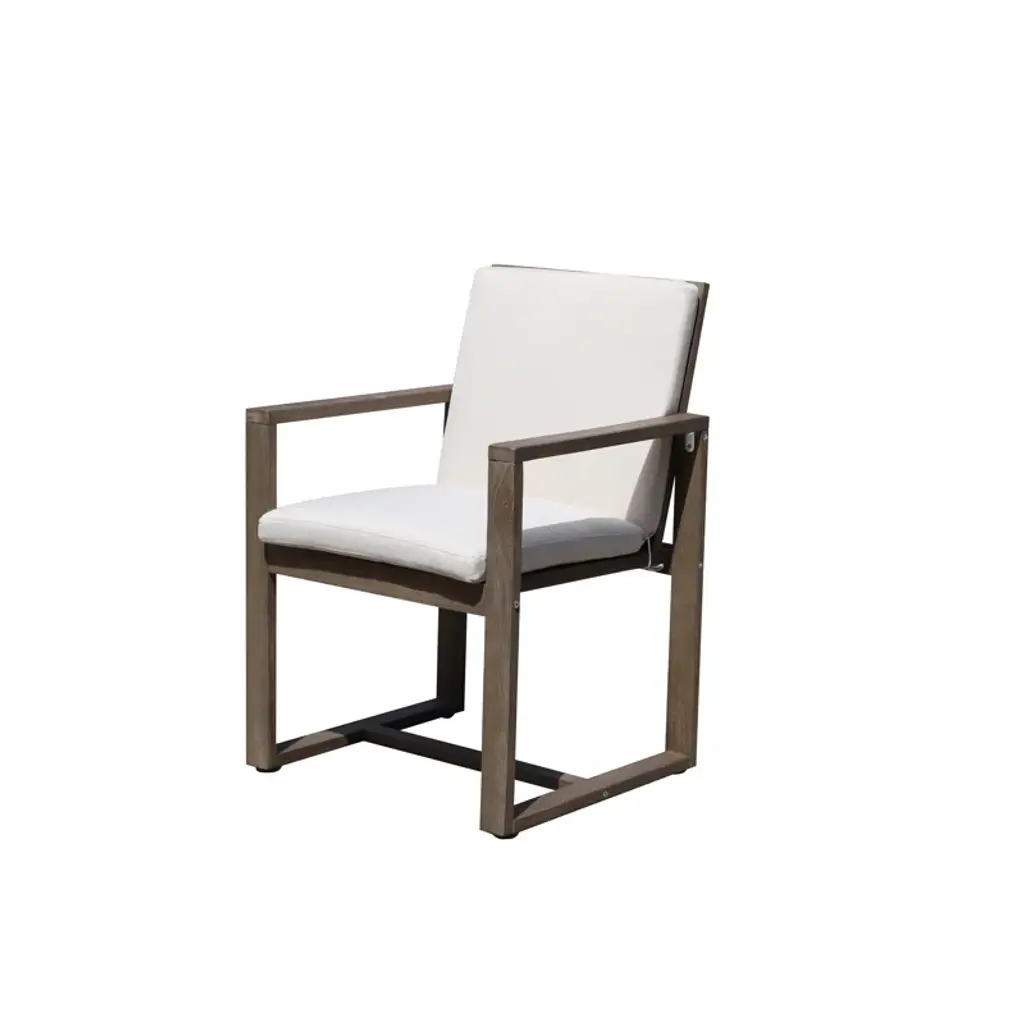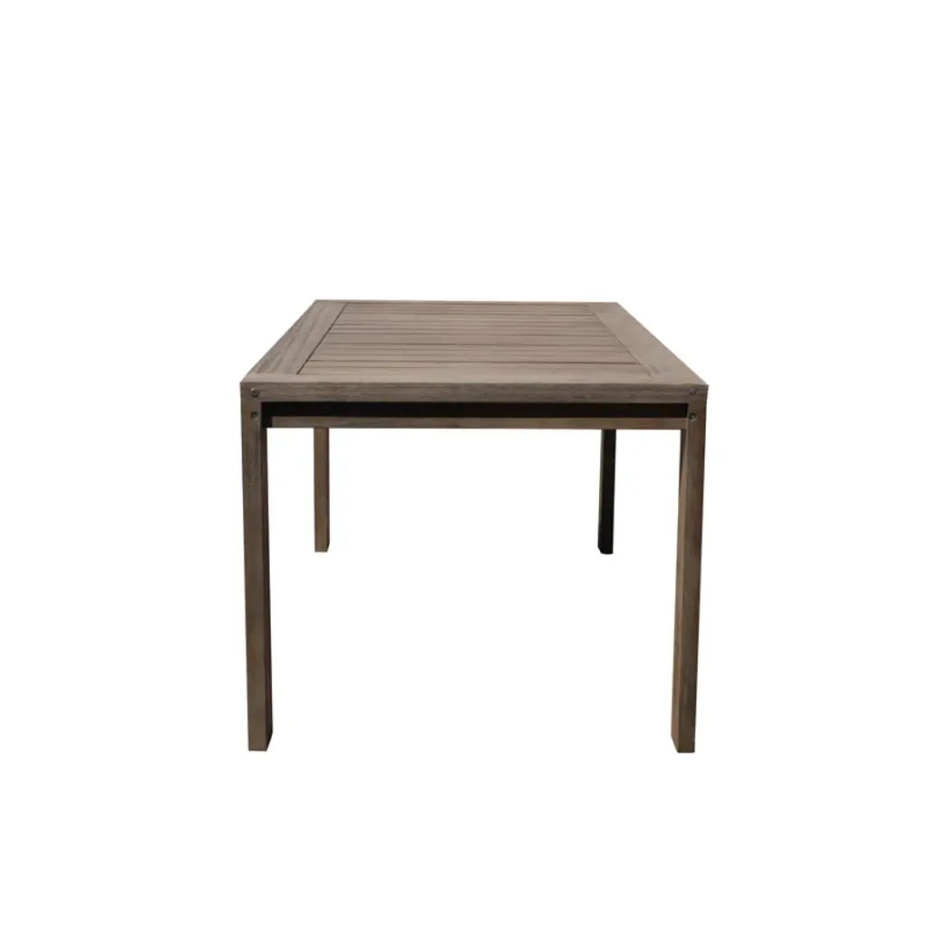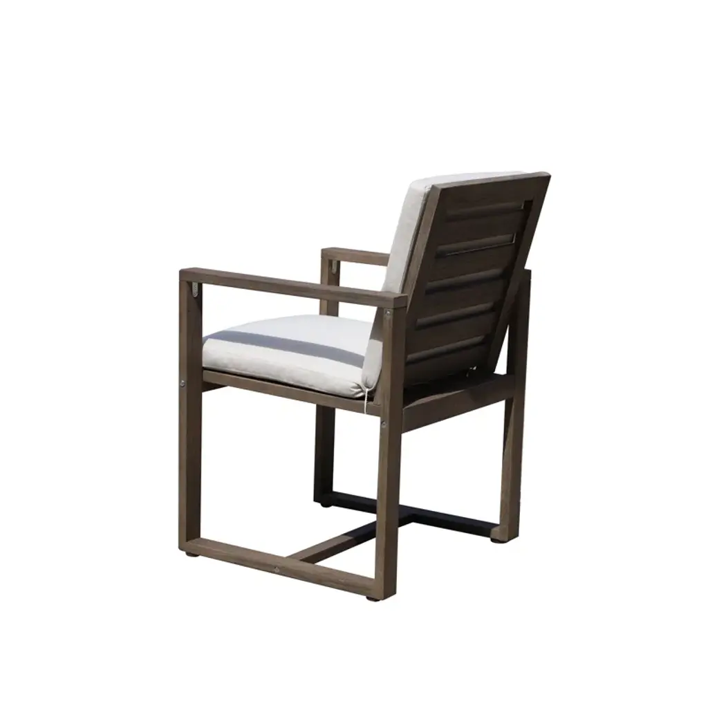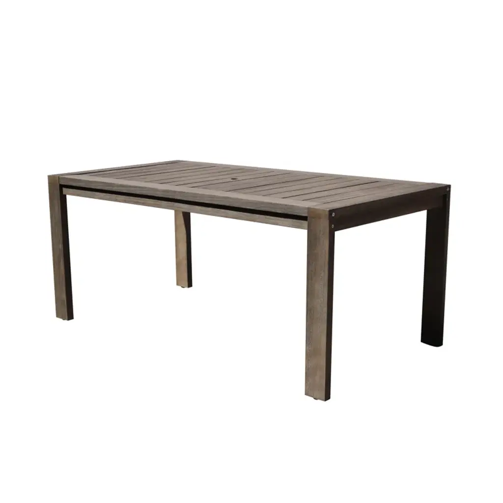 Contemporary coastal. Built from solid eucalyptus wood, this seven-piece outdoor dining set grounds clean modern lines with neutral hues + organic wood grains. Each piece is designed to stand up to weather, water, and UV-rays. Six chairs are softened by cushions in removable covers, while the table’s slatted top prevents puddles + offers a classic backyard look. An umbrella hole invites you to add your own shade on hot summer days.