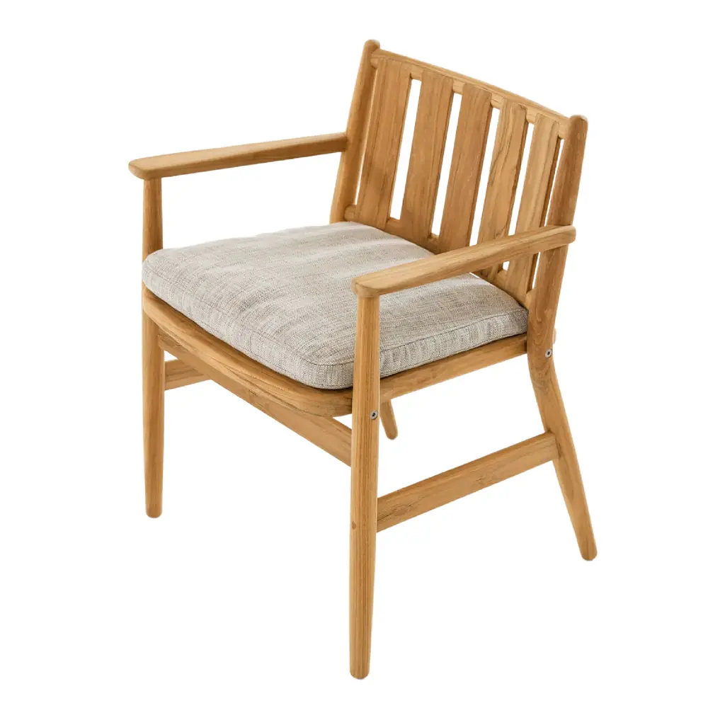 Contemporary coastal. Built from solid acacia wood, this nine-piece outdoor dining set grounds clean modern lines with neutral hues + organic wood grains. Each piece is designed to stand up to weather, water, and UV-rays. Eight chairs feature breezy rope accents + reversible cushions in removable covers. The table’s slatted top offers a classic backyard look – and lets rainwater fall right through.