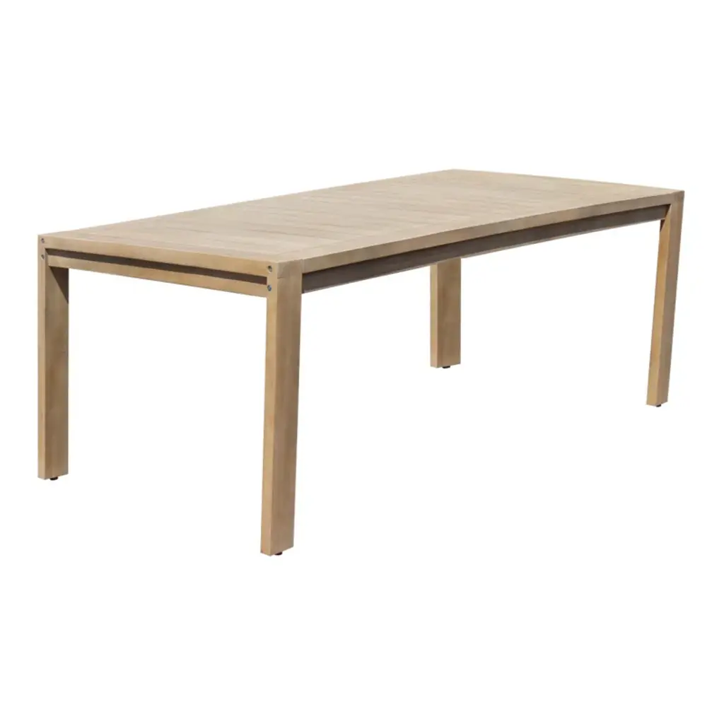 Contemporary coastal. Built from solid acacia wood, this nine-piece outdoor dining set grounds clean modern lines with neutral hues + organic wood grains. Each piece is designed to stand up to weather, water, and UV-rays. Eight chairs feature breezy rope accents + reversible cushions in removable covers. The table’s slatted top offers a classic backyard look – and lets rainwater fall right through.