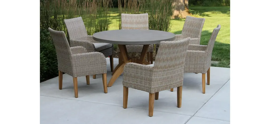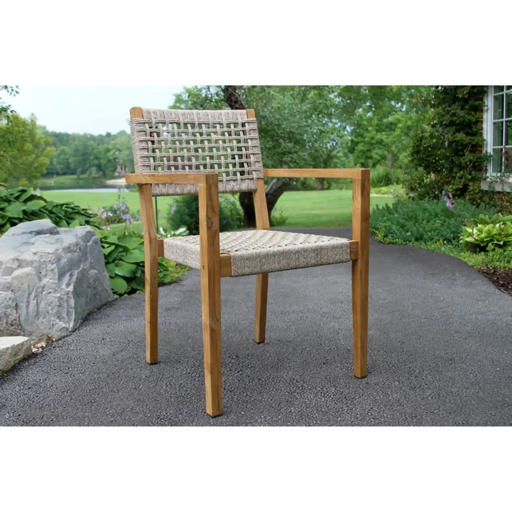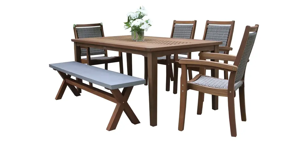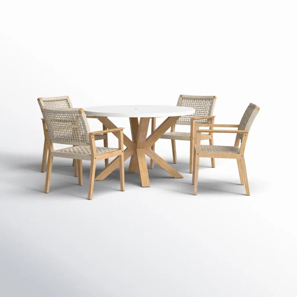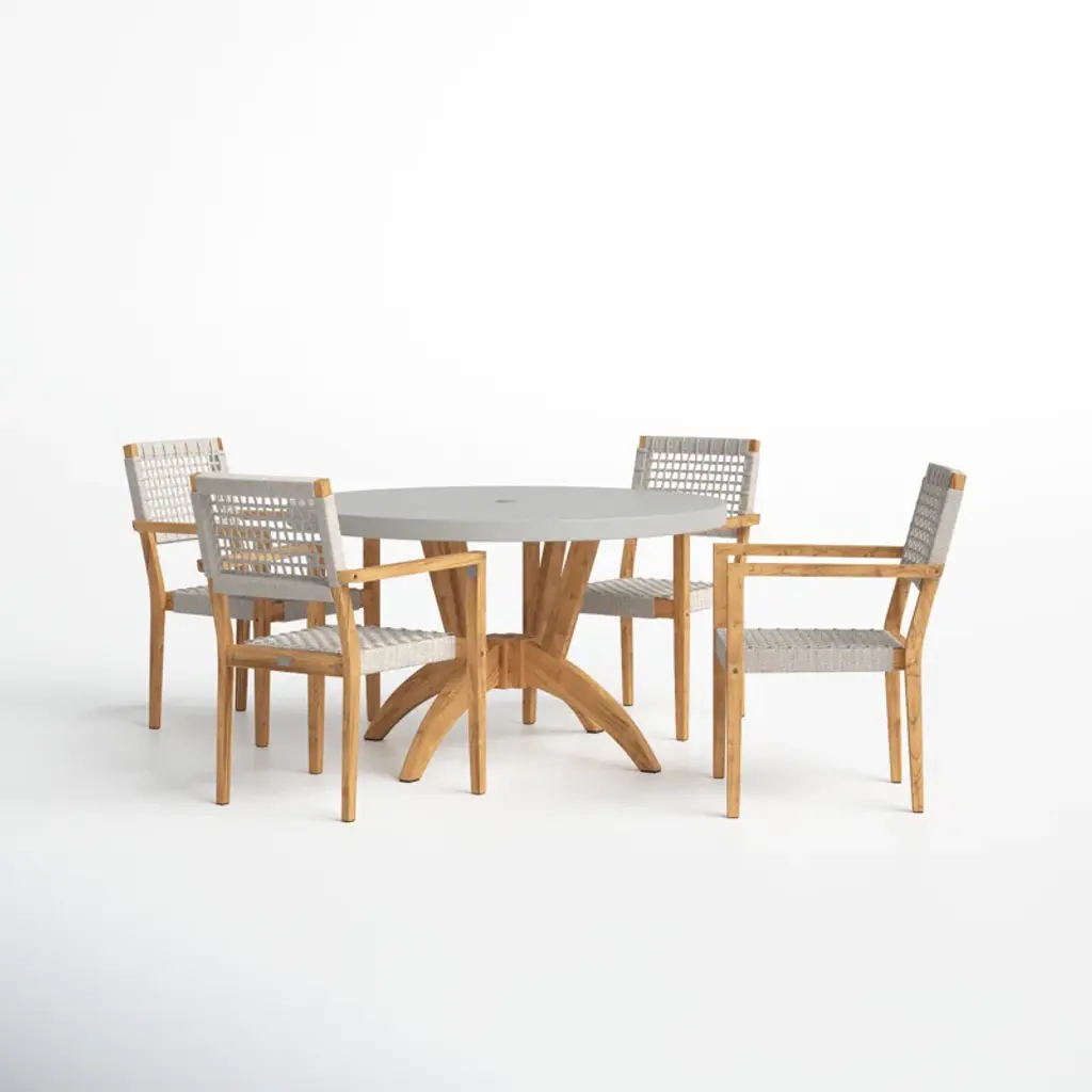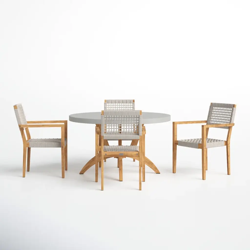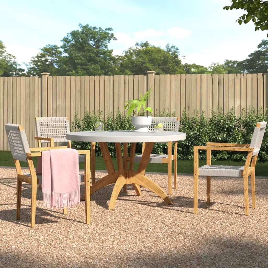This 5-piece dining set instantly creates the perfect outdoor space for gathering family and friends. The set includes four all-weather rope stacking chairs and one round table. The base of each piece is made from weather- and UV-resistant solid teak wood with a natural golden glow. We love the complementing gray stone surface of the table that adds to the coastal charm.