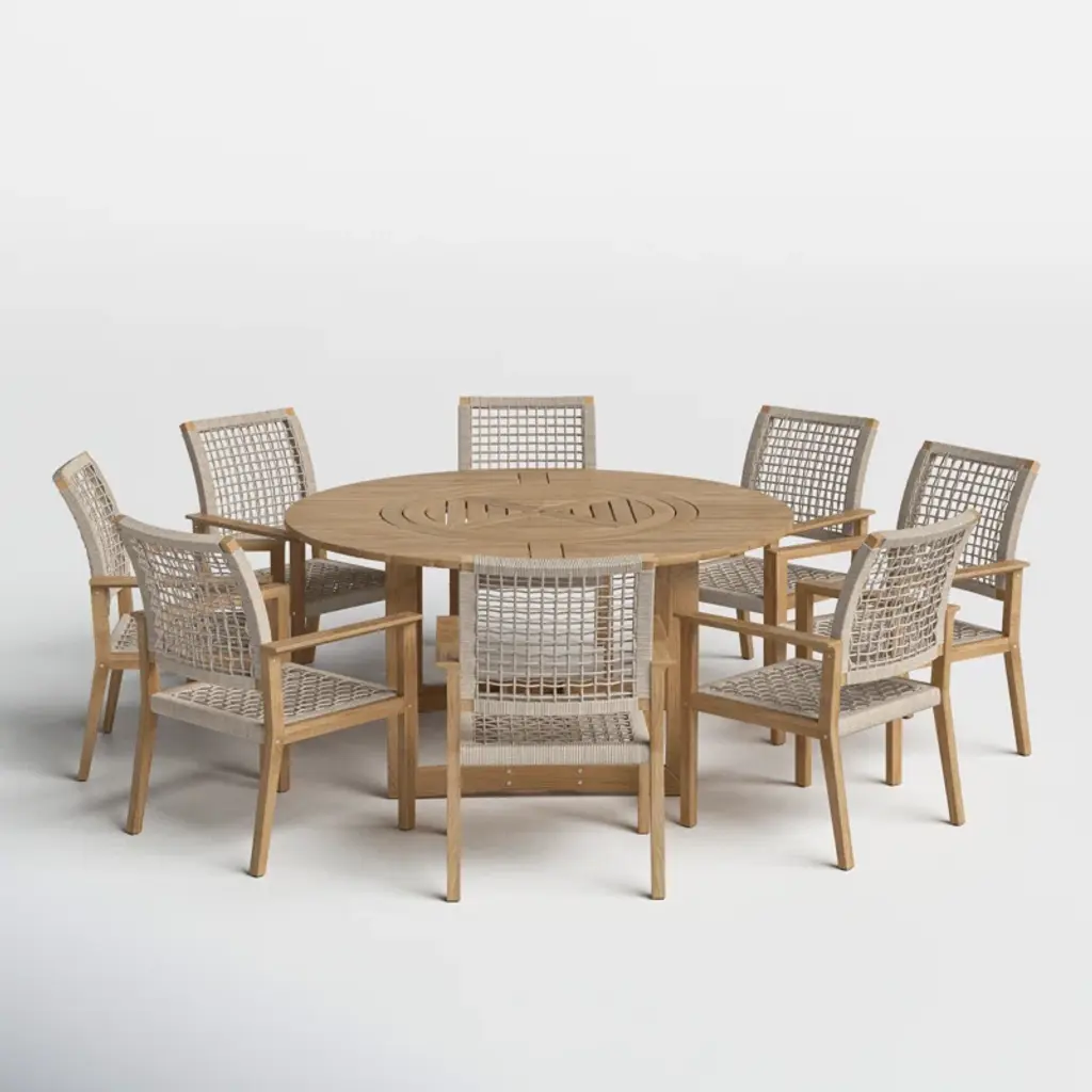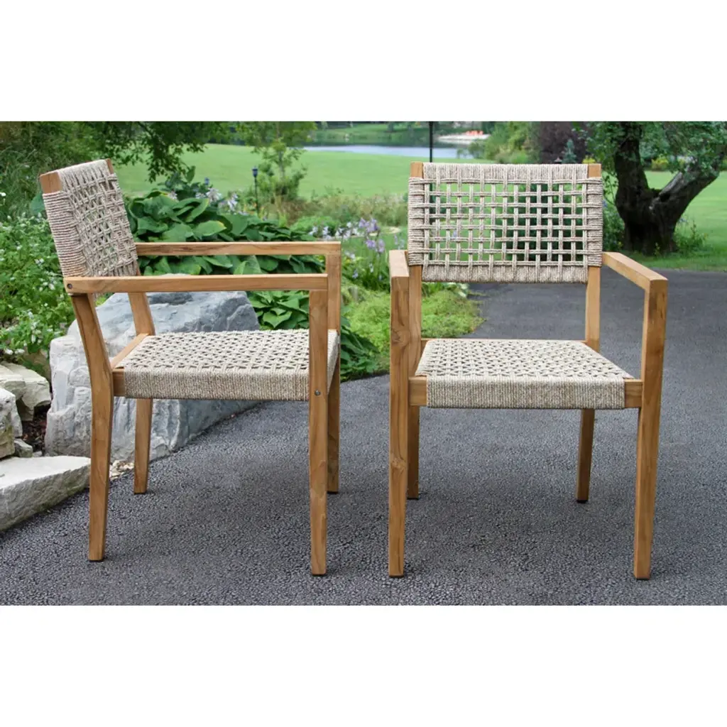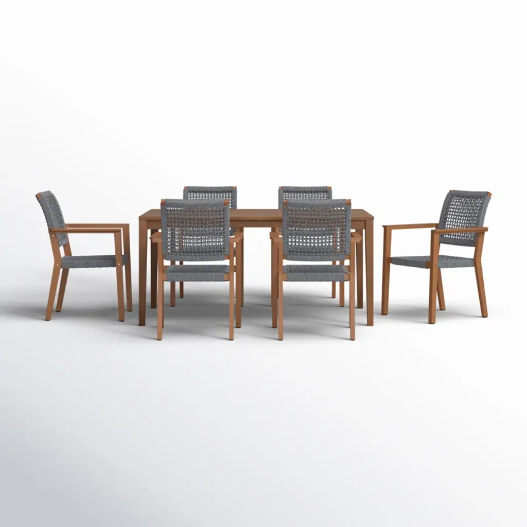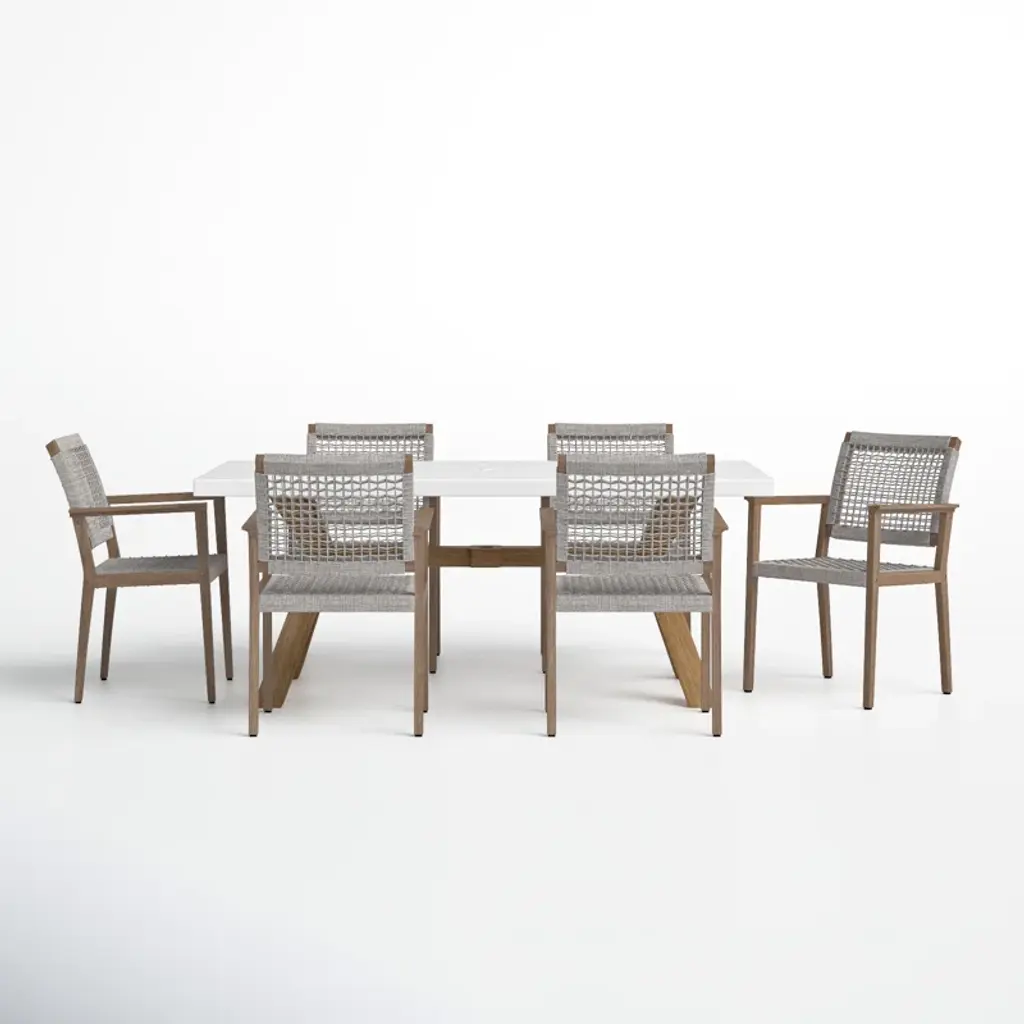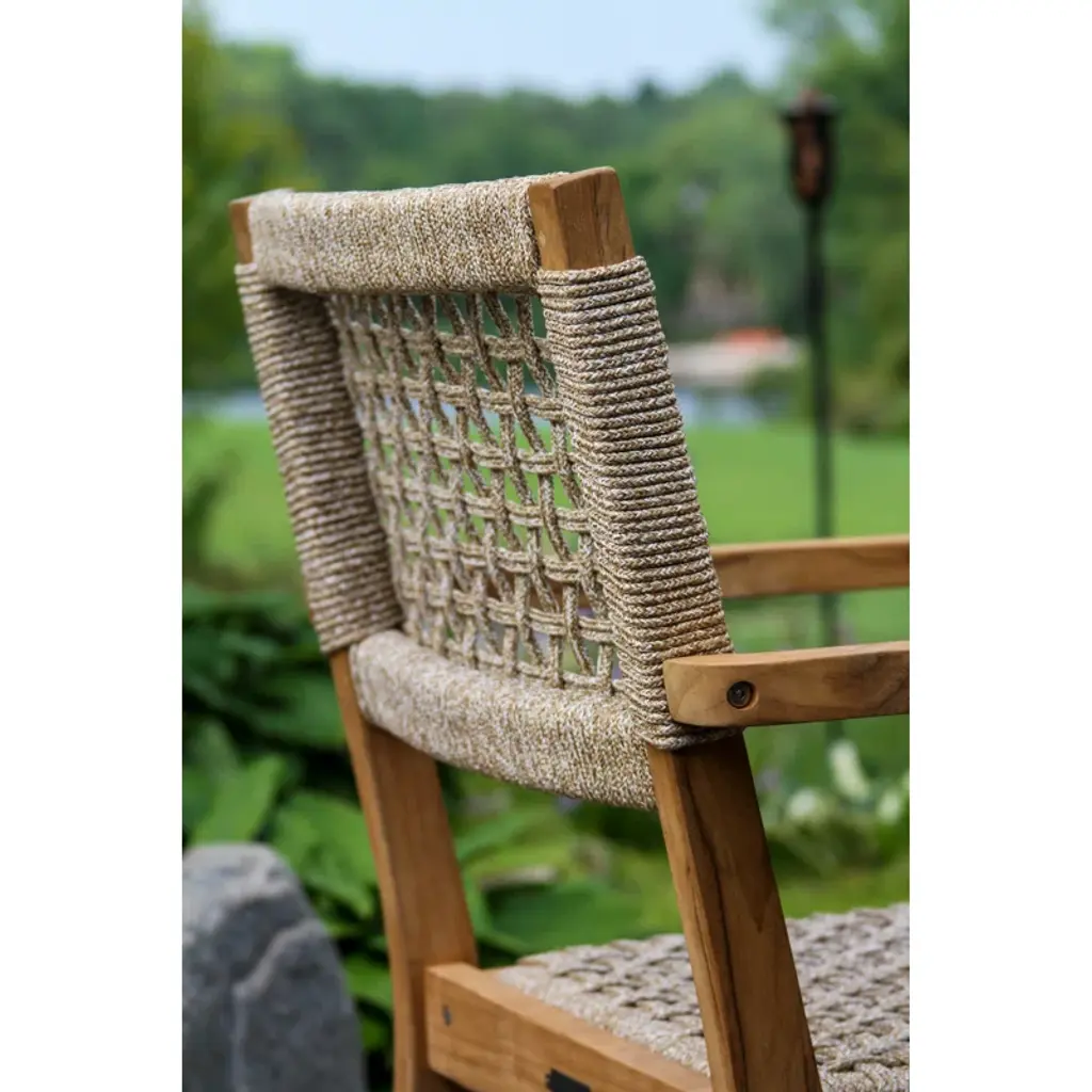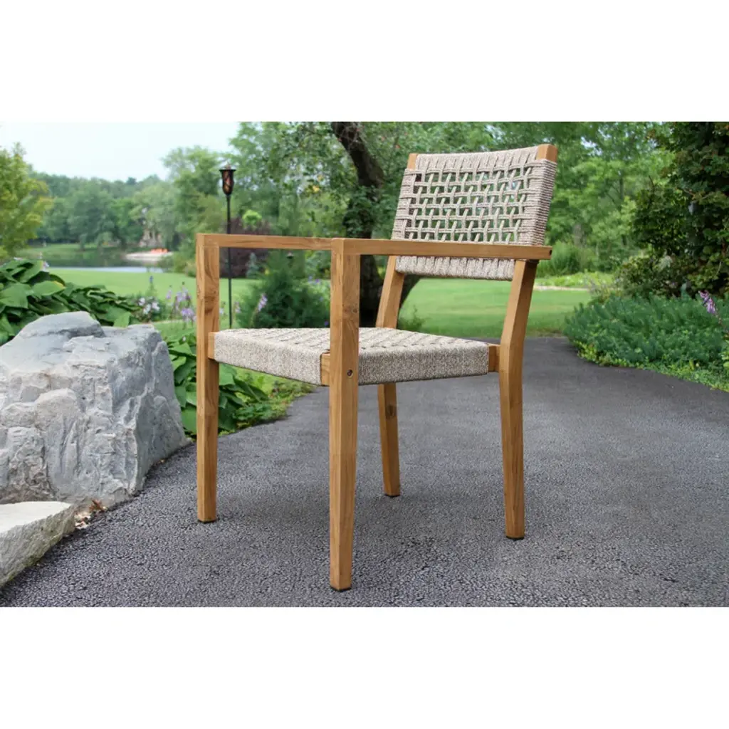 This 5-piece dining set instantly creates the perfect outdoor space for gathering family and friends. The set includes four all-weather rope stacking chairs and one round table. The base of each piece is made from weather- and UV-resistant solid teak wood with a natural golden glow. We love the complementing gray stone surface of the table that adds to the coastal charm.