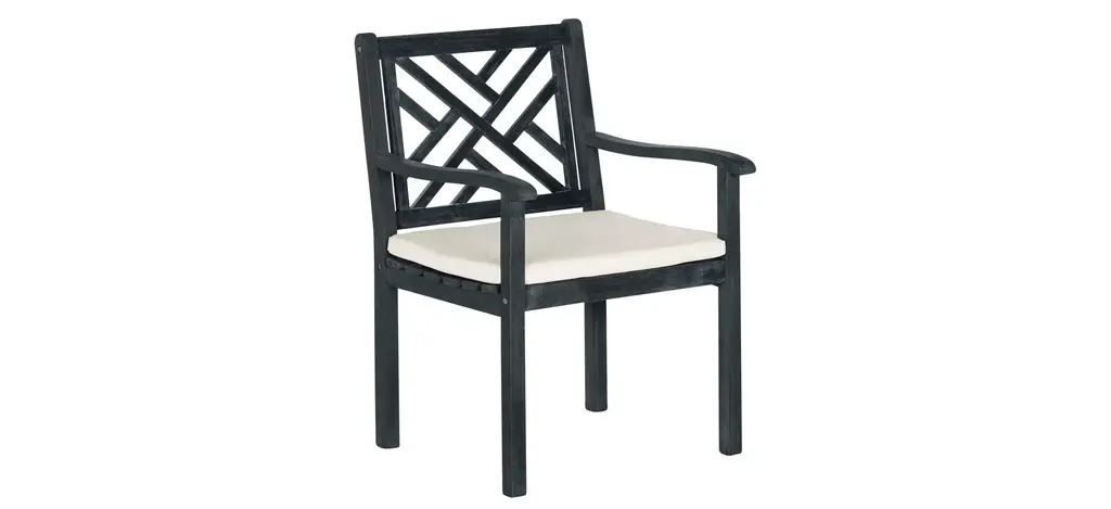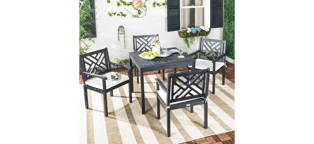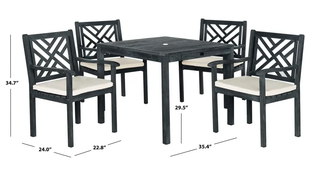 Add contemporary flair to your patio or deck with the Kaylee 5-pc. Outdoor Dining Set in sustainable finished acacia wood. Comfortable arm chairs with all weather cushions boast tasteful crosshatch backs for luxe outdoor dining.