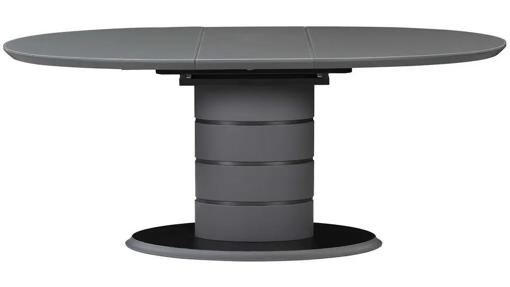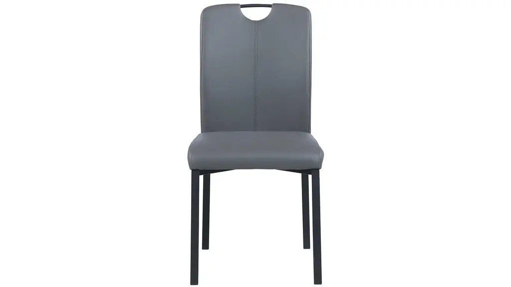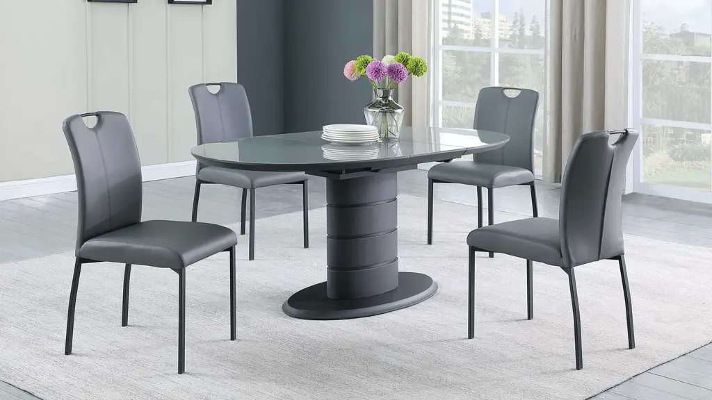 Kendra 5-pc. Dining Set features a table that opens to 71" with butterfly mechanism, an Art Deco strip pedestal base, & 4 side chairs with a handle back design, gray faux leather upholstery, and metal legs in a matte black finish.
