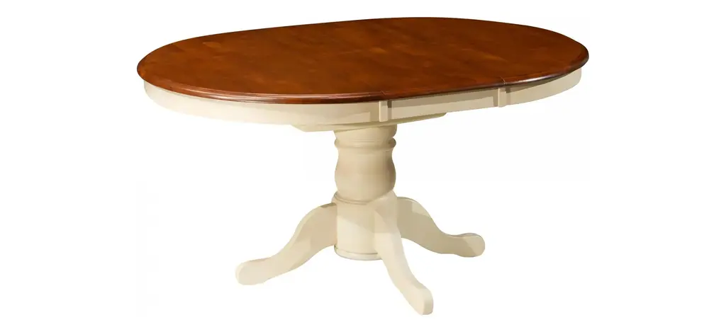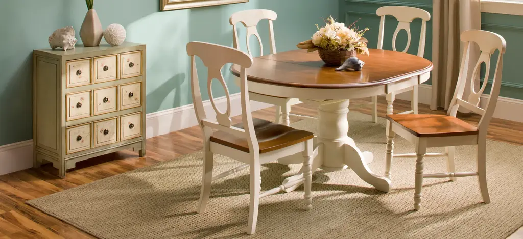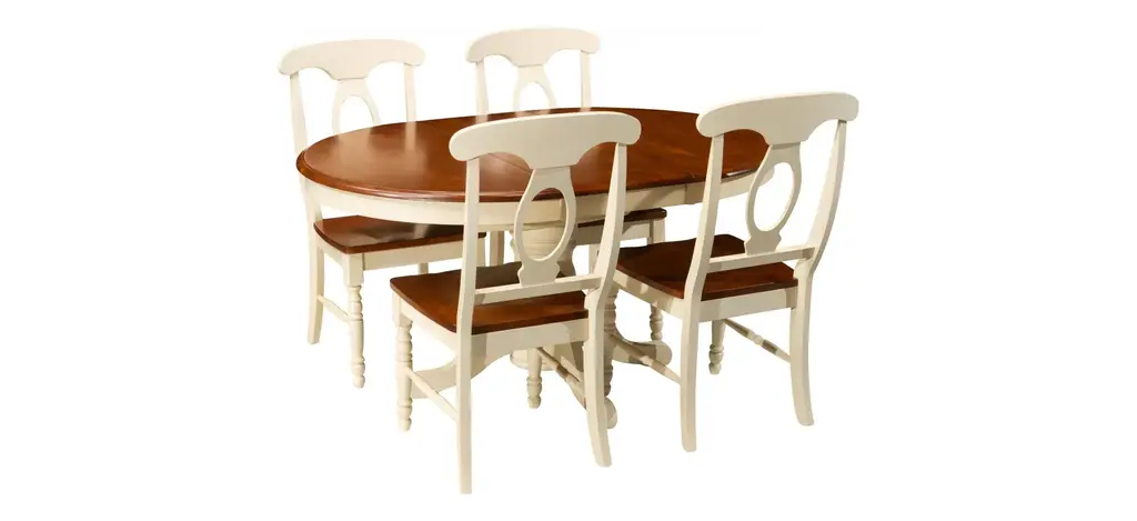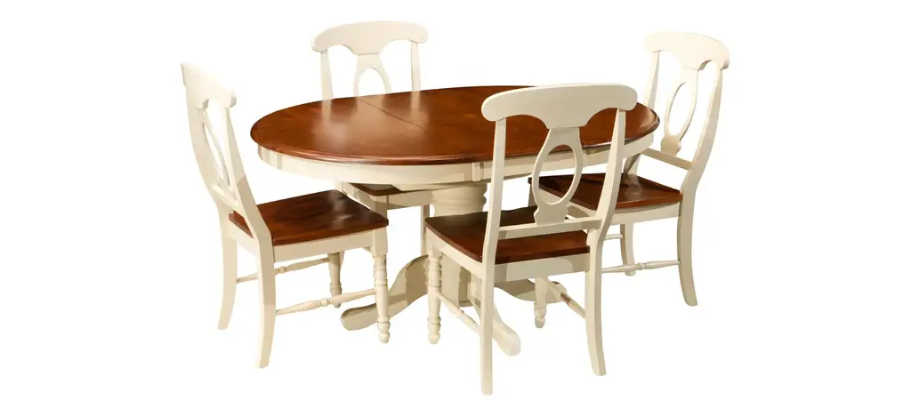 The best part about this Kenton II 5-pc. dining set may be its ability to mix and match styles so well! Its dark walnut and buttermilk finishes serve up a casual two-toned look, plus its smaller scaling makes it a smart choice for an eat-in kitchen or breakfast nook. But this dining set also features more formal design elements, like a gorgeous pedestal table base and keyhole chair backs. And if youre space conscious, youll appreciate the tables self-storing butterfly leafit provides extra table space when you need it and can easily be stowed out of sight when you dont!