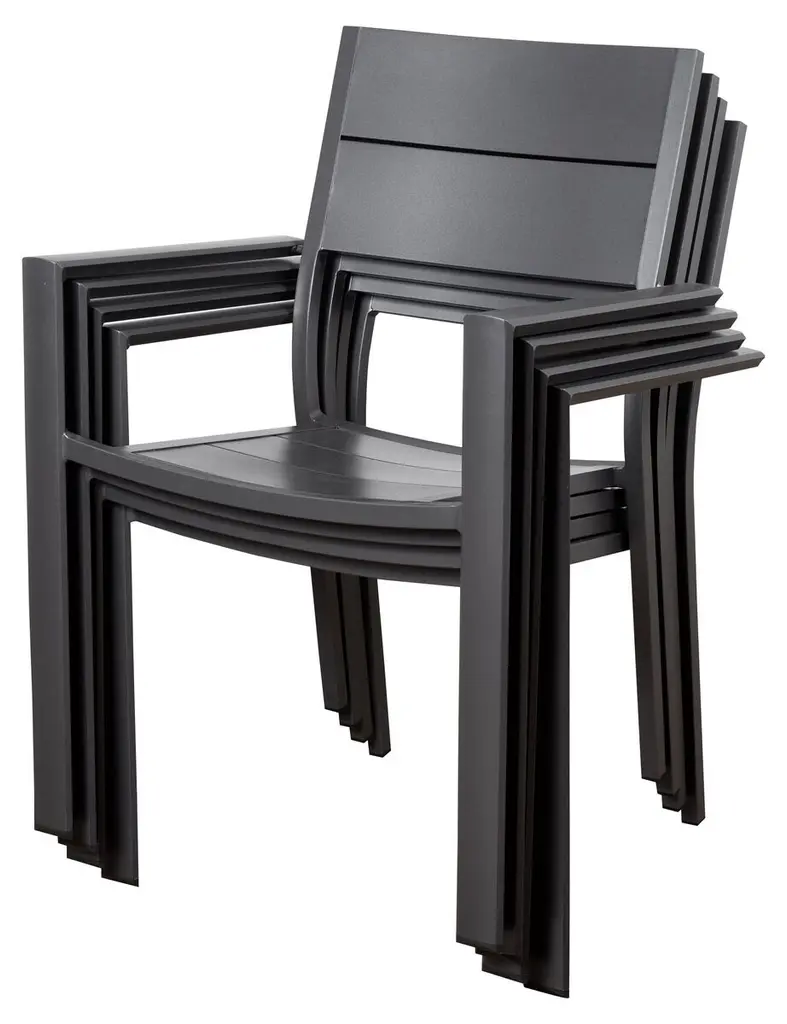 This dining set makes a stylish addition to your favorite outdoor space. Simple and lightweight in a conveniently stackable design, the armchairs feature rust-resistant aluminum frames that are coated in Duracoat, a polymer-based, multilayer coating that ensures protection from the elements. The table is crafted of teak with a slatted top and central cutout for adding an umbrella.