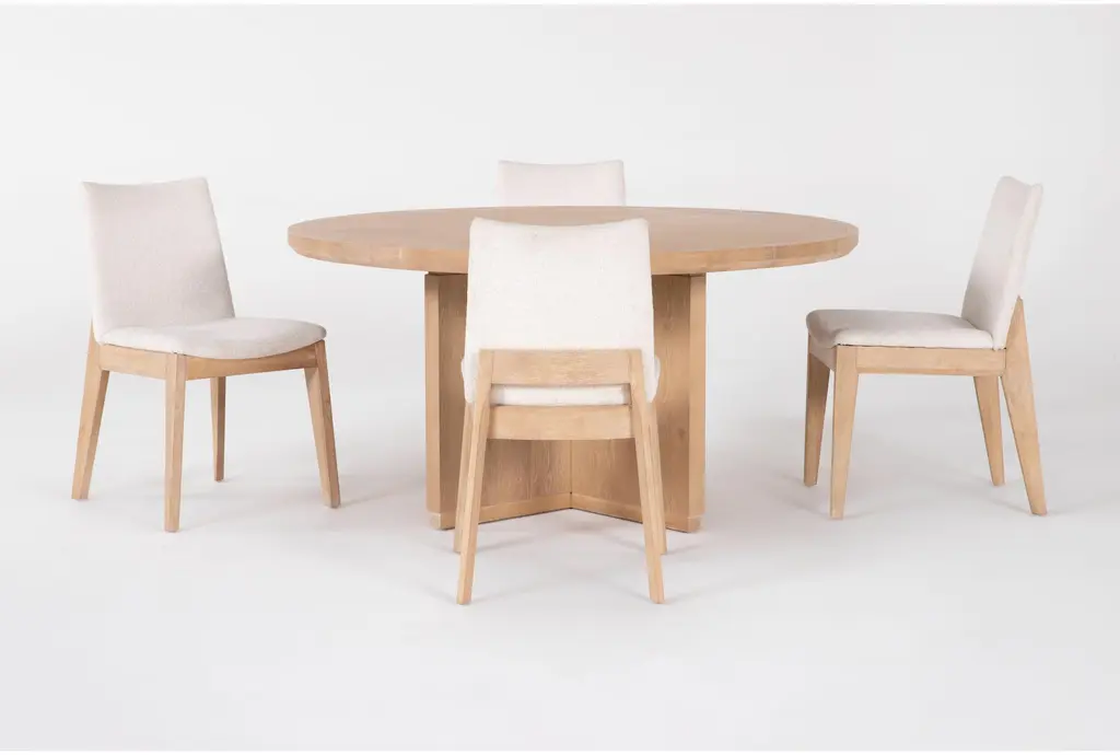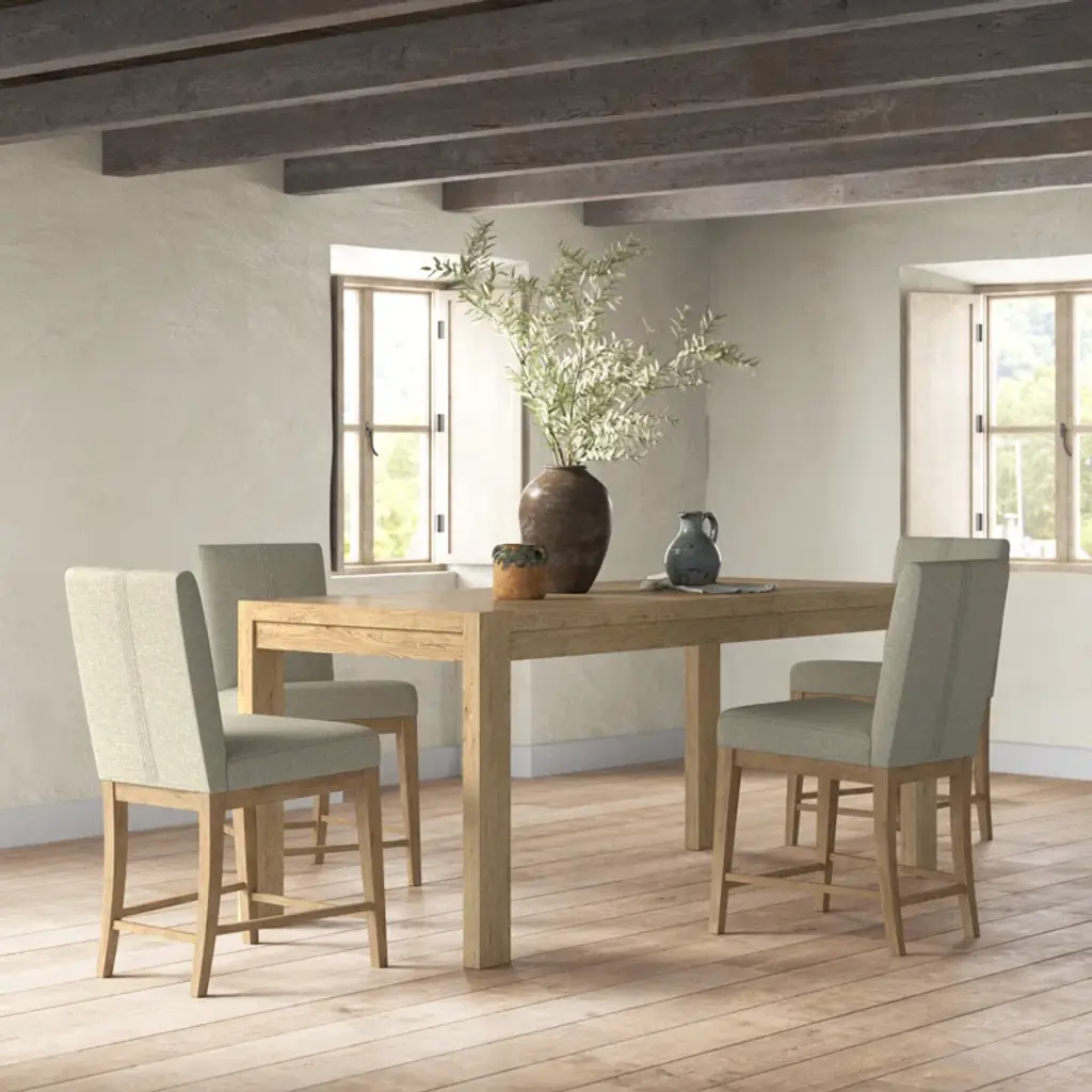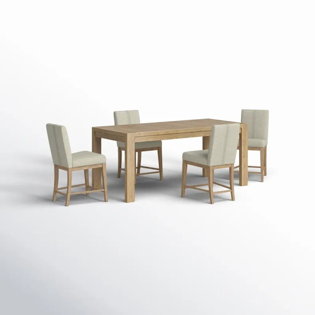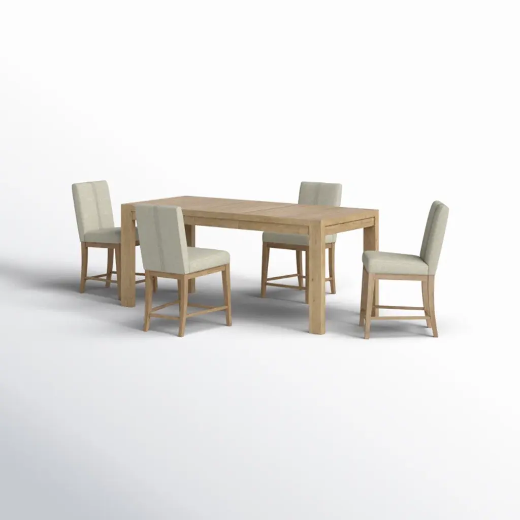 Gather around for a delightful dining experience with this five-piece extendable dining set. Crafted from a mix of solid and engineered wood, the rectangular table features a removable leaf, allowing you to easily accommodate extra guests when needed. Four matching chairs, with foam-filled upholstered seats, provide a cozy spot for everyone to enjoy their meal. The timeless design and neutral finish make this set a versatile addition to your dining space. Just add your favorite tablecloth and centerpiece to complete the look.