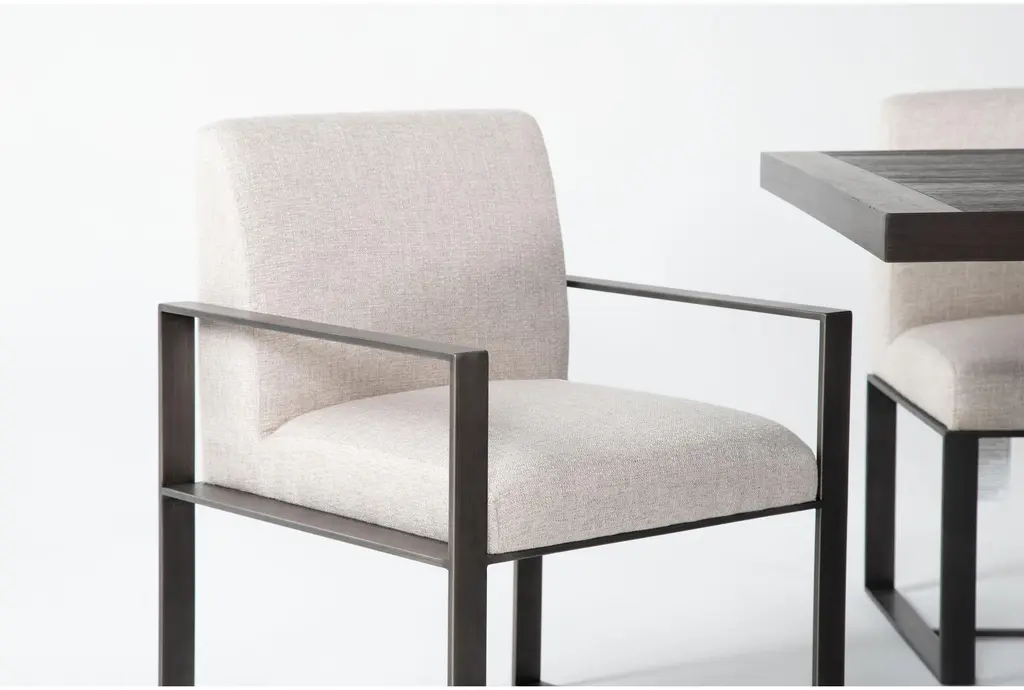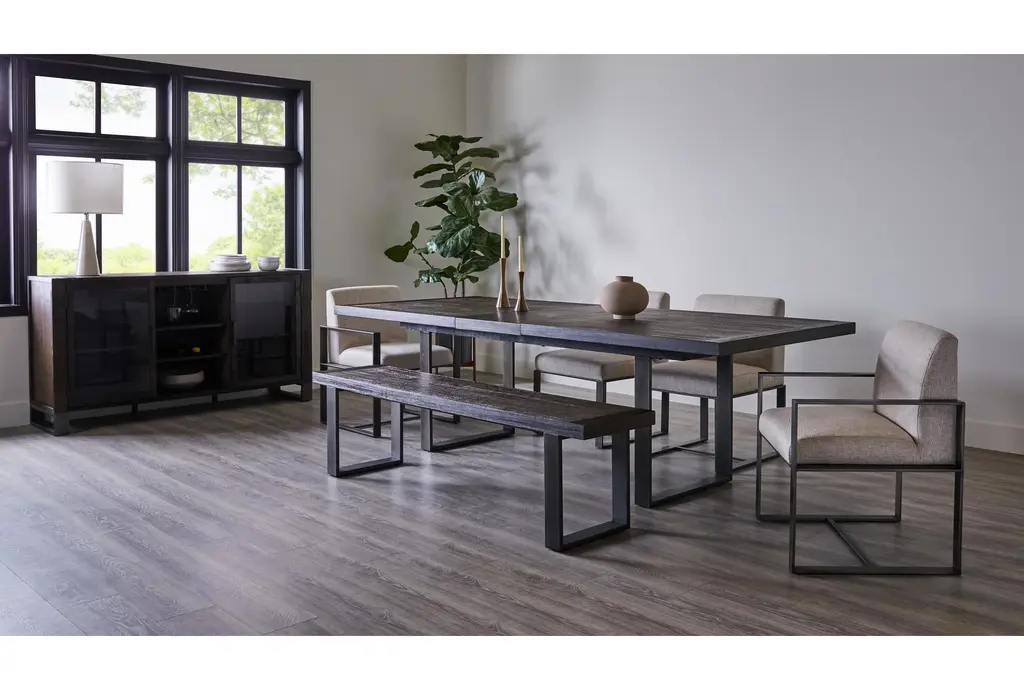 Discover a compelling marriage of materials in our Lars dining collection, which showcases the combination of metal, wood and fabric in all its glory. Designed and developed by Living Spaces, these streamlined designs feature sleek steel with solid wood and acacia veneers to create a dark and handsome look that will enrich your space. Whether you want to lean more rustic or industrial in style, these pieces will play the role to perfection. The table boasts an 18” extension leaf that allows more guests to gather.