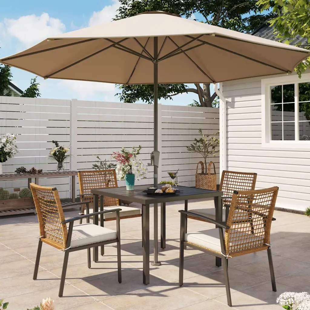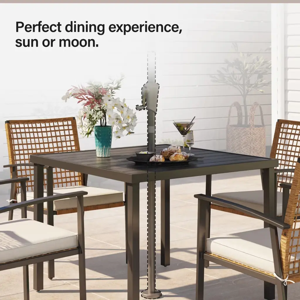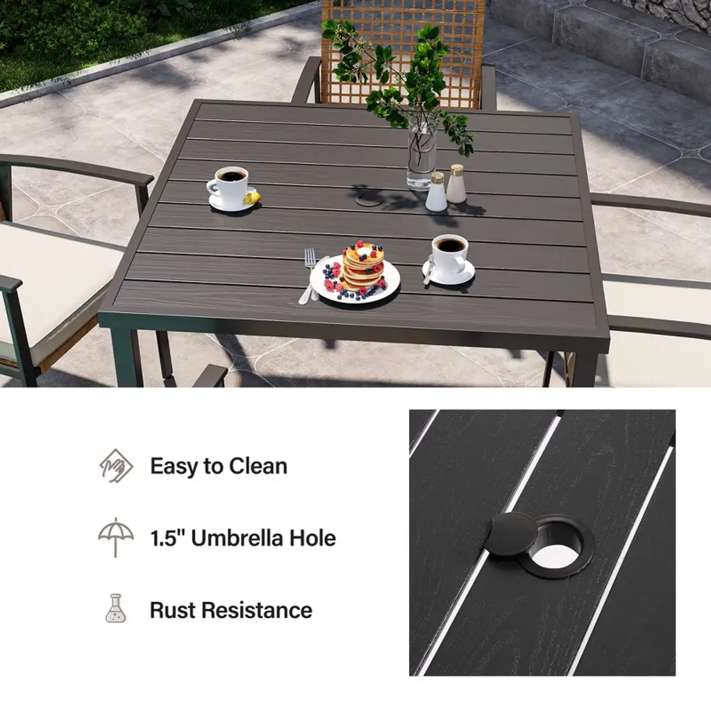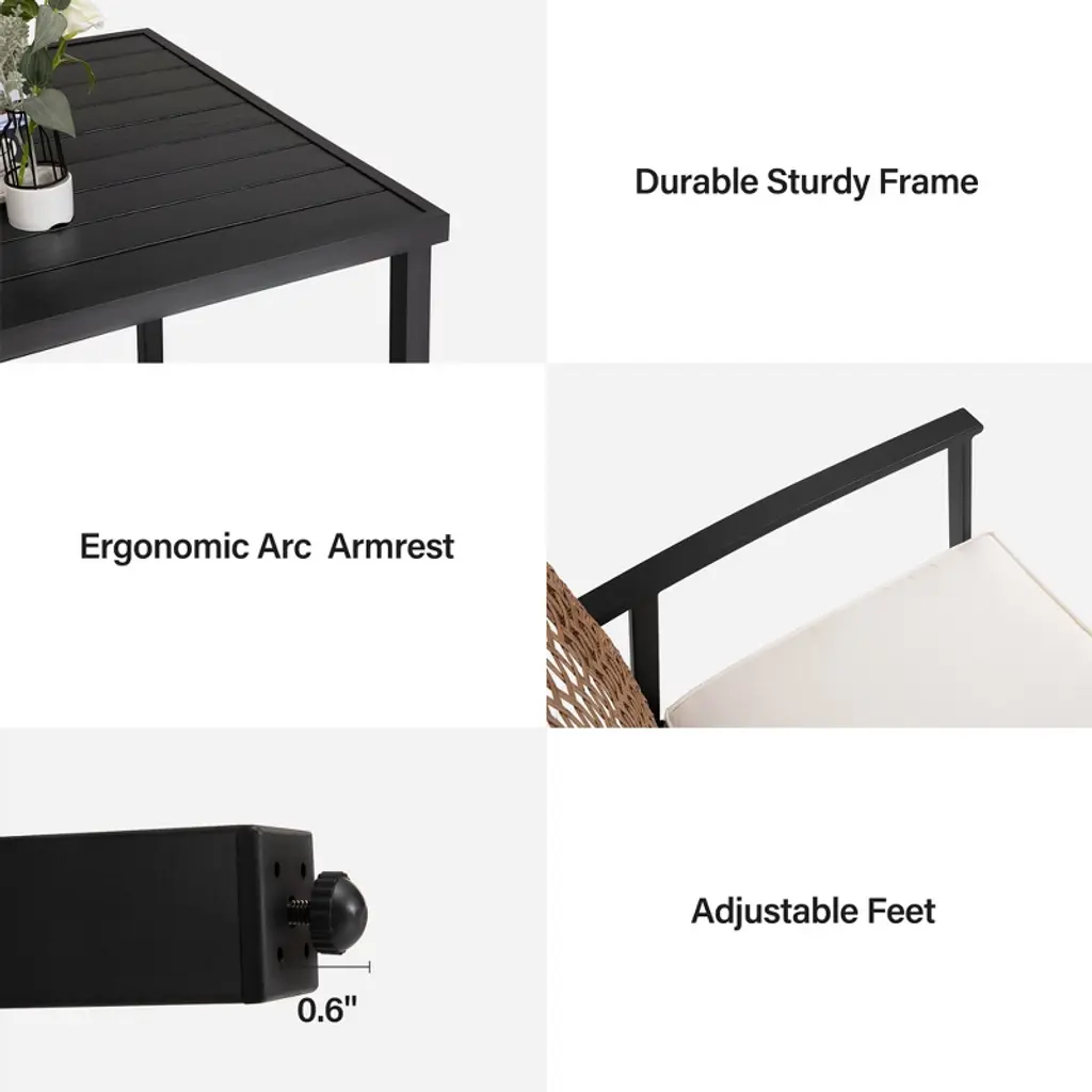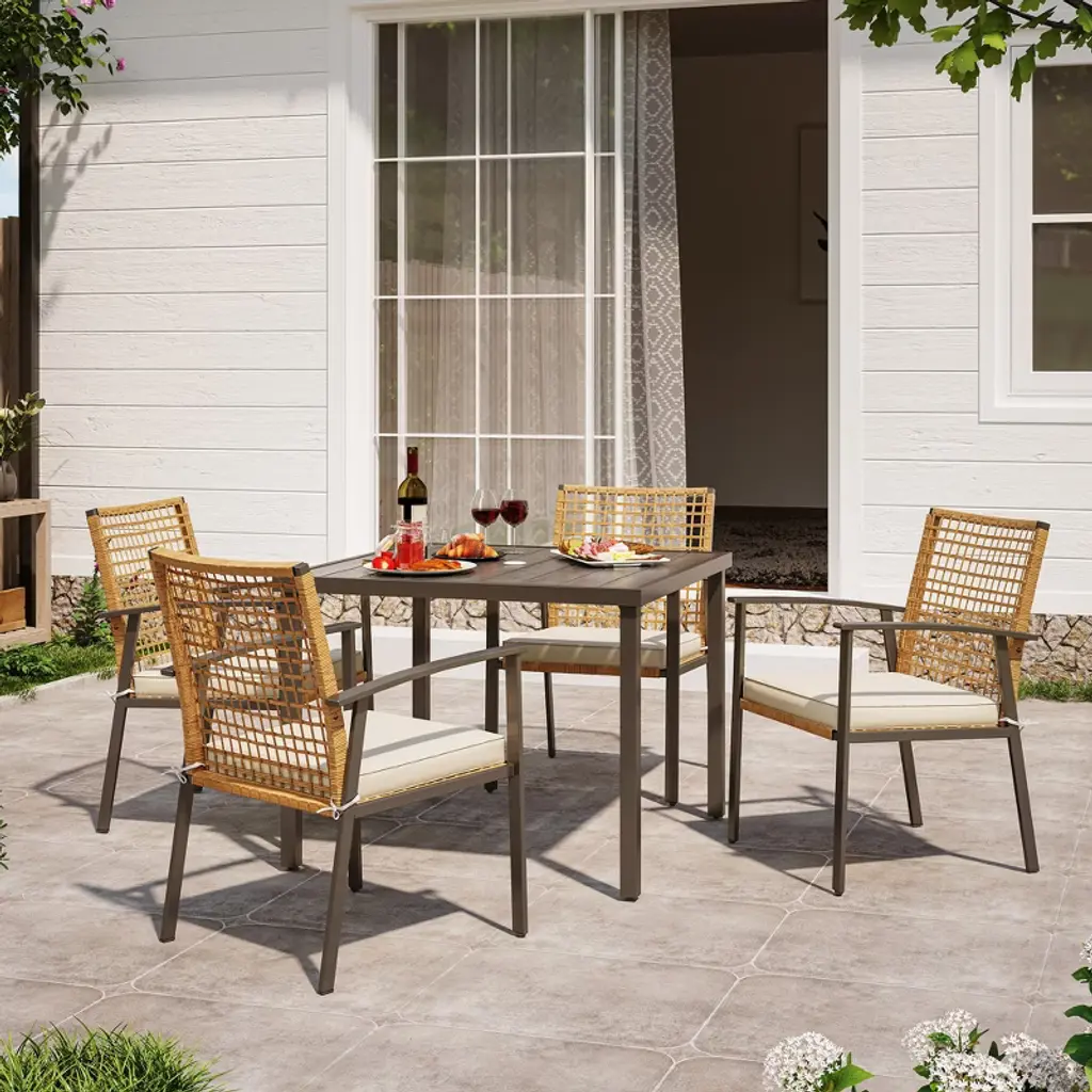 The Perfect Outdoor Dining Solution Comfortable and Stylish Weather Resistant and Durable Enhanced Comfort Spacious Dining Table Easy to Use and Maintain Elevate your outdoor dining experience with our Healing Chic 5 Pieces Outdoor Patio Dining Set. Enjoy the perfect blend of comfort, style, and durability.