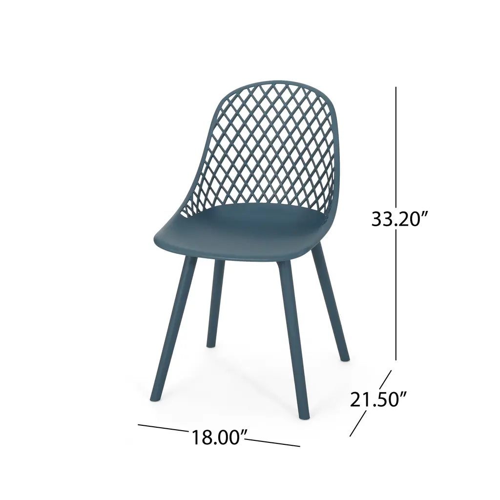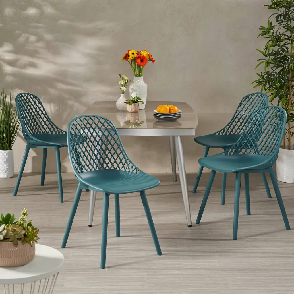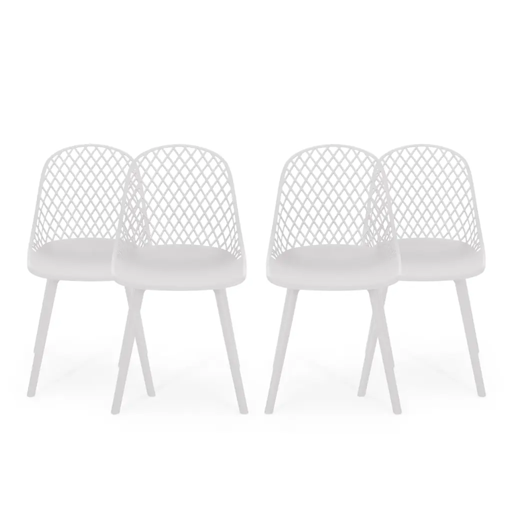 Perfect for indoors and outdoors alike, these chairs have a chic, modern style with outdoor resilience. These chairs are made of polypropylene resin, and they are resistant to the weather, sun, and more. This set of four chairs comes in your choice of color.Features: Dimensions: