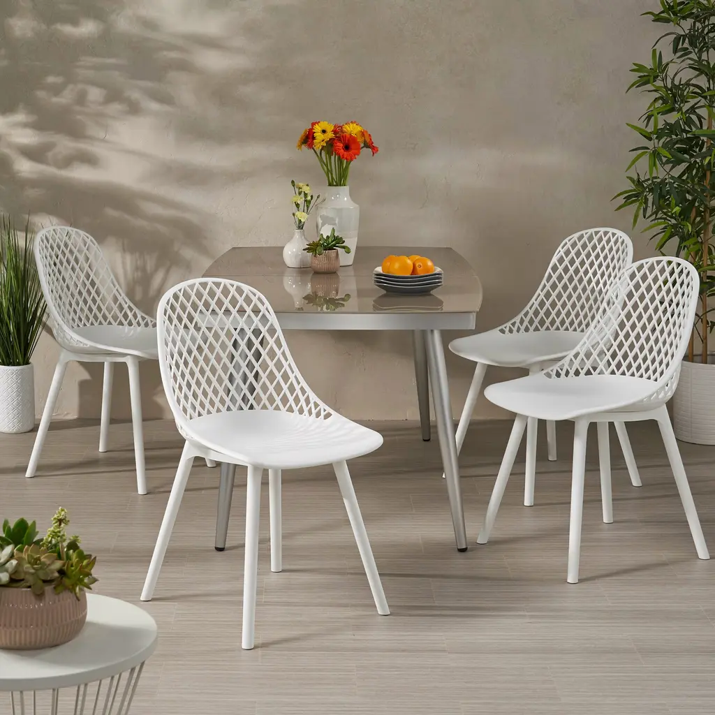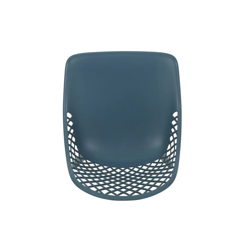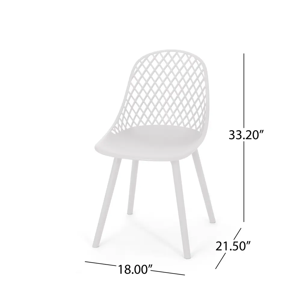 Perfect for indoors and outdoors alike, these chairs have a chic, modern style with outdoor resilience. These chairs are made of polypropylene resin, and they are resistant to the weather, sun, and more. This set of four chairs comes in your choice of color.Features: Dimensions: