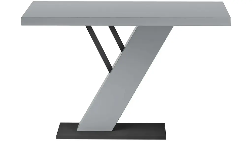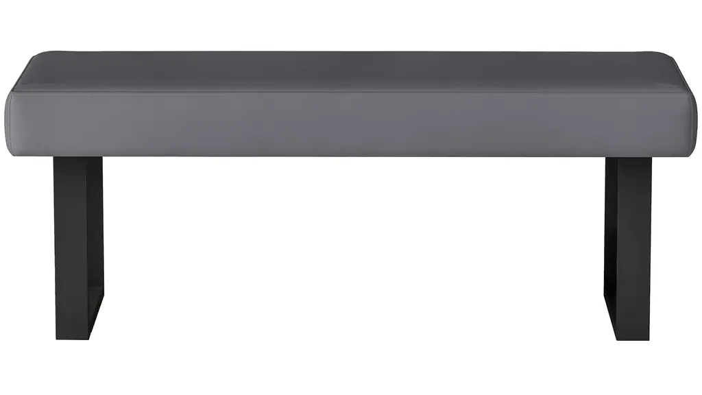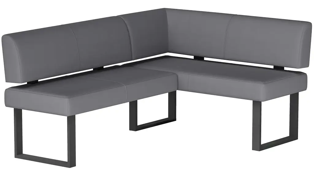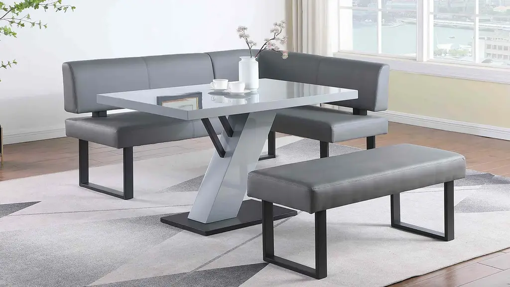 Linden 3-pc. Dining Set includes an all-wood gloss gray finished tabletop with a matching Y-shaped slant pedestal and a polished stainless-steel floorplate. The nook and bench are upholstered in a gray faux leather, mounted on a matte black finished steel base.
