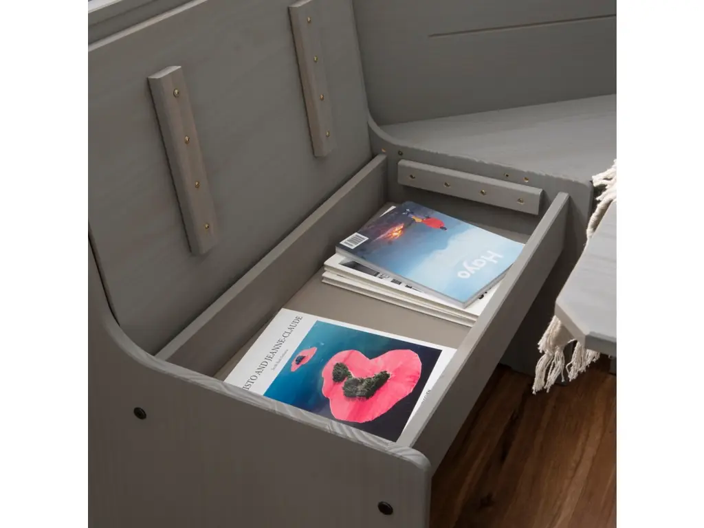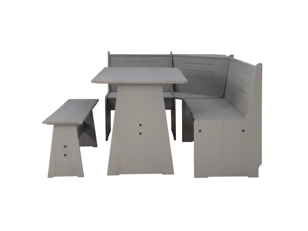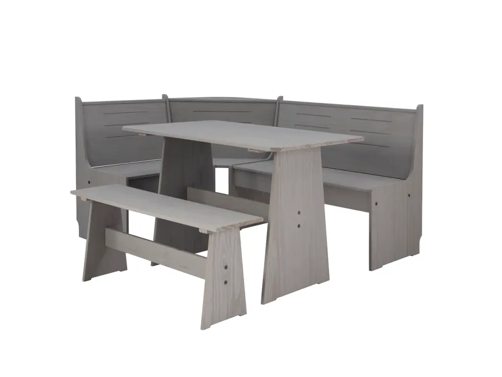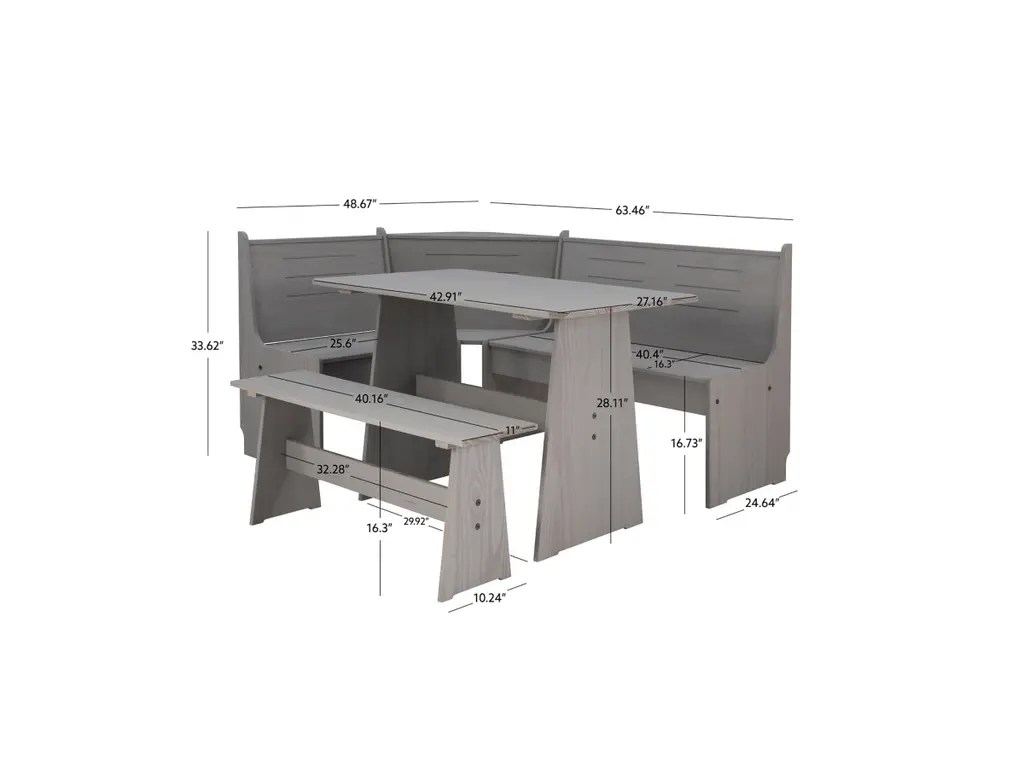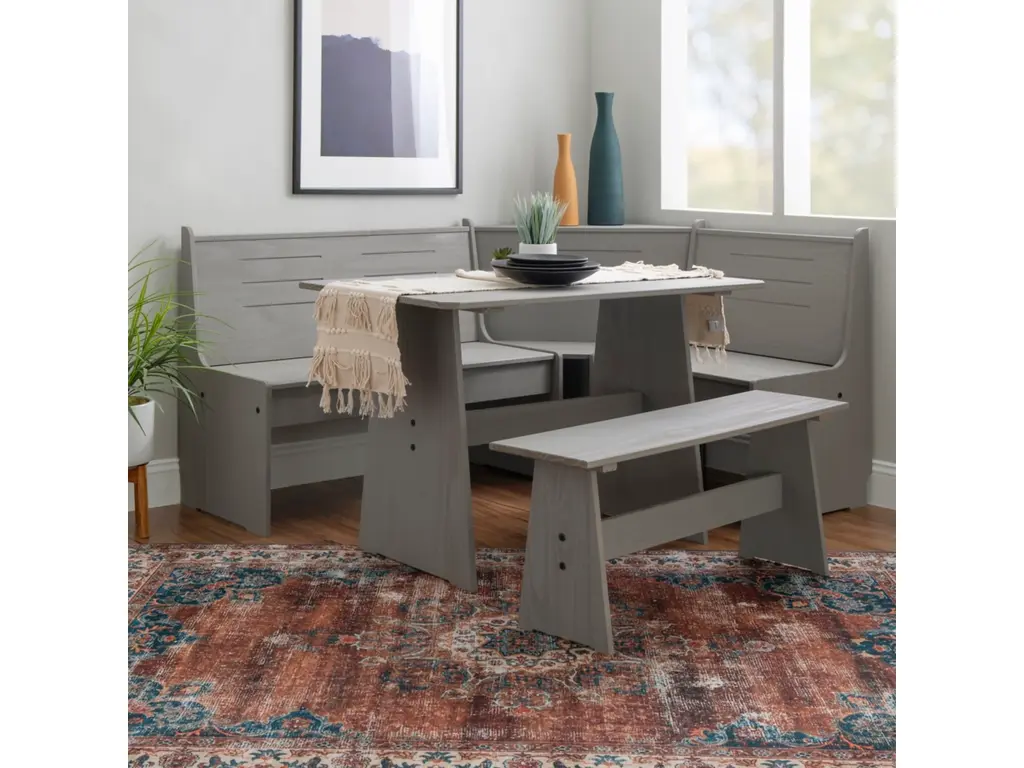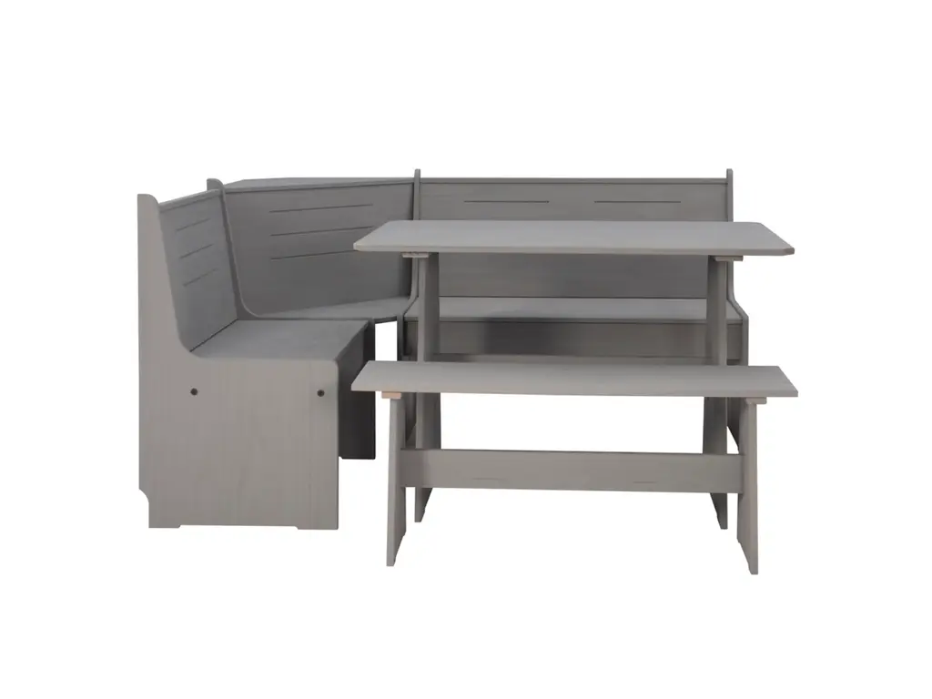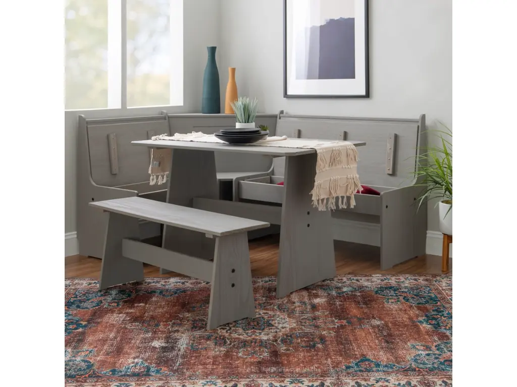 Create a warm and inviting place to start the day or enjoy a great meal together. The look of expensive built-ins, this stylized breakfast nook is built of solid pine and has a treated gray finish to bring out the natural grain of the wood. Can be assembled either direction to fit your space. The corner benches have a seat that flips open to a handy storage area. Comes with the table, bench and corner unit. For casual dining or as a great place to do homework or finish that project at home.