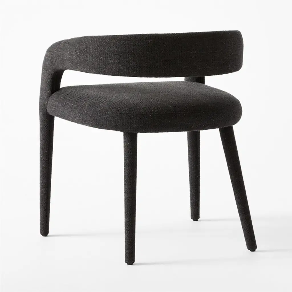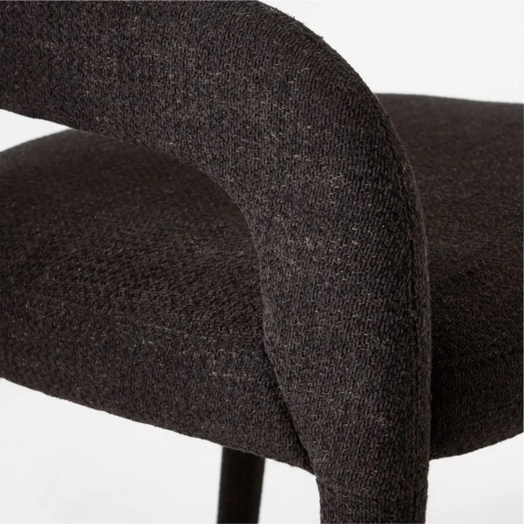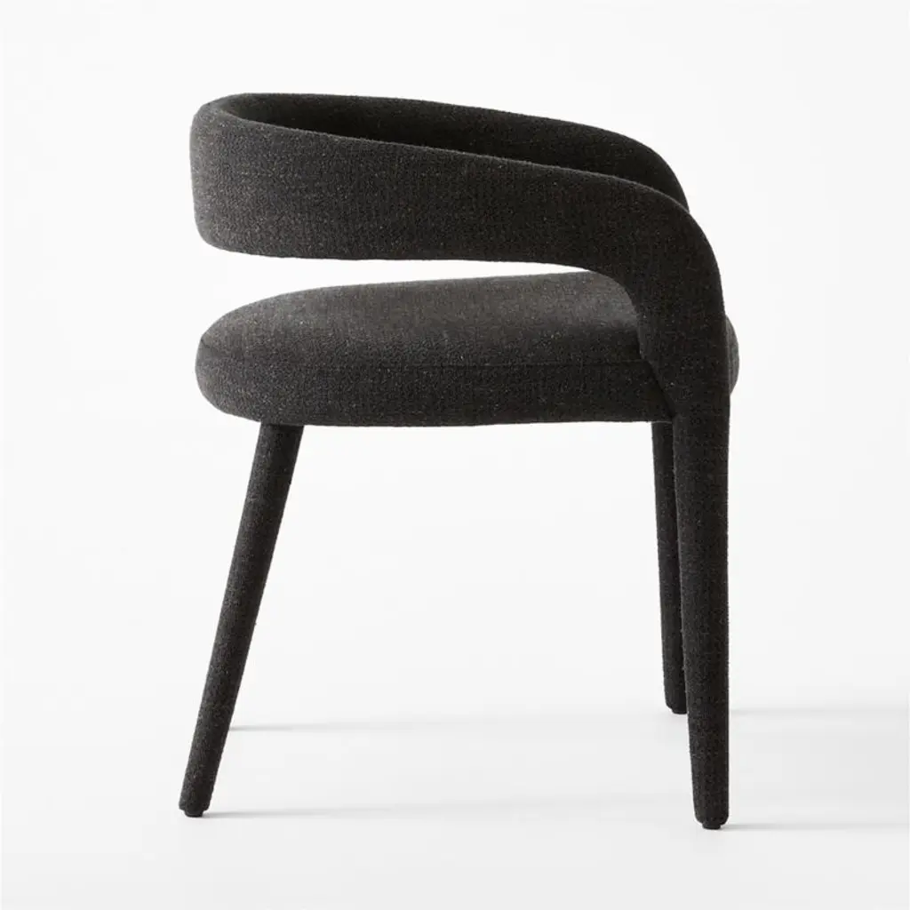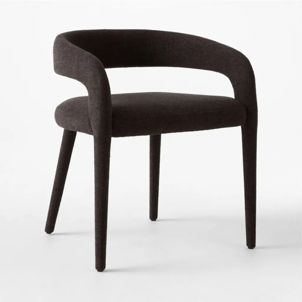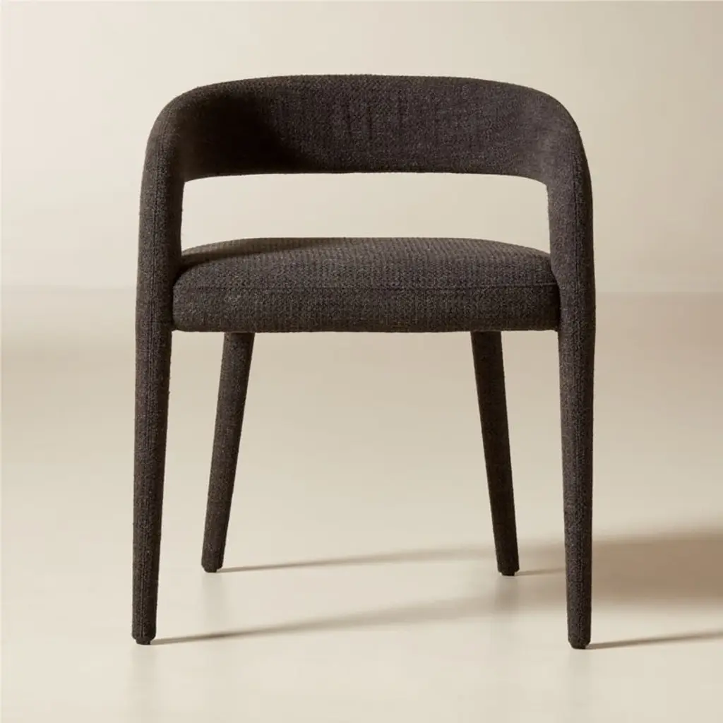 Designed by fashion-designer-turned-home-designer Brett Beldock, this sculptural dining armchair brings sophistication to any space. Updating the traditional barrel chair design, this fresh take is lighter and more open. Upholstered in a charcoal performance fabric. CB2 exclusive.