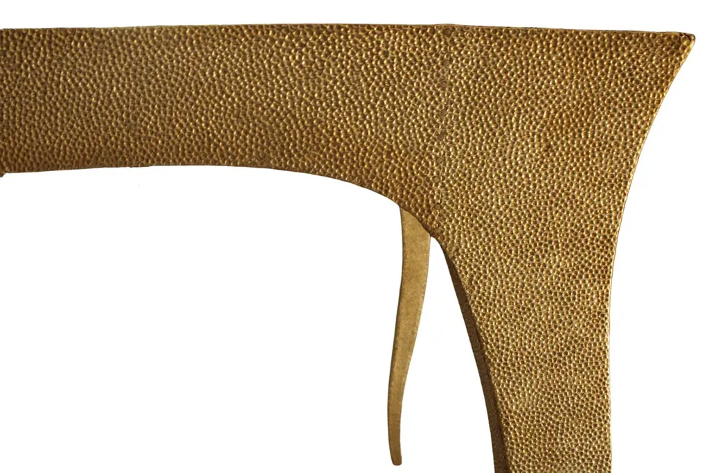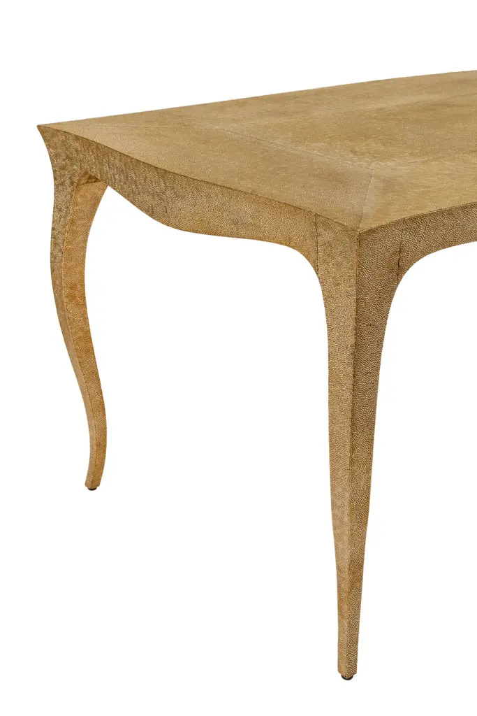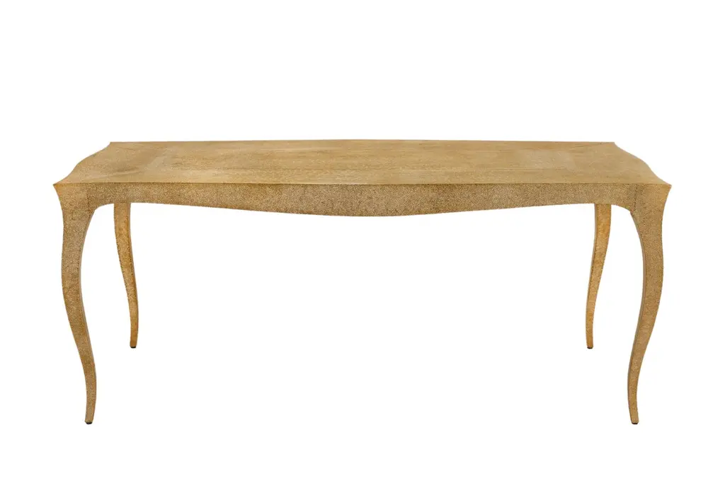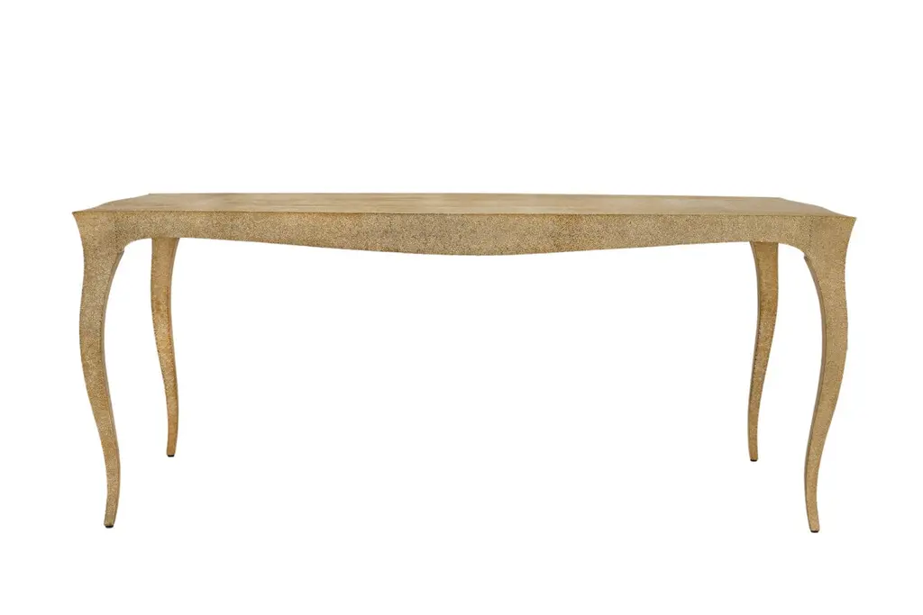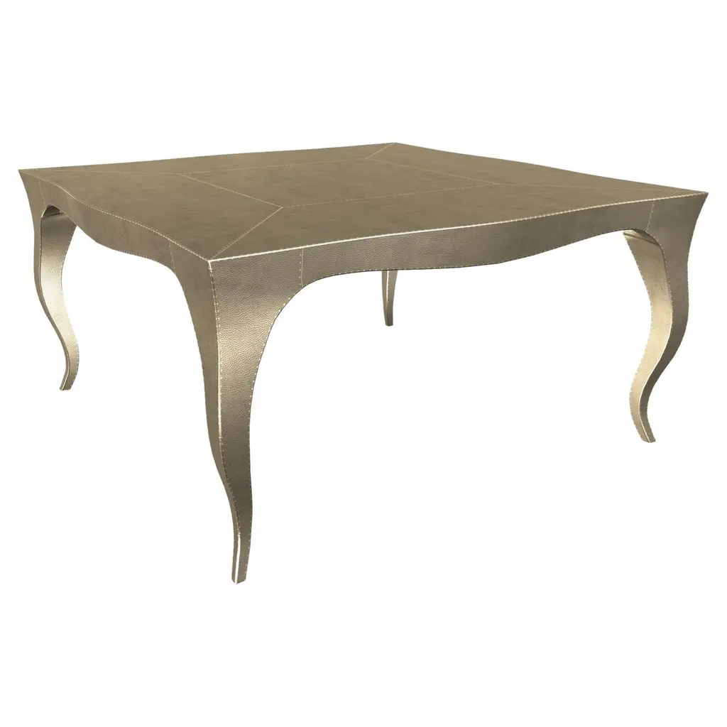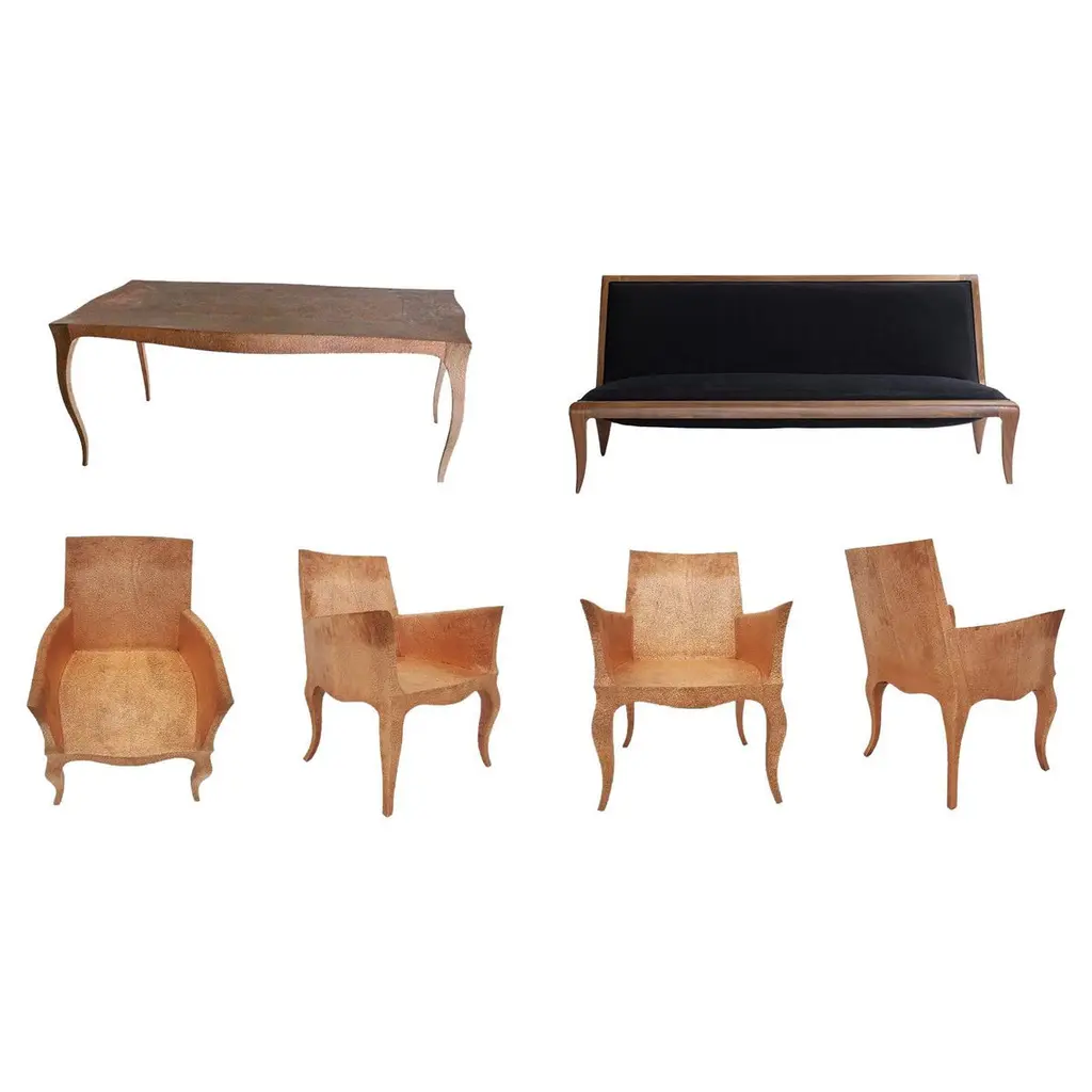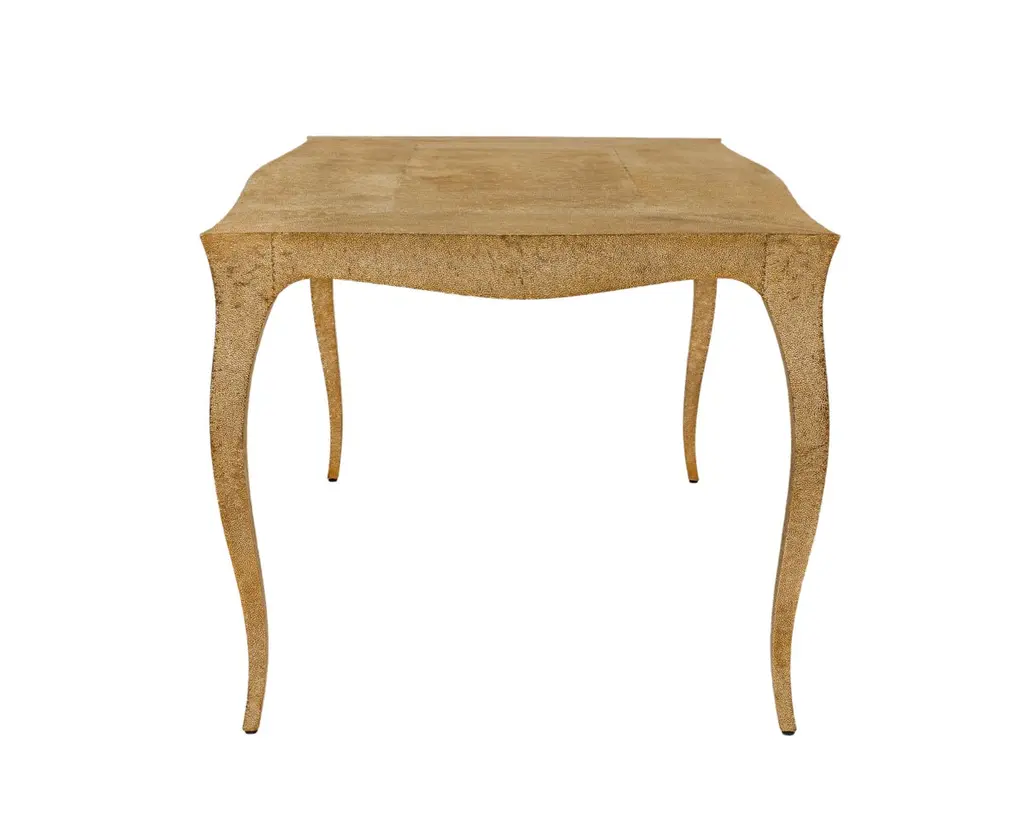 Dining room sets in Louis XV Style with a set of 4 chairs & a Louise Dining Room Table is designed by the renowned designer Paul Mathieu. He chose the name “Louise” when he created his more feminine version of Louis XV furniture and this Elegant Dining room sets. All items are medium Hammered brass clad over teak wood.The curved legs and side rails of this exceptionally elegant table are hand carved from solid pieces of teak. Pattern makers trace and cut complex forms that will cover the table from thick sheets of copper or silver. Once the table is joined together, it is meticulously encased in a tight-fitting skin of copper or purest silver. The silver used was assayed at 96% purity, which exceeds the minimum standard for sterling of 92.5%. Available options for the metal skins are White Bronze, Antiqued Bronze, Brass, Silver and Copper. Both silver and copper will tarnish over time. Regular non-abrasive household metal polishes can be used to restore the original finish.Dining Room Table Sets includeLouise Dining Table Size- 72"x36"x30"H.Materials - Hammered Brass Clad Over Teak WoodSet of 4 Louise Club chairs Size- 26" x 27" x 33" Materials - Hammered Brass Clad Over Teak WoodPlease note that moisture in air, sudden change in temperature and natural movement of wood over time causes the metal to wrinkle or bubble up. We use well seasoned, reclaimed teak and high quality marine grade MDF (wherever technically possible) to avoid and delay the above mentioned changes. However a perfect stability of metal cannot be guaranteed. Please note that our smooth finish metal clad pieces will have some unavoidable tool marks. This is proof that everything is done by hand. The smooth finish will not come out like a machine made perfect surface and the master artisan will do their best to make it look as good/clean/stable/perfect as he possibly can.Our hammered finishes are a much safer option if the tool mark scratches are unacceptable. The hammered finishes are also safer against eventual bubbling/wrinkles due to natural forces as mentioned above.We would love to send you some samples before order confirmation so that the finish can be judged and experienced first hand.
