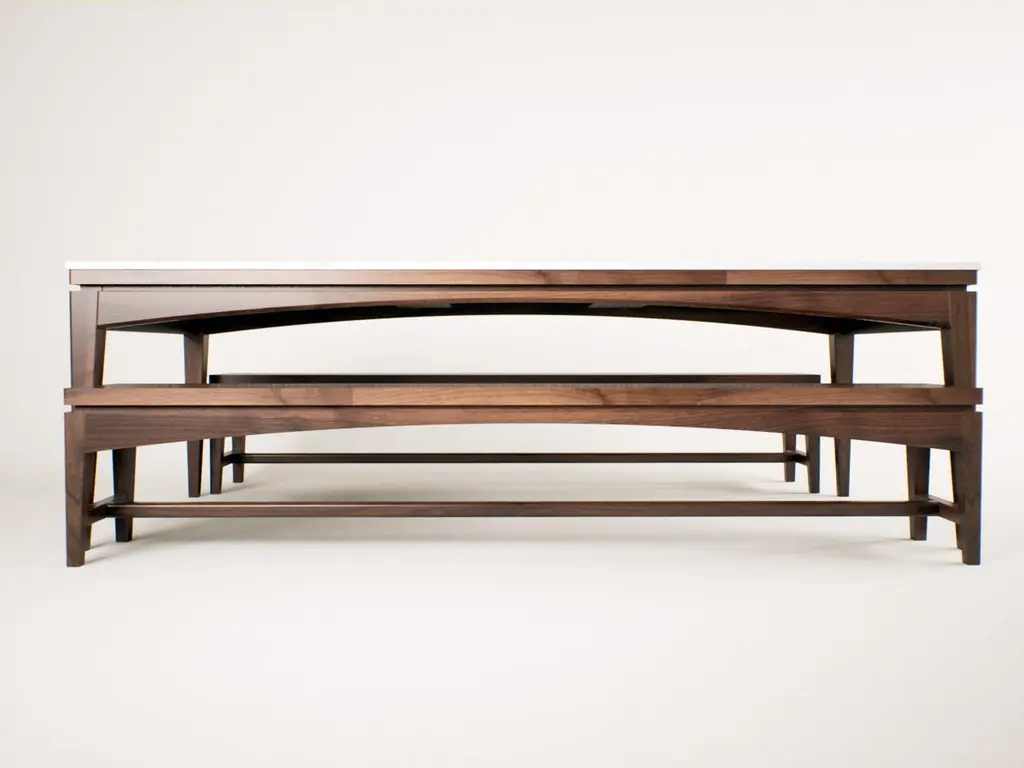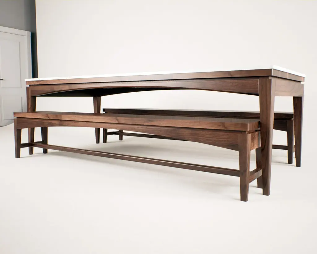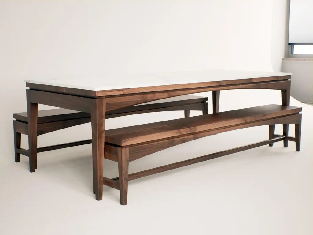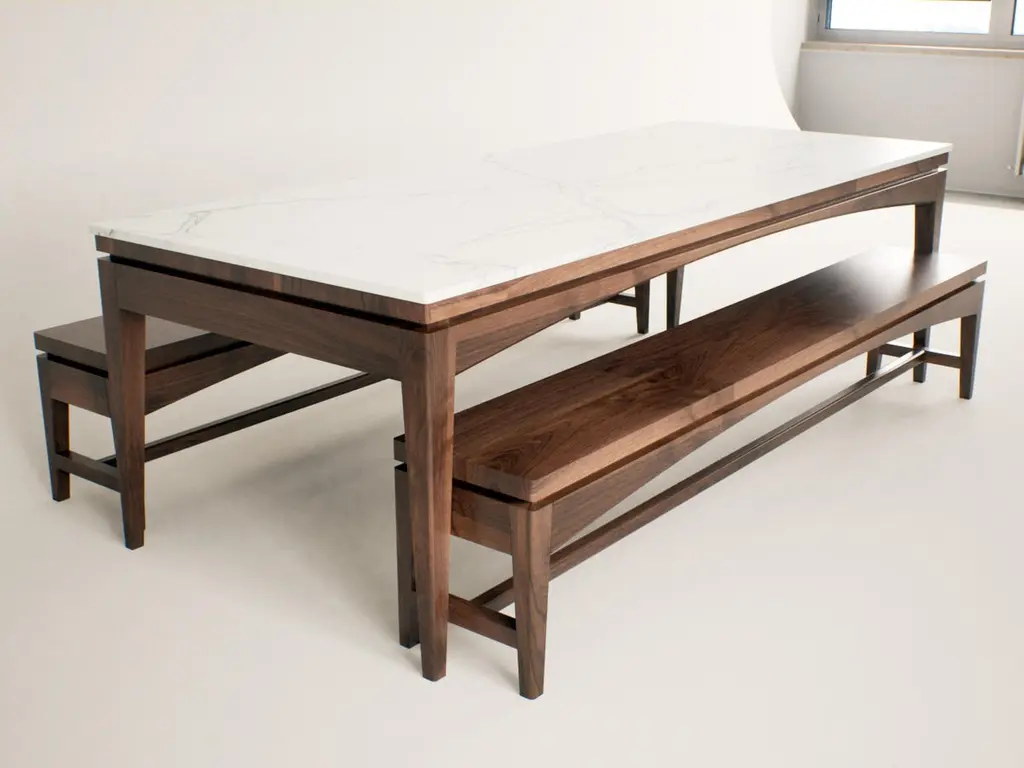White Porcelain Dining Table Set with Matching Benches – Custom Handmade Furniture for Modern InteriorsA contemporary statement in form and function, this white porcelain dining table set with benches is a minimalist composition designed for modern living. Featuring a stone-look porcelain tabletop and a sculptural solid wood base, it’s the ideal union of elegance, durability, and craftsmanship.The table’s top is crafted from high-performance white porcelain with soft veining, evoking the luxury of natural marble while offering exceptional resistance to heat, scratches, and stains. Its surface is both tactile and refined—perfect for daily meals or formal gatherings. The sleek edges and soft matte finish reflect a modern aesthetic rooted in timeless materials.Paired with matching handcrafted benches, this dining set offers a cohesive and architectural look. The bench seats are made from the same solid American walnut as the table’s base, ensuring a harmonious material palette. Their understated design allows the porcelain surface to take center stage, while still providing generous and comfortable seating.Ideal for design-forward homes, open-plan layouts, or dining rooms where every detail matters, this porcelain and wood dining set adds warmth, sophistication, and functionality in equal measure.Key features: – White porcelain top dining table with subtle veining (stone or marble look) – Solid wood base and matching handcrafted benches – Resistant to heat, scratches, stains, and everyday wear – Custom dimensions, stone and wood finishes available upon request – Minimalist, sculptural design for modern dining spaces – Handmade to order with attention to every detailDesigned for those who appreciate honest materials and clean lines, this dining set blends innovation with tradition, practicality with poetry.