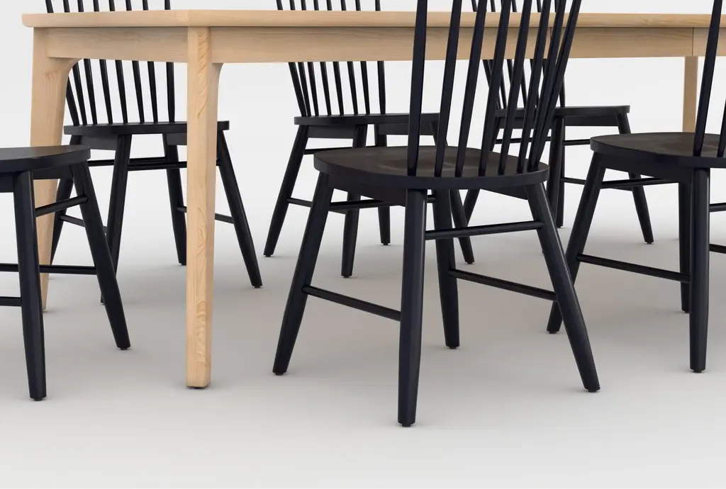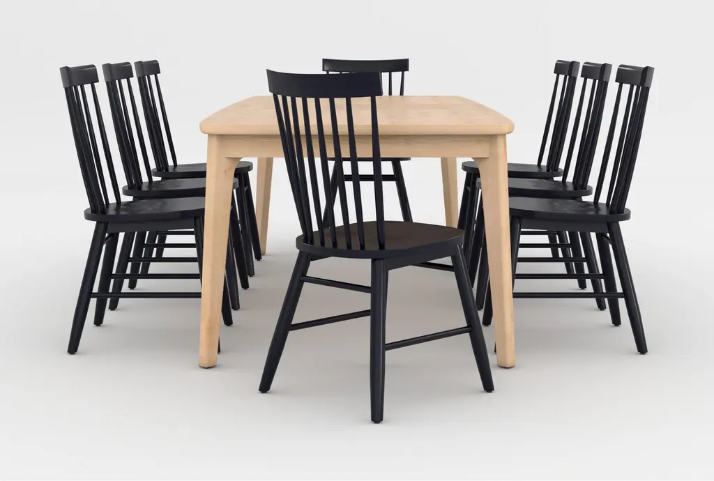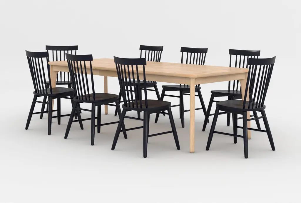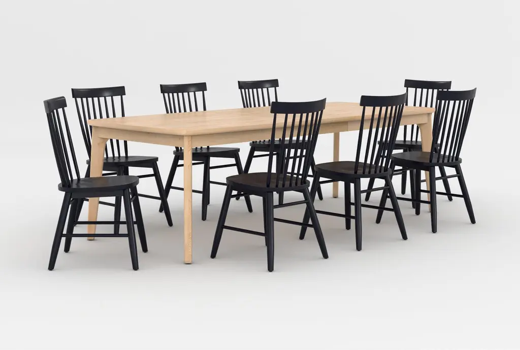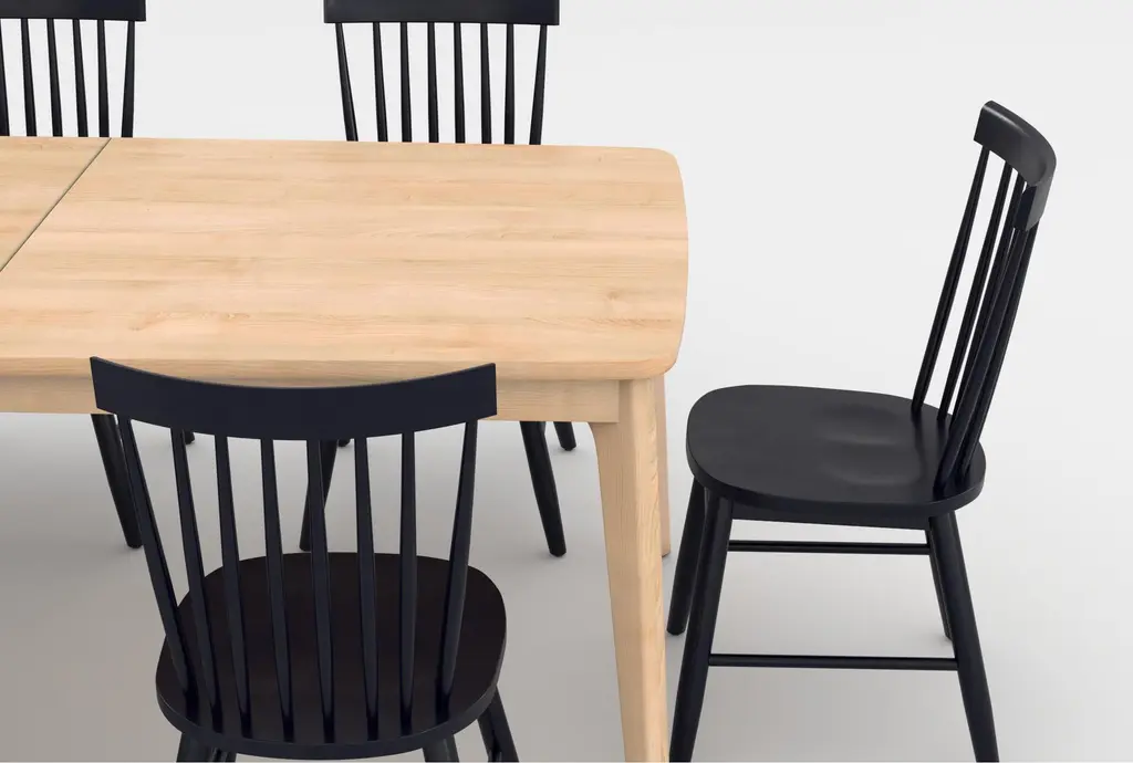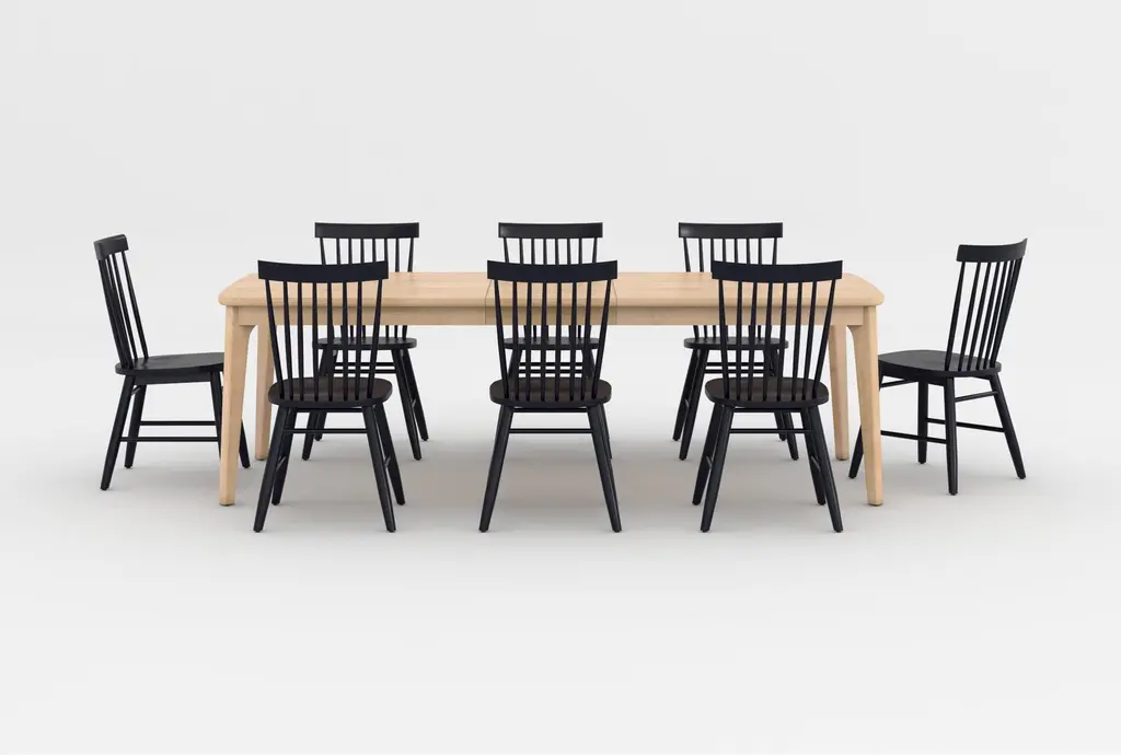 Rooted in Japanese and Scandinavian "Japandi” design, the Mariko extension dining table was developed by Living Spaces as a part of a whole-home collection that brings simplicity, functionality and natural beauty to your space. Distinctive materials - including solid birch and ash veneer - enrich and add character to the piece. Tapered legs that sit at an angle complete the look, which offers mid-century modern elements, while an 18” extension leaf provides more room for guests to join the party. The Renn Black dining chair pairs perfectly.
