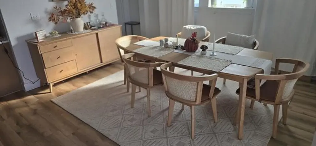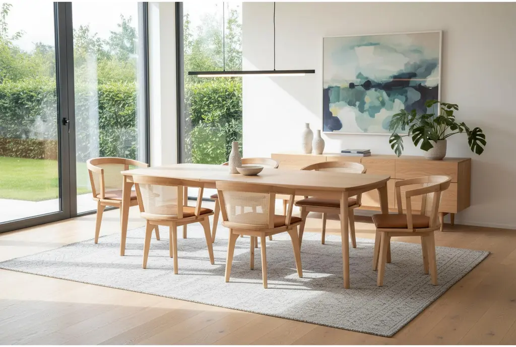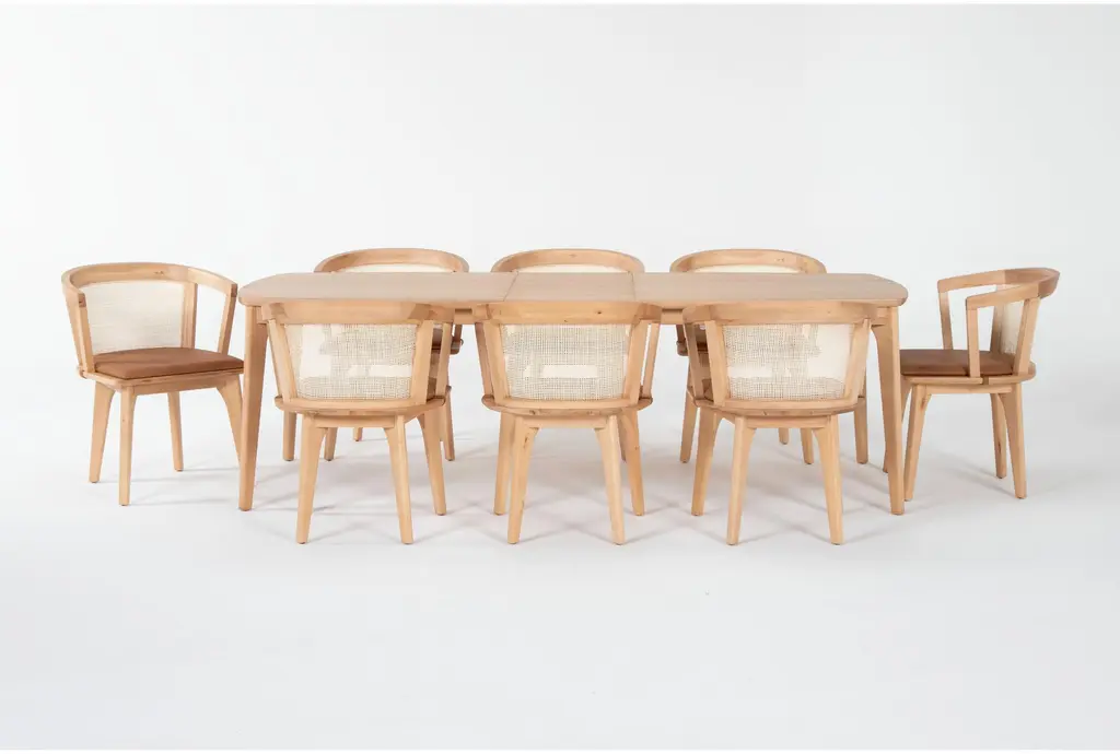 Rooted in Japanese and Scandinavian "Japandi” design, the Mariko dining set was developed by Living Spaces as a part of a whole-home collection that brings simplicity, functionality and natural beauty to your space. Mixed materials - including solid birch, ash veneer, faux leather and raw natural rattan that patinas and darkens over time - enrich and add character to the pieces. Tapered legs that sit at an angle complete the look, which offers mid-century modern elements. The extension dining table features an 18” leaf that provides enough room for more guests to join the party.