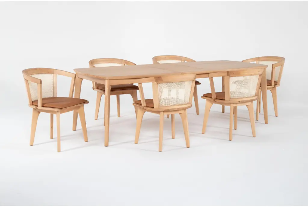 Mariko Natural Rectangular Wood 78-96" Extendable Dining Table Faux Leather With Armchair Set For 6 | Birch