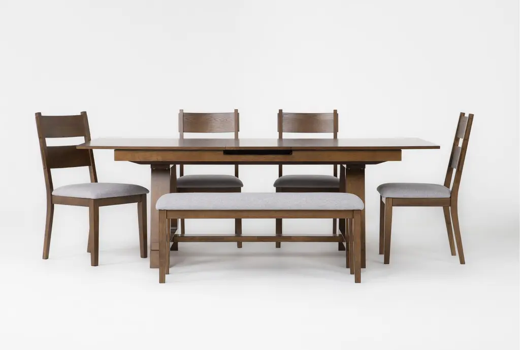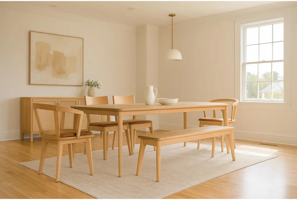 Mariko Natural Rectangular Wood 78-96" Extendable Dining Table With Faux Leather Bench Side Chair + Armchair Set For 6 | Birch